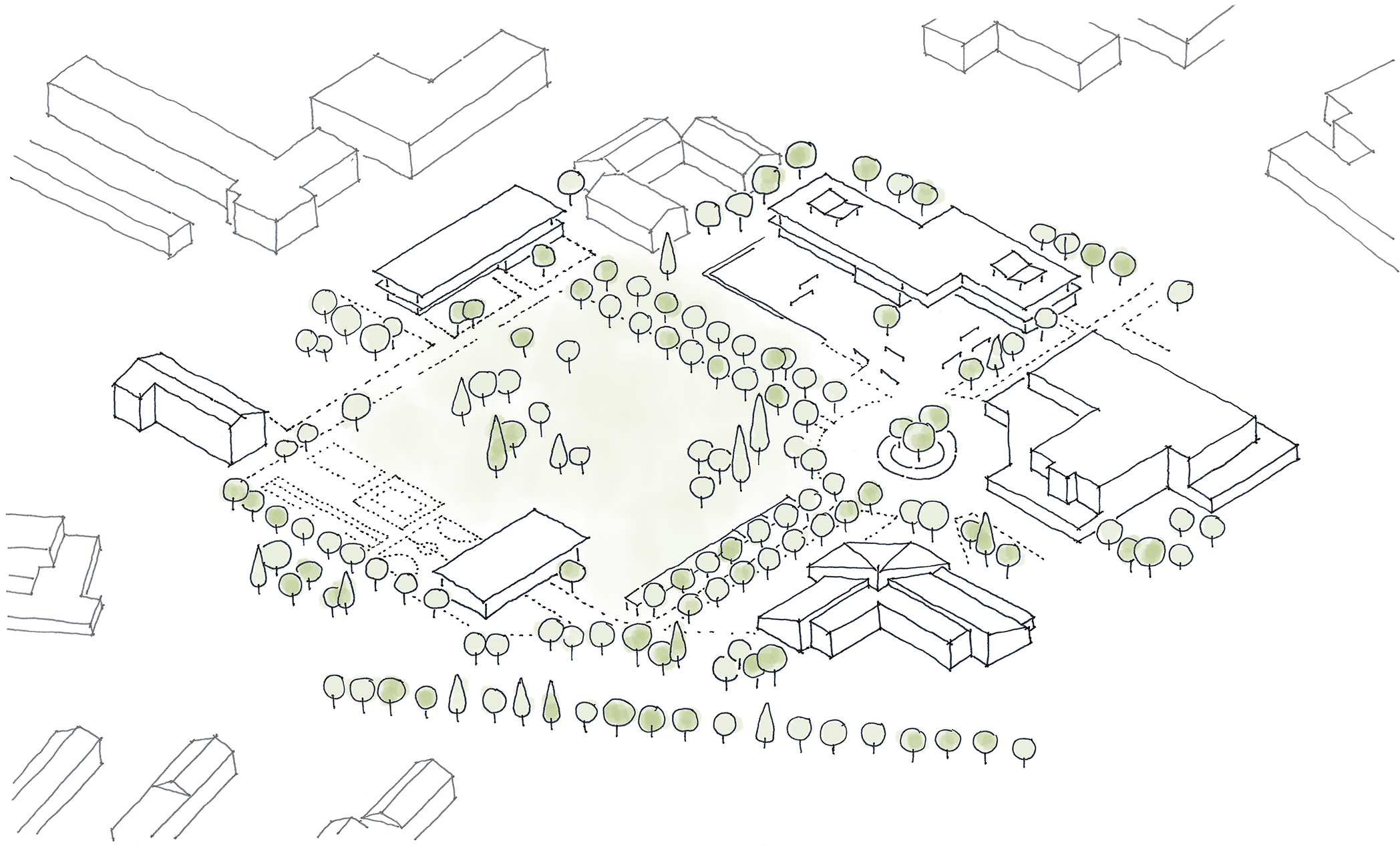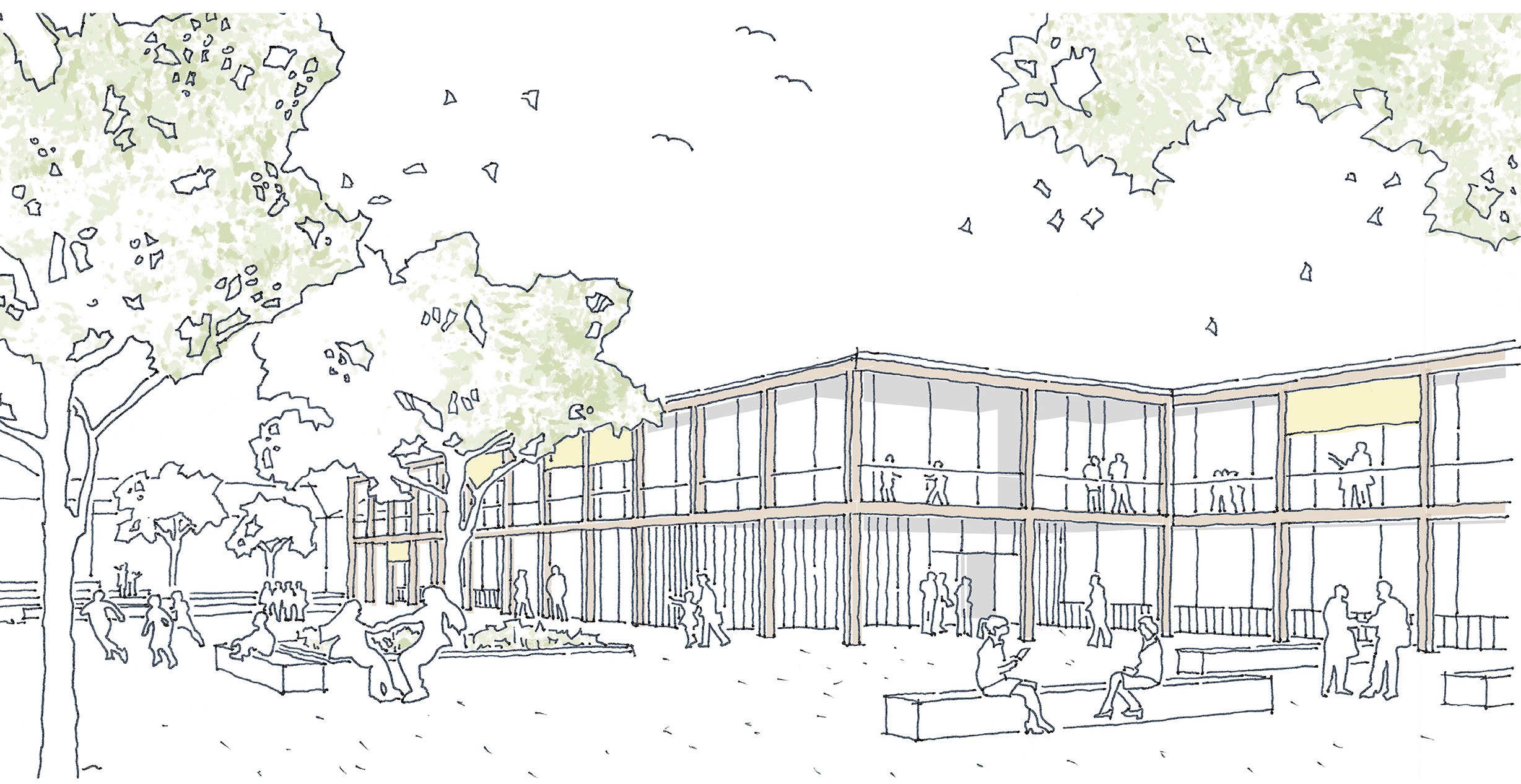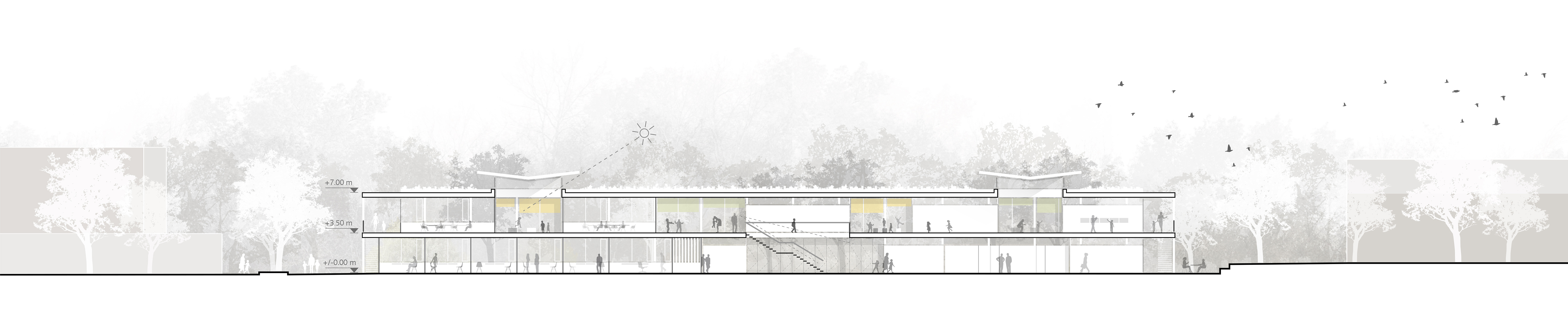 Der Gebäudebestand wird von einer Vielzahl verstreut im Gelände liegender Bauten gekennzeichnet, die zum Teil deutliche Charakterunterschiede aufweisen. Nach Rückbau verbleiben die „Neue Schule“, die Mensa und das Haus 4 auf dem Wettbewerbsgelände. Die neue Grundschule, das Internat und die Sporthalle werden so auf dem weitläufigen Gelände verortet, dass sie im Zusammenspiel mit den Bestandsgebäuden einen zentralen Freiraum generieren: den Campus. Die drei zweigeschossigen, pavillonartigen Neubauten bilden aufgrund ihrer Setzung und Materialisierung ein Gebäudeensemble, das durch Blick- und Wegebeziehungen miteinander verbunden ist.