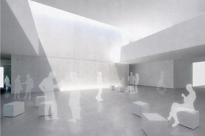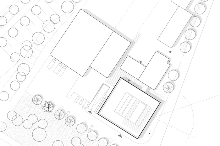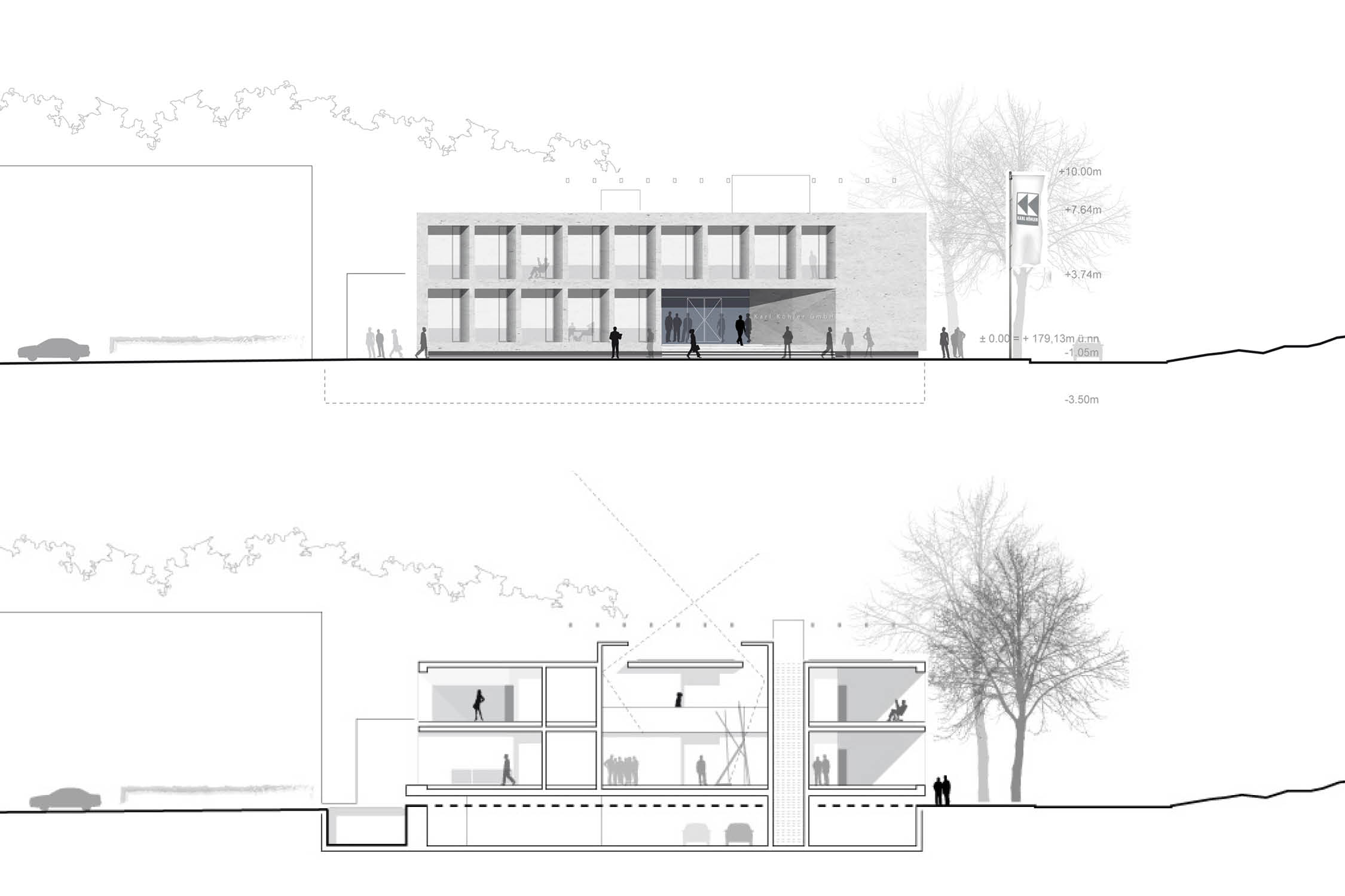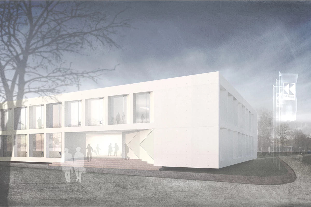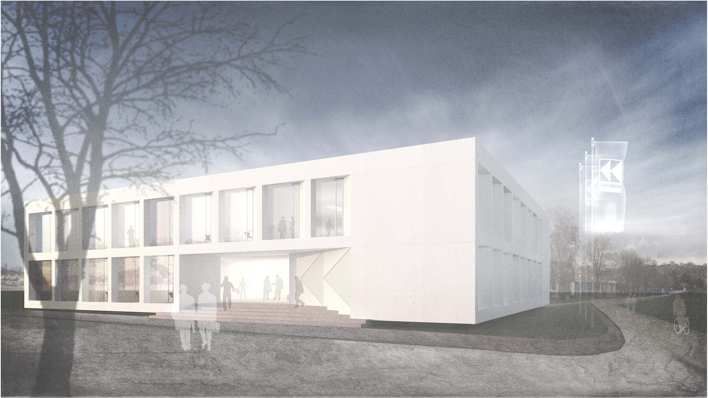 Der pavillonartige Neubau - ein klarer, in sich ruhender, zweigeschossiger Baukörper aus Sichtbeton – orientiert sich mit seiner Höhenentwicklung am Bestandsgebäude und ist mit diesem durch einen verglasten Steg verbunden. Somit sind optimale Büroabläufe und kurze Wege gewährleistet. Eine zentrale, zweigeschossige Halle bildet den Mittelpunkt des Gebäudes. Sie ist Treffpunkt und Veranstaltungsort. Zwei innenliegende Stahlbetonkerne bilden die infrastrukturelle und statische Basis. Sie werden über außenliegende Stahlbetonstützen und -scheiben ergänzt. Dieses Konstruktionsprinzip ermöglicht die komplette Stützenfreiheit des Innenraumes und damit ein Höchstmaß an Flexibilität.