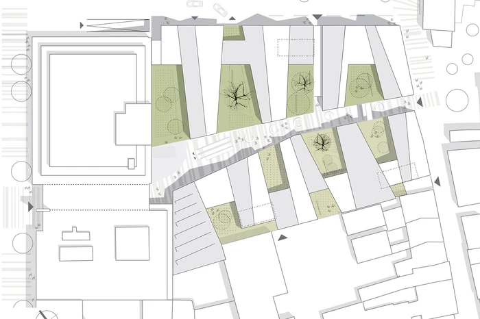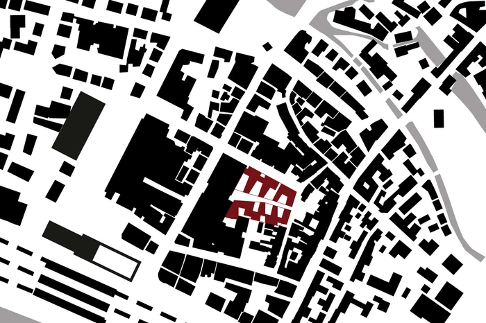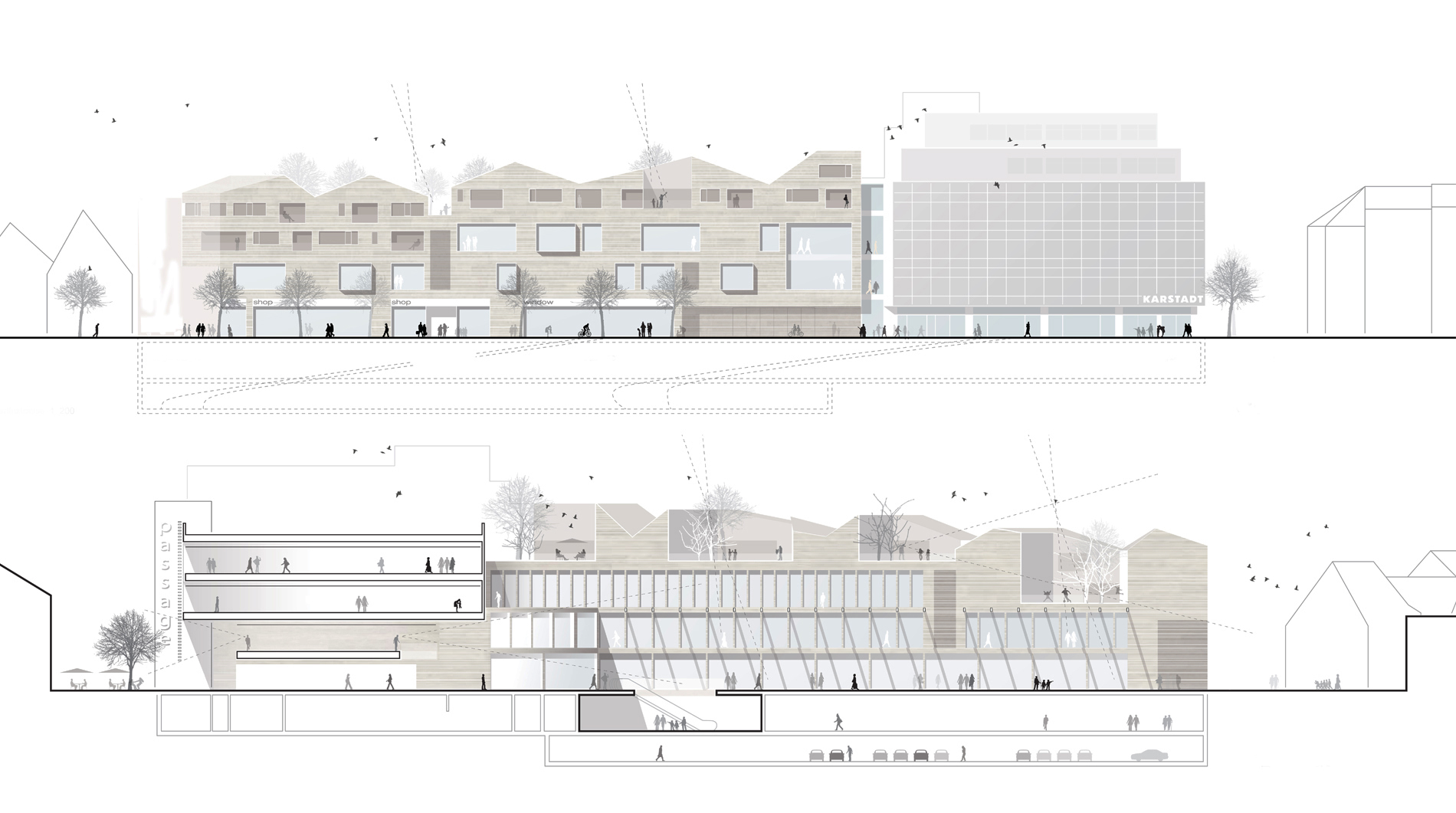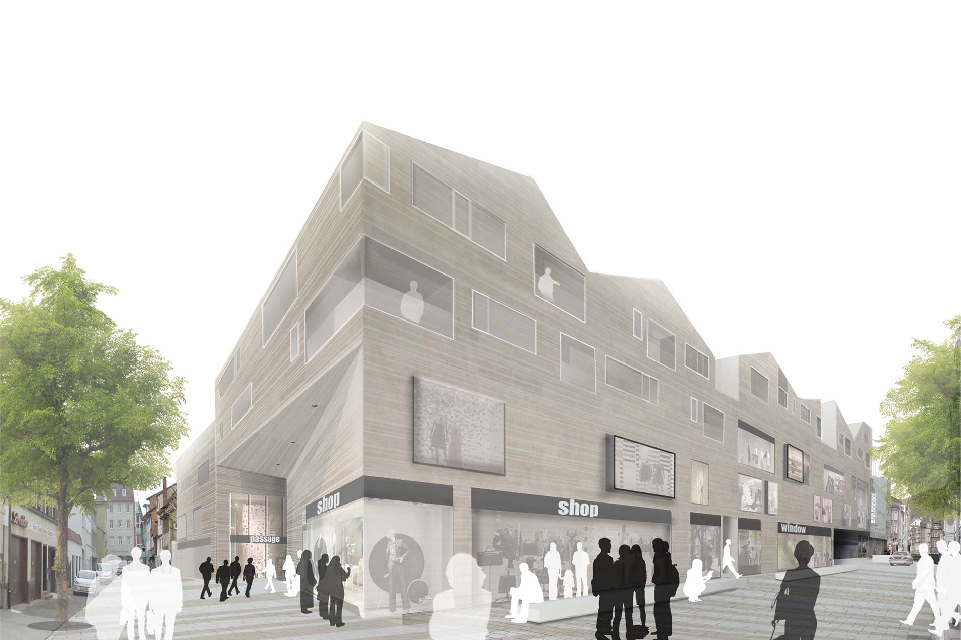 Das in einem traditionellen, städtischen Kontext eingebettete Projekt steht im direkten Dialog mit seiner Umgebung. Das Gefüge von gebauten Volumina und „Leer“-Räumen bestimmt das städtische Erscheinungsbild. Der Gebäudekomplex des Karstadt-Areals grenzt auf der einen Seite an die historische, kleinteilige, von Satteldächern geprägte Altstadt von Esslingen. Auf der anderen Seite liegen die großvolumigen 60er-Jahre Bauten der Bahnhofstraße mit Flachdächern und glatten Fassaden. Der Entwurf reagiert auf die vorhandene städtische Struktur mit einer angemessenen baulichen Körnung und einer engen Verzahnung mit dem historischen Stadtgefüge. Die entwickelte „Dach-Landschaft“ schafft ein ausgewogenes Verhältnis zwischen Außen- und Innenräumen. Die diagonal über das Grundstück verlaufende Einkaufspassage teilt das Areal. Läden und Einkaufsbereiche bestimmen Erd- und Obergeschosse. Darüber befinden sich die Wohnetagen. Die Sockelgeschosse verbinden den Stadtraum mit den Wohnhäusern und schaffen zugleich eine angemessene Distanz zwischen Öffentlichkeit und Privatheit. Das gut proportionierte Gesamtbild und das Zusammenspiel von Altstadt und Neubebauung erhöht die soziale und kulturelle Akzeptanz des Projektes.