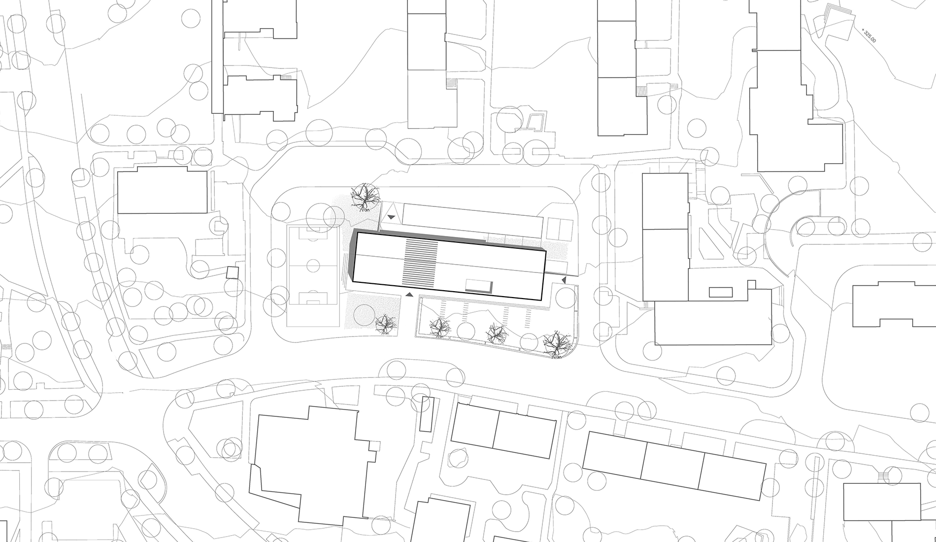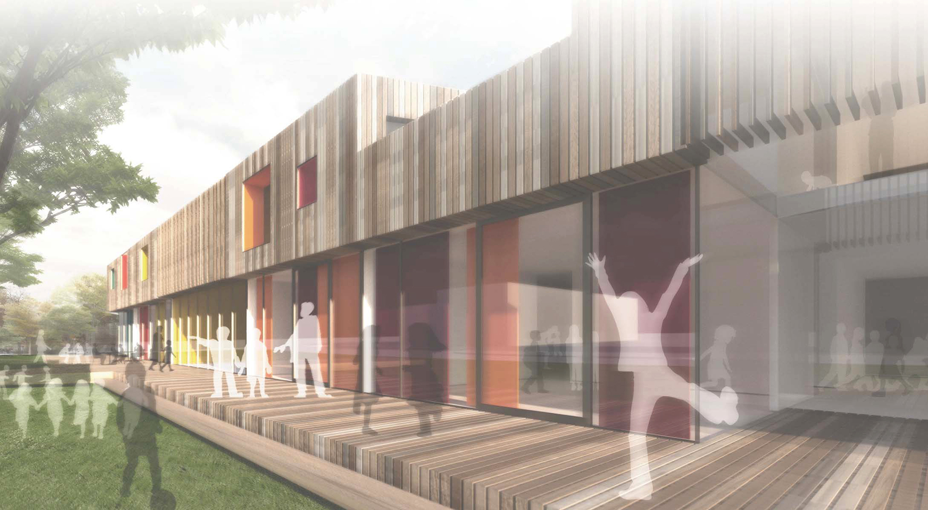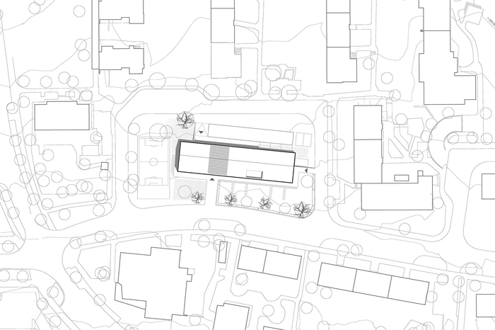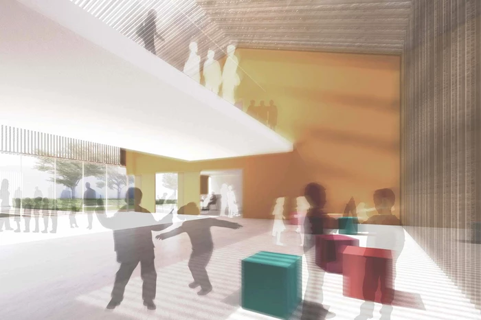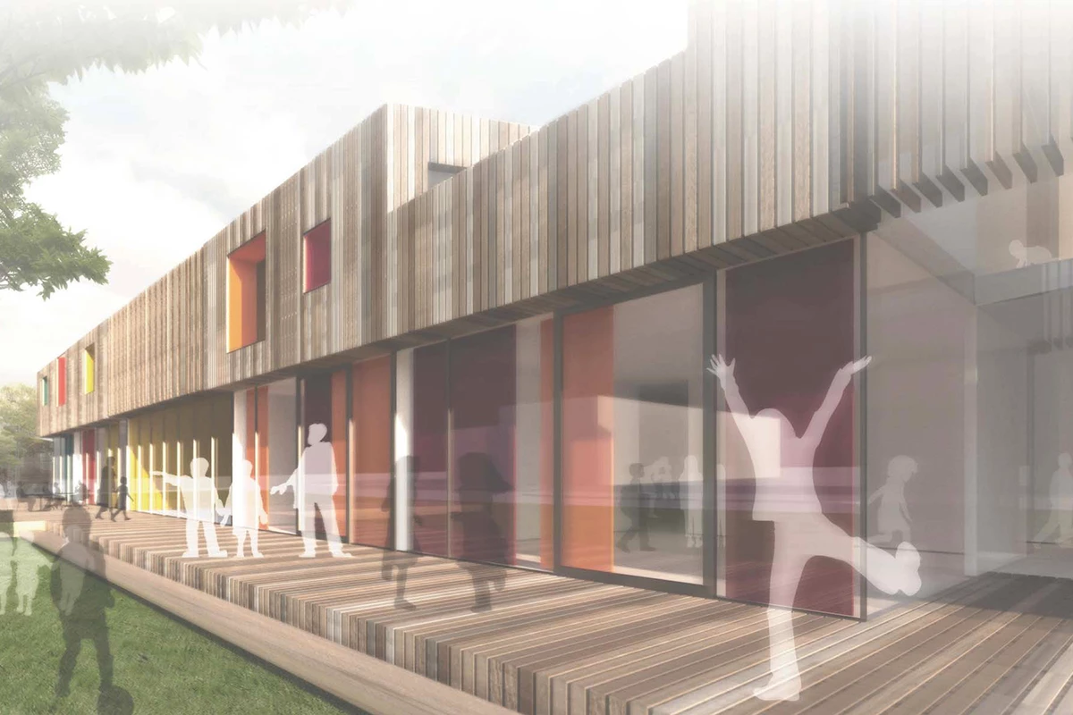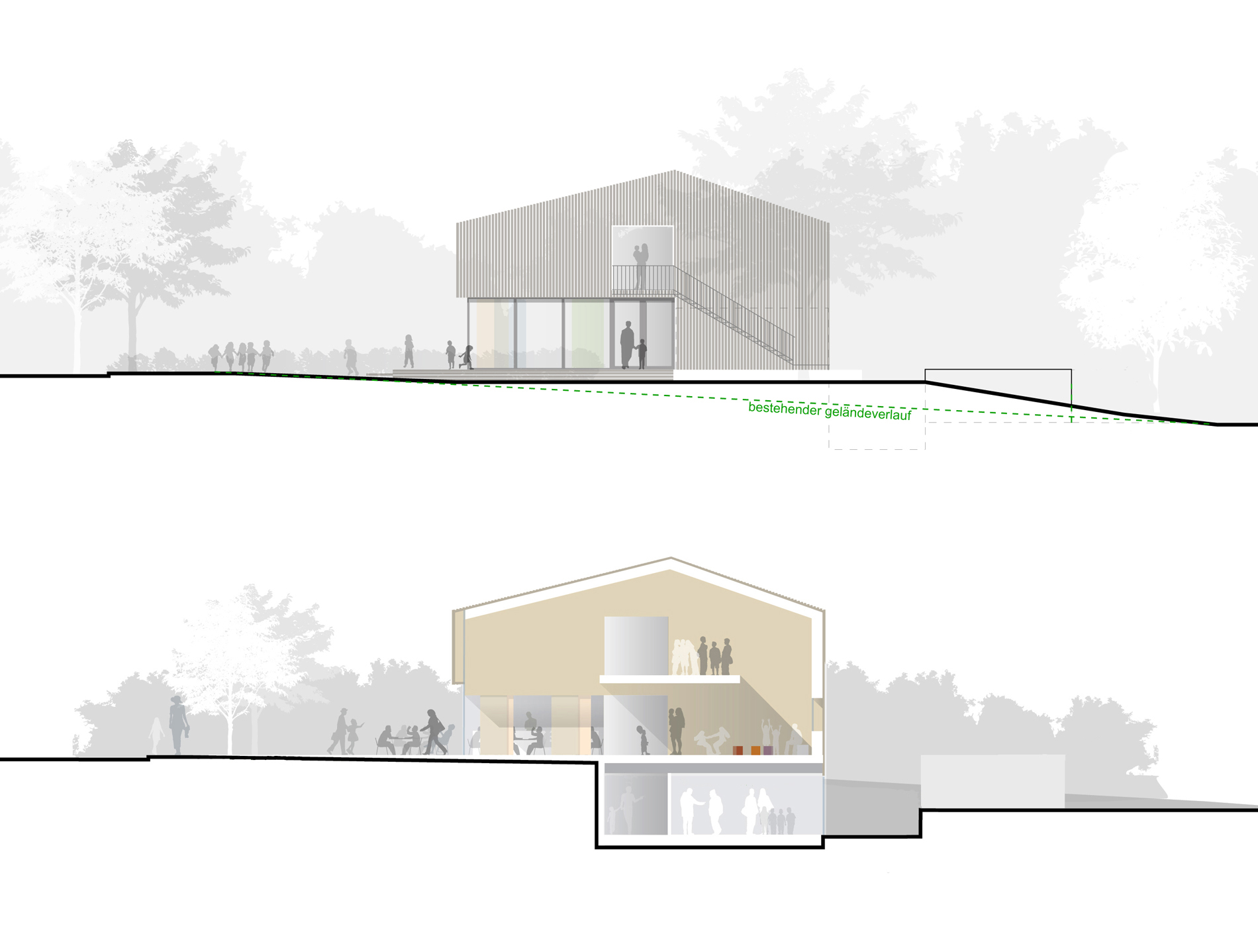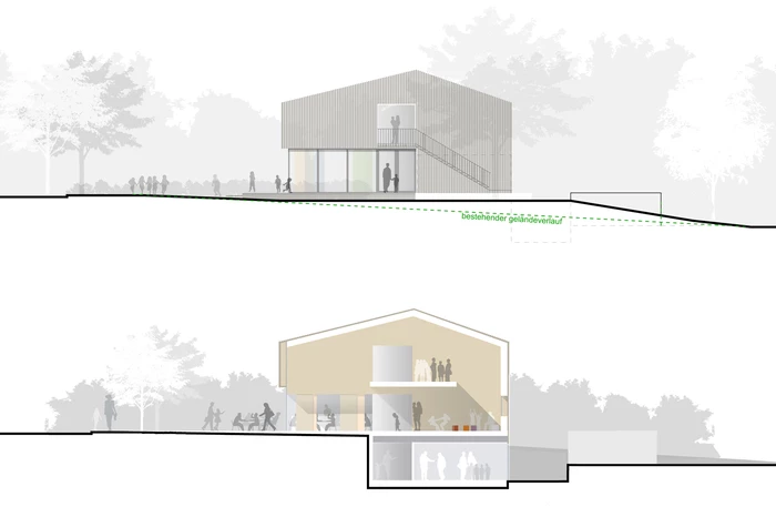 Das zukünftige Kinder- und Jugendhaus soll die Stadtteilidentität fördern. Ziel ist es einen Ort zu schaffen, der den Austausch und die Kommunikation unterschiedlicher Gruppierungen unkompliziert ermöglicht. Der Geländeverlauf des Grundstücks fällt von Süden nach Norden um circa 2 bis 2,5 Meter ab und ermöglicht unterschiedliche Gebäudehöhen. Der Neubau ist als kompaktes, einfaches und klar gegliedertes Haus konzipiert, das sich Dieser teilt sich in drei Bereiche aufteilt: dem Jugendhaus im Westen, der Kindertagesstätte im Osten und dem Mehrzwecksaal als verbindendes Element in der Mitte. Durch die konsequente räumliche Trennung von Kindertagesstätte und Jugendhaus werden akustische Störungen im unterschiedlichen Tagesablauf vermieden. Die zukünftigen Gruppenräume öffnen sich großzügig zum Grünbereich hin.