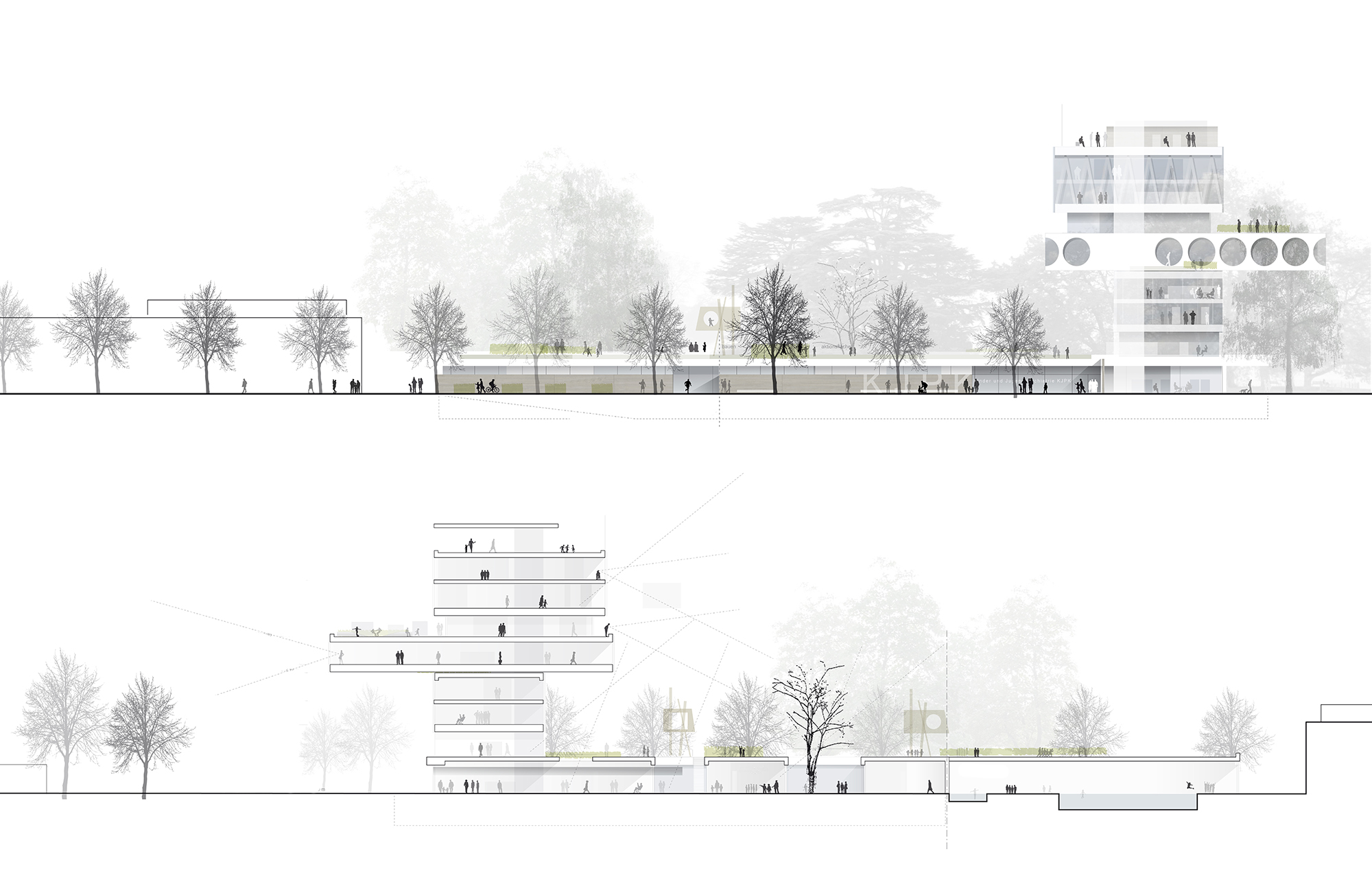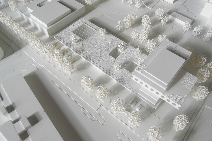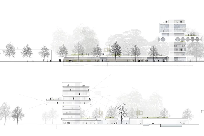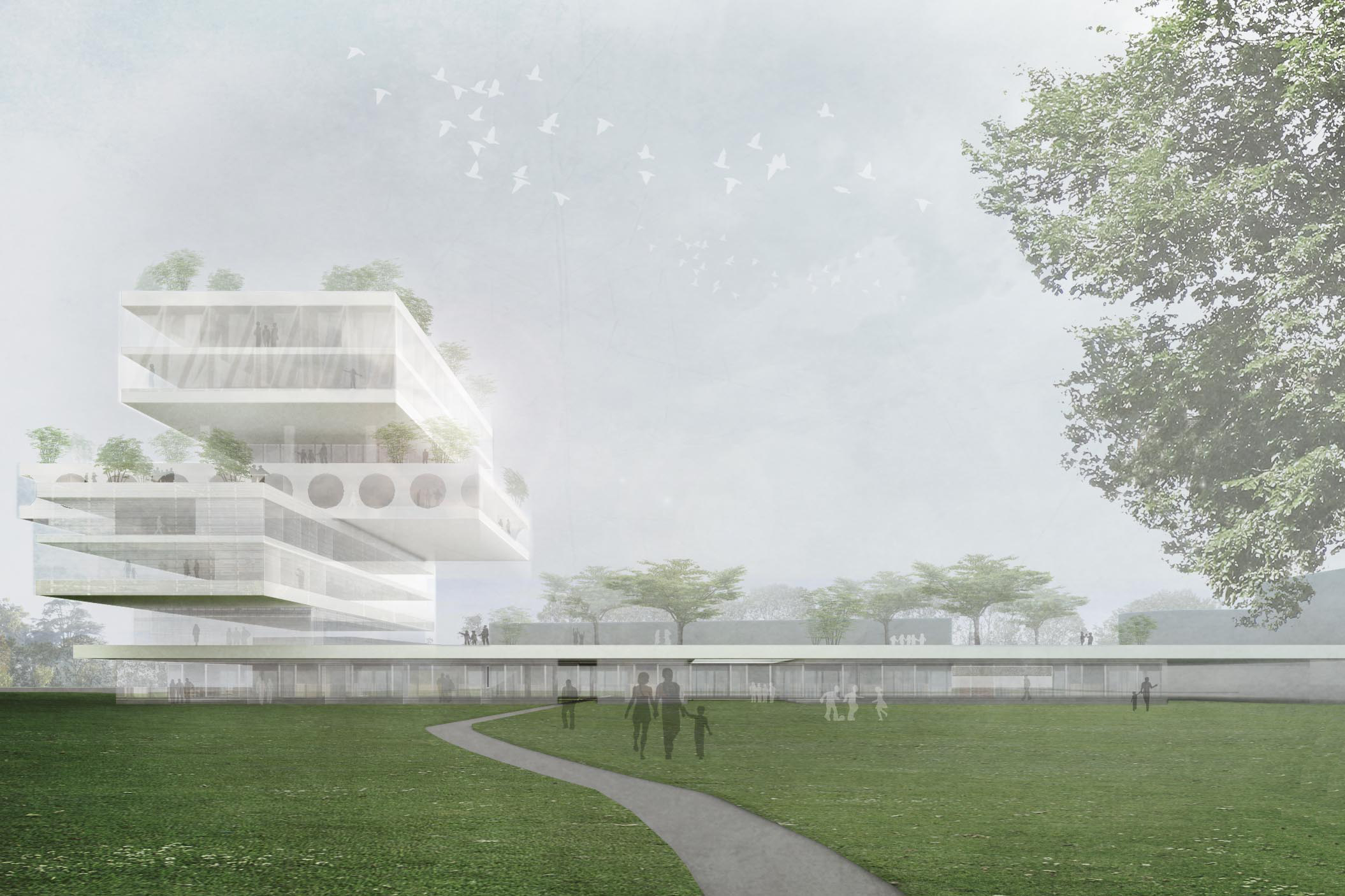 Die Idee, sieben Standorte zu einem zu verbinden, hat uns fasziniert und inspiriert. Wie kann man es schaffen, autarke, individuelle, liebgewonnene Situationen mit den Bedingungen eines zentralen Standortes zu verschmelzen und dabei positive Synergien zu erlangen? Für uns lautet die Lösung – „die Häuser im Haus“. Der Charakter des Individuellen bleibt erhalten, ohne den Gedanken der Gemeinschaft zu vernachlässigen. Selbstbewusst werden die einzelnen Bereiche in der Vertikalen übereinander organisiert. Durch ihr versetztes Stapeln entstehen qualitätsvolle Außenräume. Sie bilden individuell geschützte Dachterrassen. Jede hat ihre eigene Orientierung und ihre besonderen Qualitäten. Betrachtet man den Gebäudeaufbau von unten nach oben, erkennt man die zunehmende Privatheit. Man ist für sich und empfindet sich trotzdem als Teil des Ganzen. Der Blick ist nicht eingeschränkt und reduziert auf ein kleines Umfeld. Der Bezug zur Stadt und dem Leben außerhalb des Klinikareals bleibt erhalten.