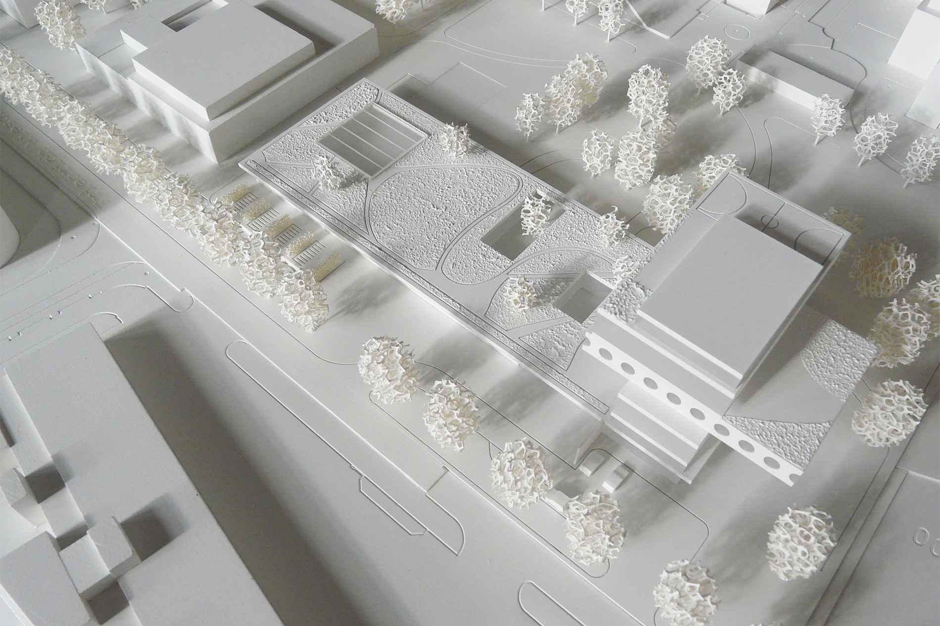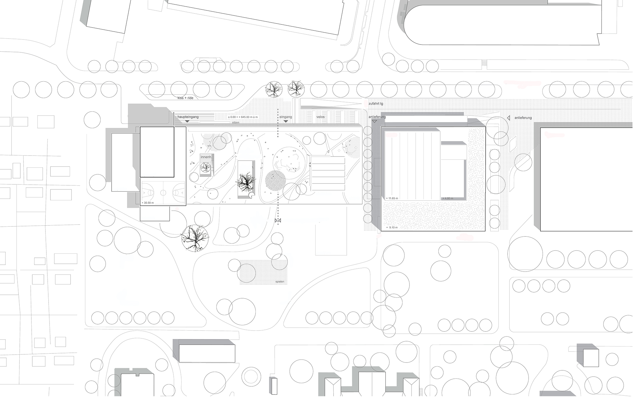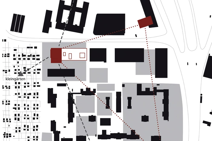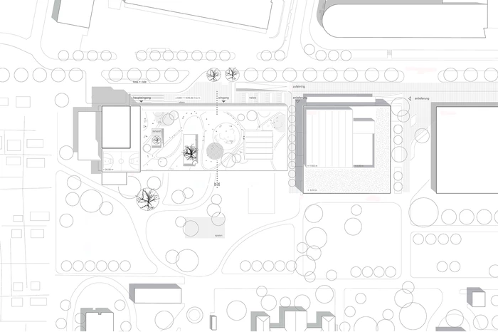 Der Neubau für die KJPK gleicht einem modernen „Baumhaus“. Er markiert den nordwestlichen Rand des UPK-Areals, im Spannungsfeld zwischen Klinikbereich, Kleingartenanlage und Büro- und Gewerbebauten. Der Baukörper ist von weither sichtbar und daher gestaltprägend für das gesamte Erscheinungsbild des UPK-Areals.