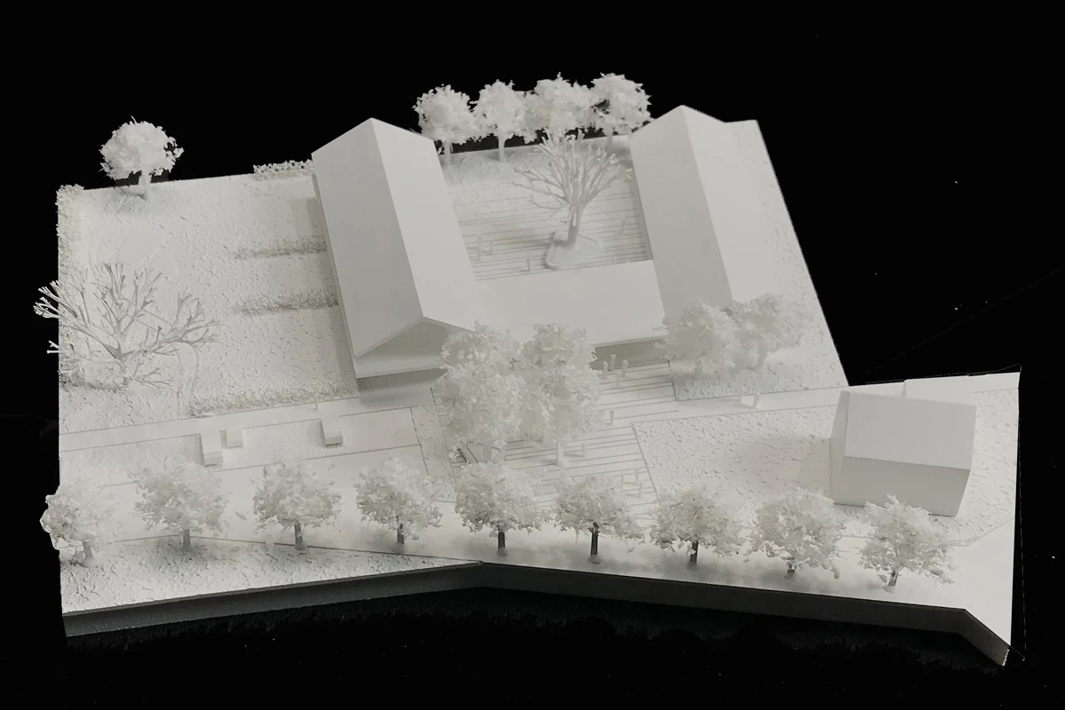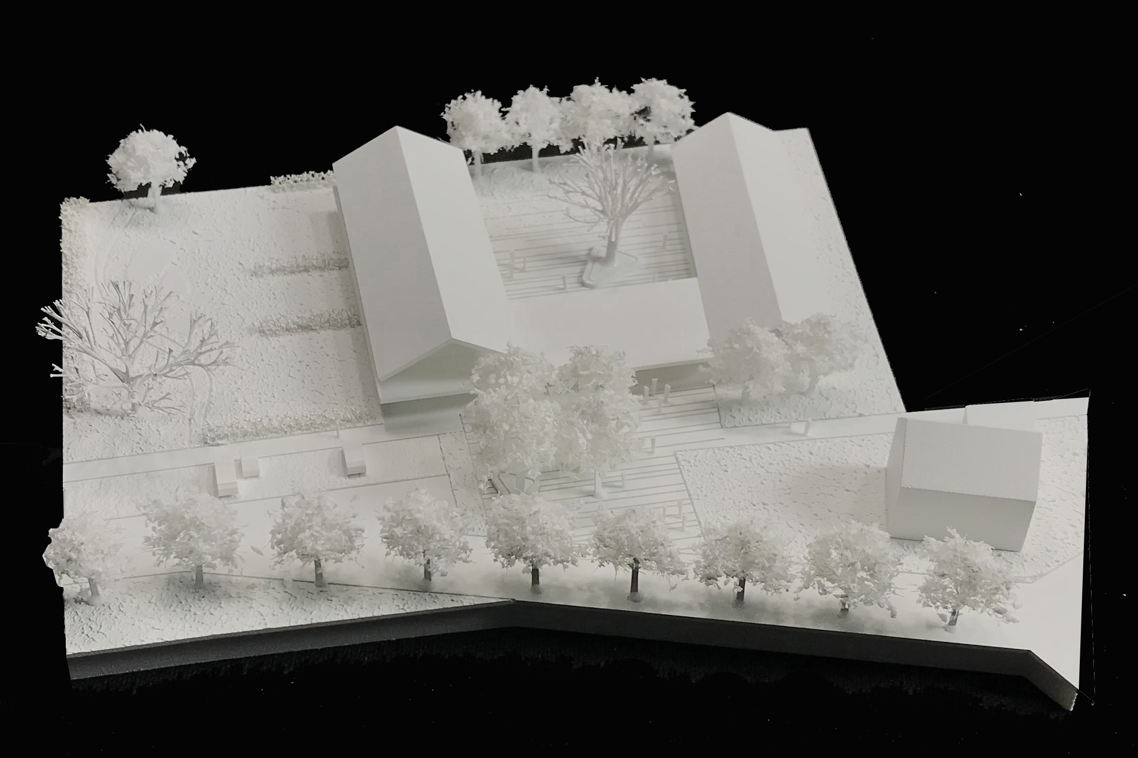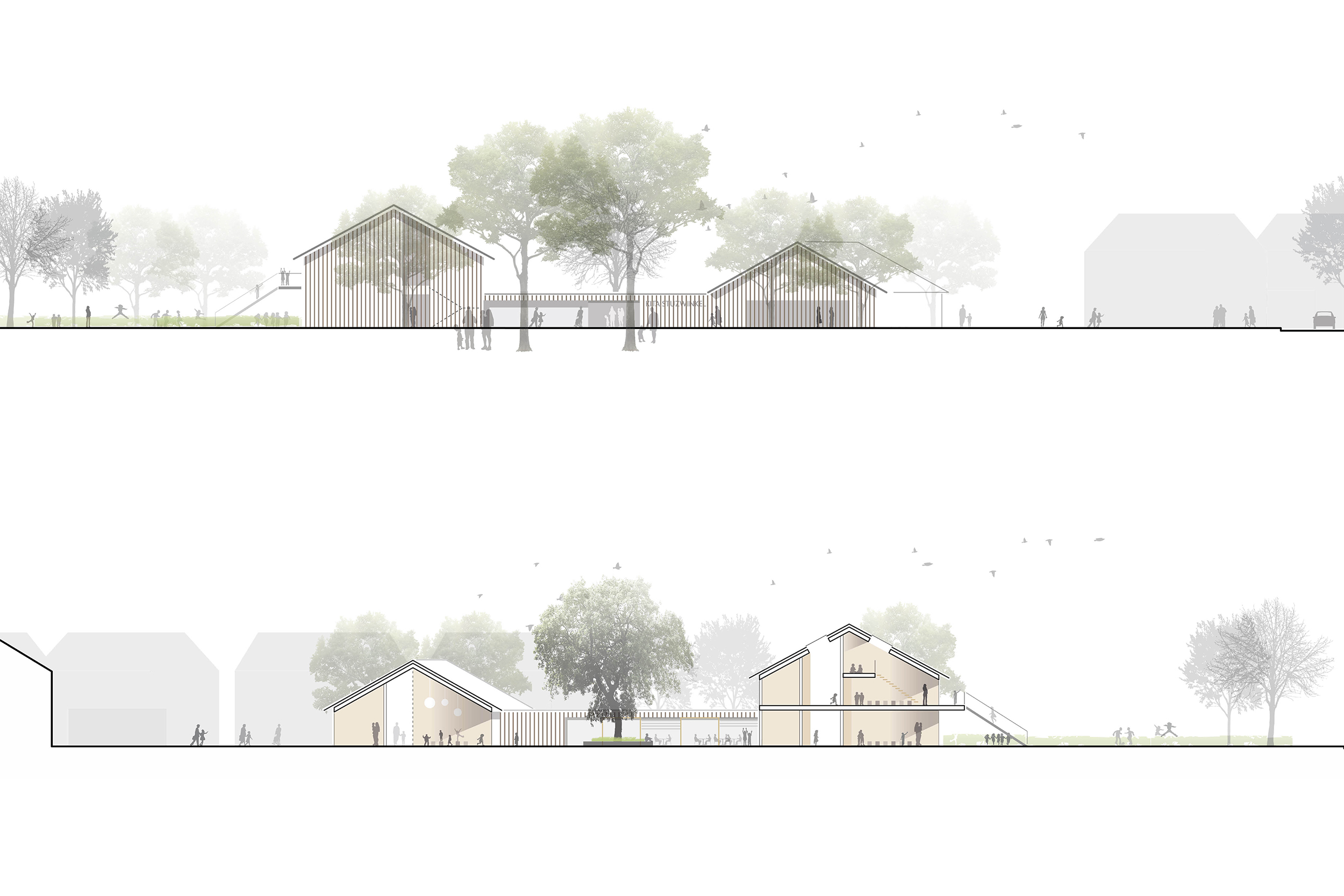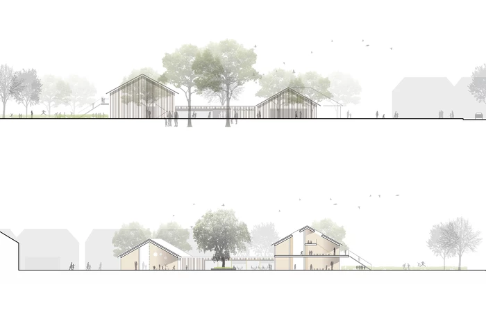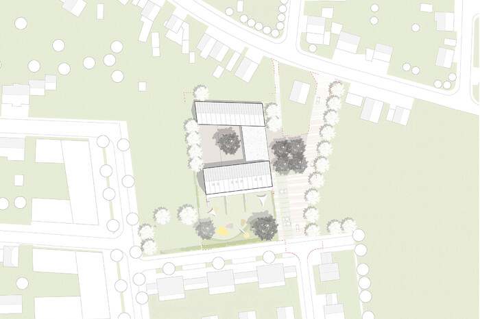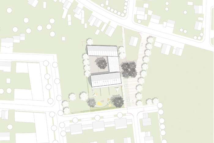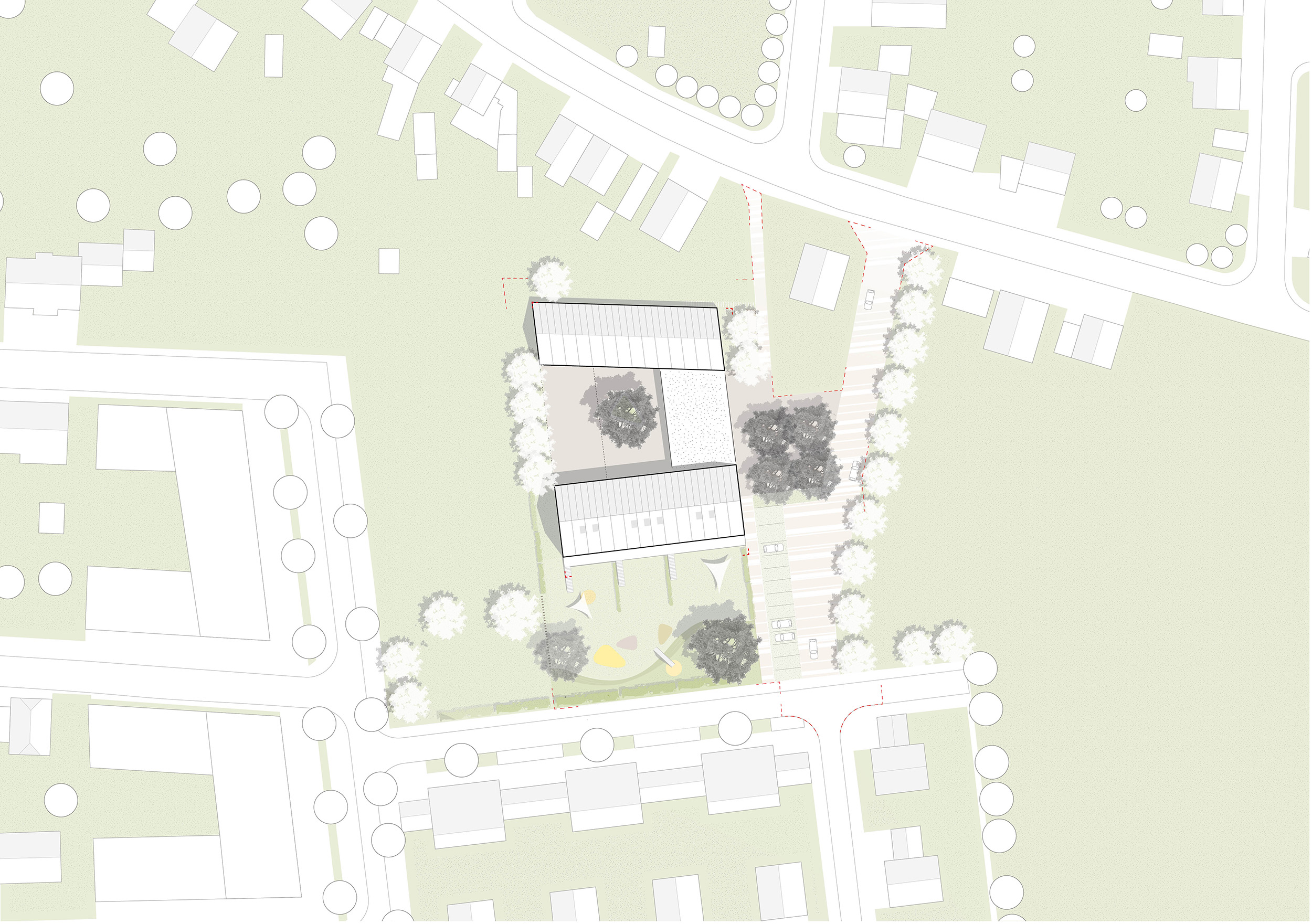 Die Kindertagesstätte wird als dreigliedrige, U-förmige Anlage konzipiert. Die drei durch ihre Höhe und Dachform klar ablesbaren, strukturierten Gebäudekörper bilden einen Hof, der sich nach Westen hin öffnet. Während die Gliederung auf die Kleinmaßstäblichkeit des Kontextes reagiert, schafft die Gesamtanlage einen eindeutigen Schwerpunkt innerhalb des Wohngebiets. Im Osten entsteht eine klare Raumkante entlang des öffentlichen Vorbereichs. Die gewünschte Erweiterungsmöglichkeit mit zwei Gruppen-/ Intensivräumen ist im Westen der Hofanlage vorgesehen. Der offene Hof wandelt sich zu einem Innenhof und es entsteht eine ringförmige Erschließungssituation.