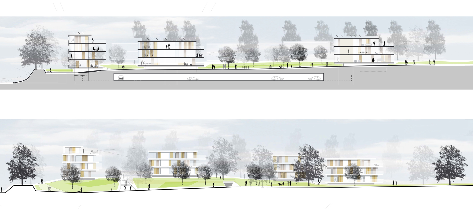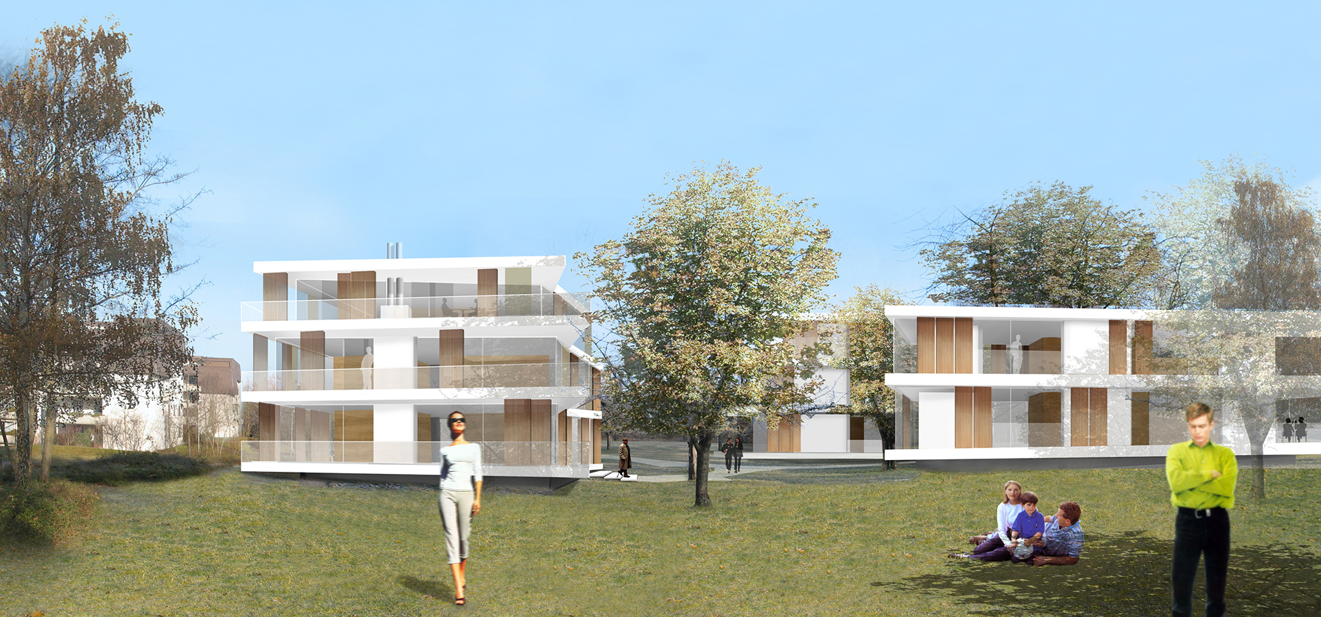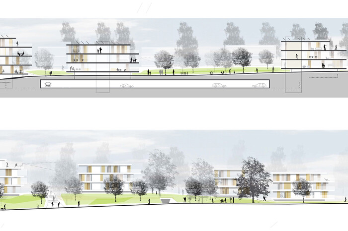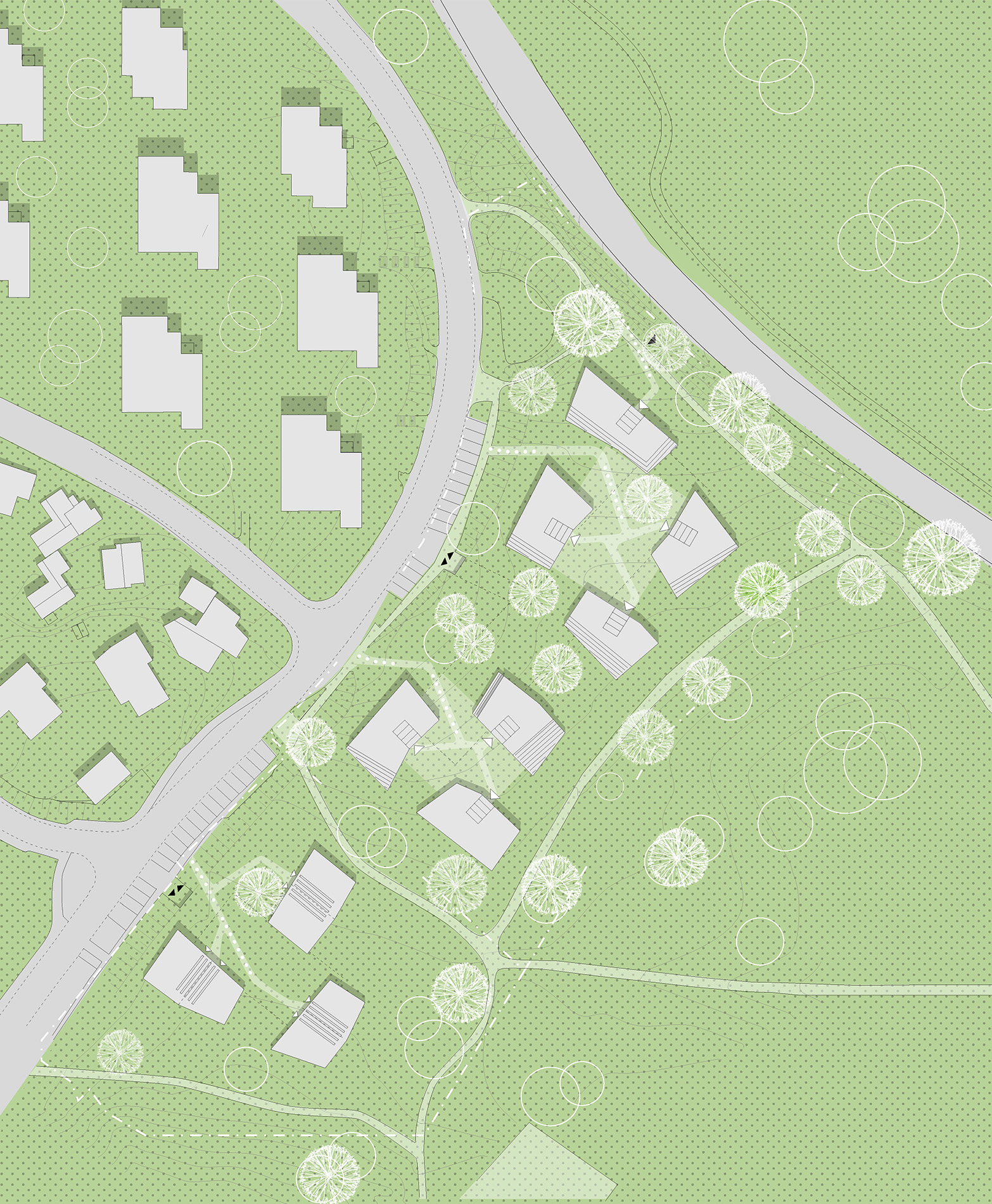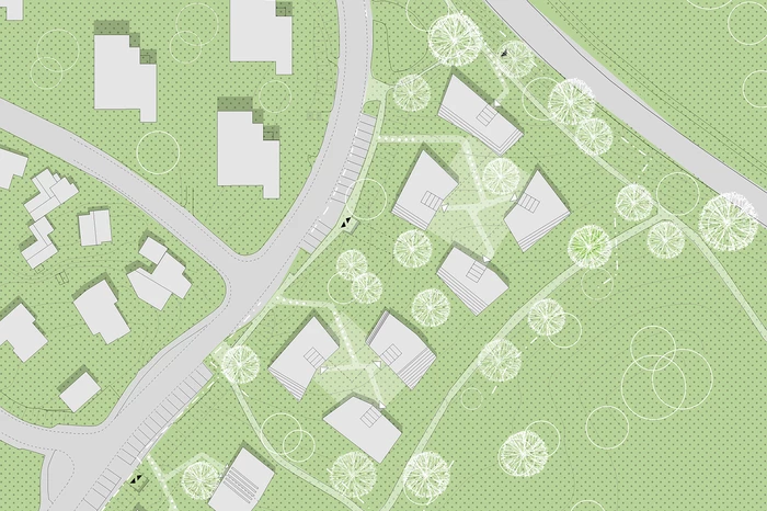 Die außergewöhnliche Lage des Planungsgebietes an der Schnittstelle zwischen Landschaftsraum und Stadtraum ist einer der bestimmenden Momente für den Entwurf der neuen Wohnanlage mit 10 Stadtvillen in Leonberg. Das historische Grundstück der „Kirschgärten“ mit seinem offenen, lieblichen Charakter einer Streuobstwiese verbindet sich großzügig mit dem angrenzenden Grünraum. Die neuen Wohnhäuser sind ein Teil dieses „Kirschgartens“ mit seinen fließenden räumlichen Übergängen. Die lockere Gruppierung der Häuser unterstreicht diese Idee. Es entstehen drei individuelle Häusergruppen, die jeweils über einen Fußweg und einen zentralen platzartigen Bereich erschlossen werden. Die Fahranbindung erfolgt über zwei Tiefgaragen, über die die Wohneinheiten direkt erschlossen werden. Somit bleiben die Bereiche zwischen den Gebäuden frei von Autos und der „Garten“ - Charakter der Gesamtanlage bleibt erhalten. Sie wird als räumlicher Teil des gesamten Parks empfunden.