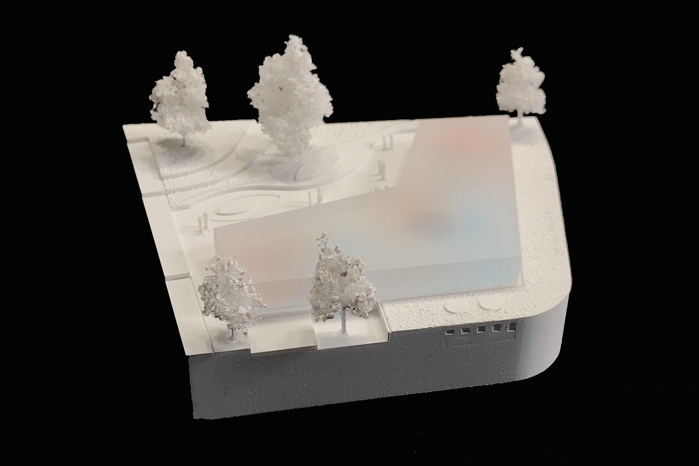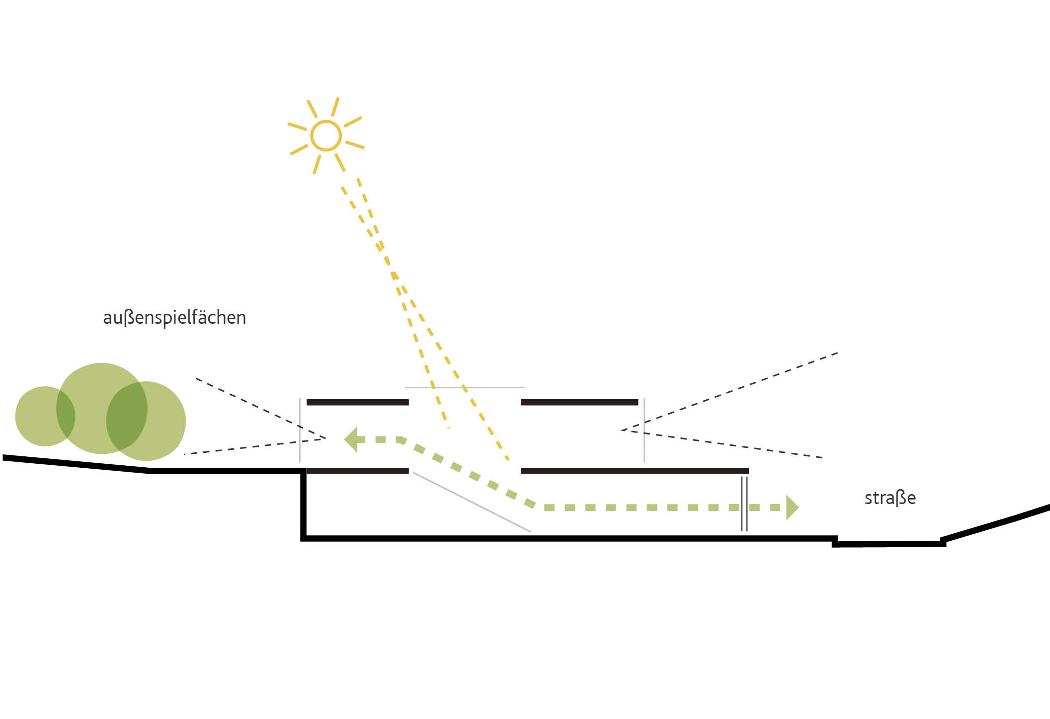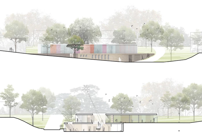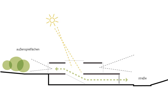 Der Kita-Neubau greift die für die umgebende Bebauung typischen Gestaltungselemente wie tiefe Vorgartenzone, von der Straße abgerückter Baukörper und hohe Stützmauer auf. Über einem erdgebundenen, massiven Sockelgeschoss aus strukturiertem Dämmbeton, das eine klare Raumkante entlang der Straße definiert, erhebt sich ein zurückversetzter, eingeschossiger Pavillonbau, dessen Materialisierung aus farbigen Gläsern Leichtigkeit und Transparenz vermittelt. Der Pavillon öffnet sich winkelförmig nach Süd-Westen und definiert damit einen geschützten, auf die beiden Sumpfzypressen orientierten Außenbereich. Durch die Einbindung in die Topografie wird die in Erscheinung tretende Gebäudekubatur auf ein Minimum reduziert.
