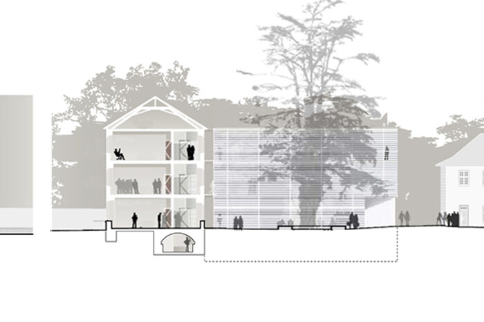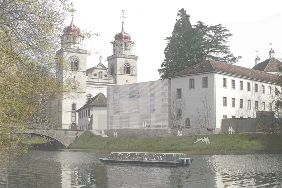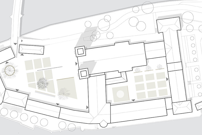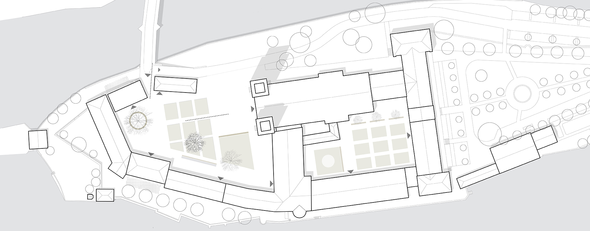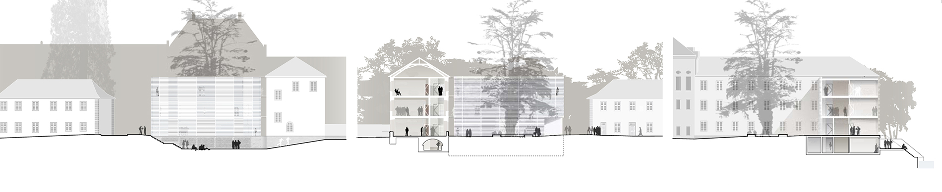 Der Entwurf geht sensibel auf das historische Gebäudeensemble ein, auf die jeweils eigene Geschichte und baulichen Besonderheiten der einzelnen Bauteile. Um die notwendigen Flächen realisieren zu können, wird der Altbau durch einen zurückhaltenden Neubau ersetzt. Die vorhandenen Baufluchten des Altbaus werden in Teilen aufgenommen und weitergeleitet. Auch in seiner Höhenentwicklung orientiert sich das neue Gebäude an der Gesamtanlage. Es entsteht ein ausgewogenes, gut proportioniertes Gesamtbild, das durch das Zusammenspiel von Alt und Neu bereichert wird. Der Neubau springt im Erdgeschoss leicht zurück und akzentuiert so die Zugangssituation zur Klosterinsel, die hierdurch eine angemessene, zeitgemäße architektonische Aufwertung erhält.