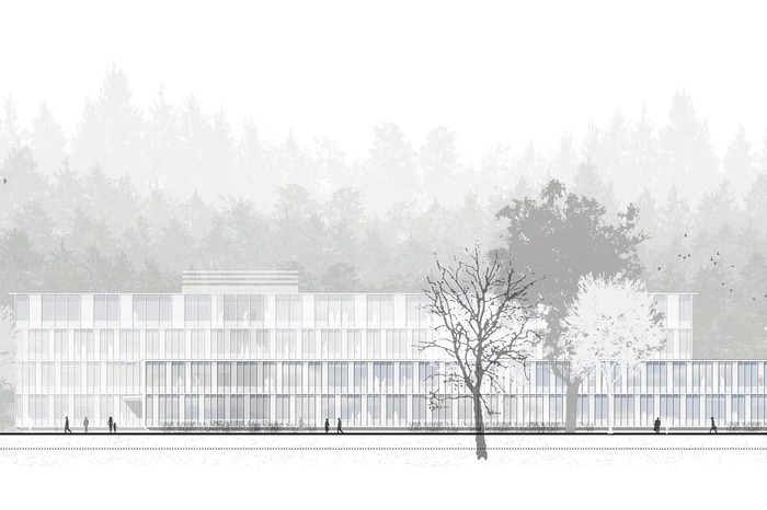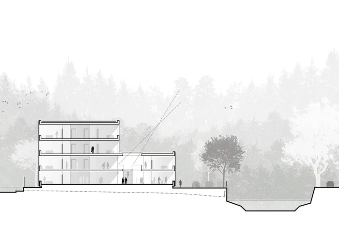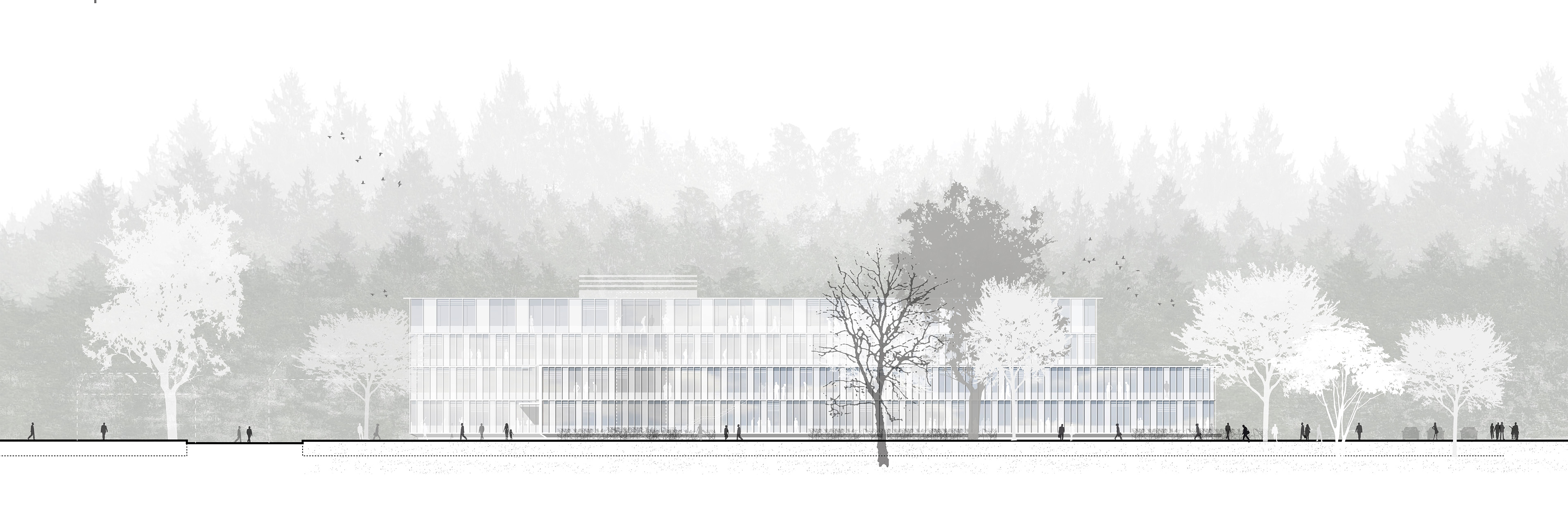 Das neue Gebäude von Kriminalpolizeidirektion und Polizeirevier wird infolge des Grundstückzuschnitts als längsgerichtetes Volumen organisiert. Entsprechend der spezifischen Situation staffelt sich der Neubau zur Nagold hin ab und schafft eine Verzahnung von Natur- und gebautem Raum. Die unterschiedliche Höhenentwicklung führt zu einer Gliederung des Gebäudes. Trotz der Setzung eines markanten Stadtbausteins entsteht dadurch eine Differenziertheit, die der vorhandenen städtebaulichen Körnung Rechnung trägt. Um dem geforderten Hochwasserschutz HQ Extrem zu entsprechen, wird das Gelände um 80 cm aufgeschüttet, so dass sowohl der Neubau als auch die Parkierungsflächen auf dem hochwassersicheren Niveau der Sannwaldbrücke und des zukünftig ausgebauten Hirsauer Wiesenwegs liegen.