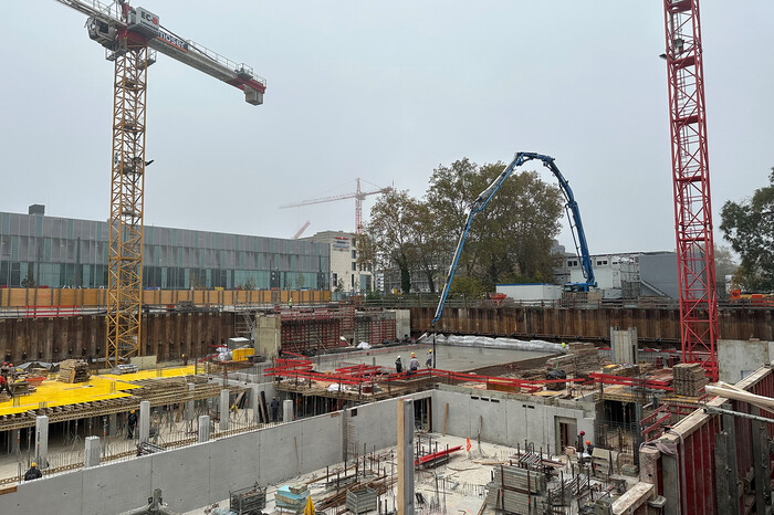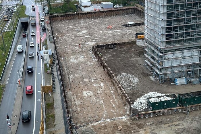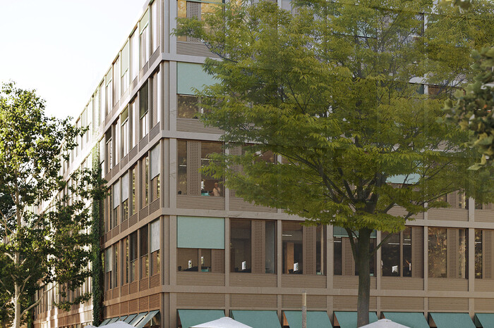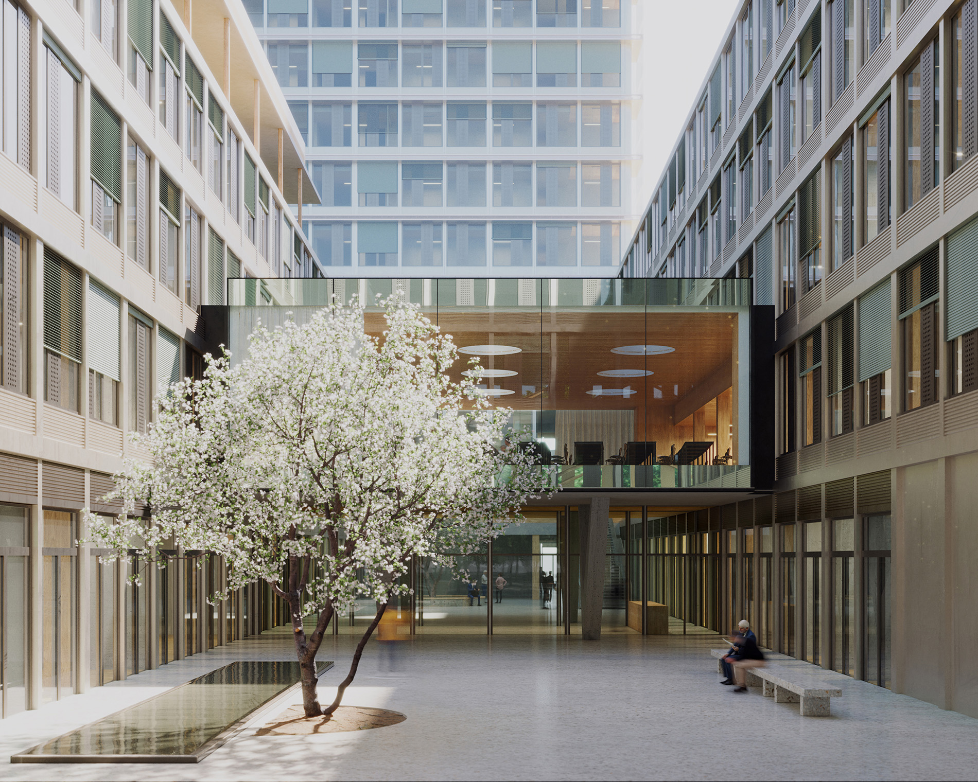 Mit der Gebäudekonfiguration gelingt es sowohl, den Blockrand zur Badenwerk- und Kriegsstraße durch klare Raumkanten zu definieren und zu schließen, als auch einen respektvollen Abstand zu dem denkmalgeschützten Wohnblock des Architekten Hermann Billing zu wahren. Zwischen beiden Gebäudekomplexen, die im Zusammenspiel einen Blockrand bilden, entsteht durch die Ausformulierung des neuen Gebäudeensembles eine zusammenhängende, großzügige Grünfläche, eine sogenannte „Grüne Mitte“, mit hoher Aufenthaltsqualität, die einen Mehrwert sowohl für die Anwohner als auch die Mitarbeiter der verschiedenen Verwaltungen darstellt.