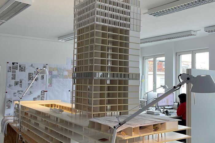 Der Neubau fügt sich einerseits mit seinen 5-geschossigen Bauabschnitten und dem Hochpunkt maßstäblich und selbstverständlich in den städtebaulichen Kontext ein. Andererseits wird das neue Landratsamt aber auch als ein eigenständiges, selbstbewusstes Gebäude wahrgenommen, das mit seiner Ausrichtung zum Ettlinger Tor und dem markanten Hochhaus einen Akzent mit Fernwirkung setzt, eine klare Adressbildung schafft und als Visitenkarte fungiert.