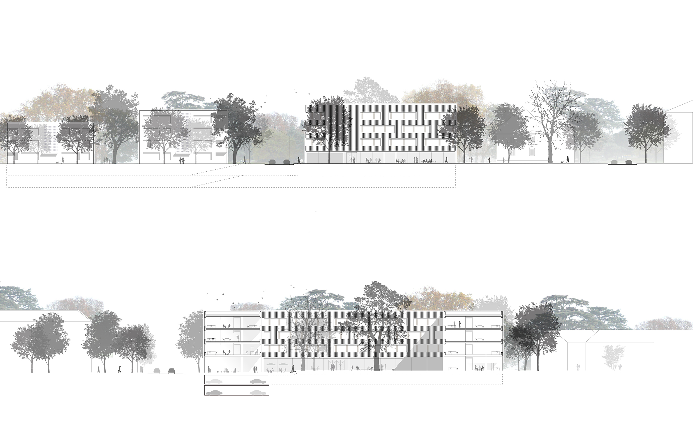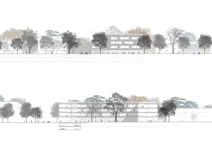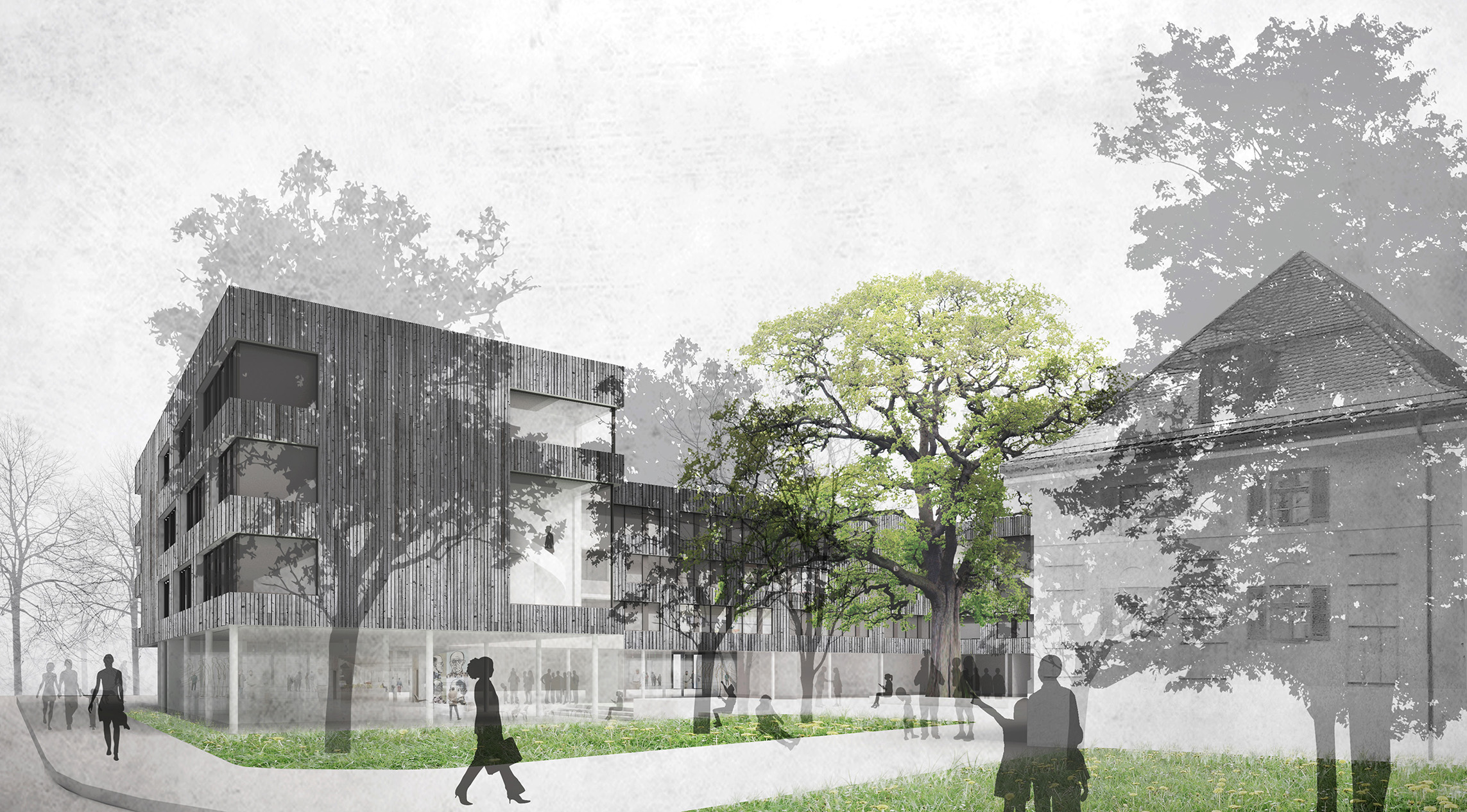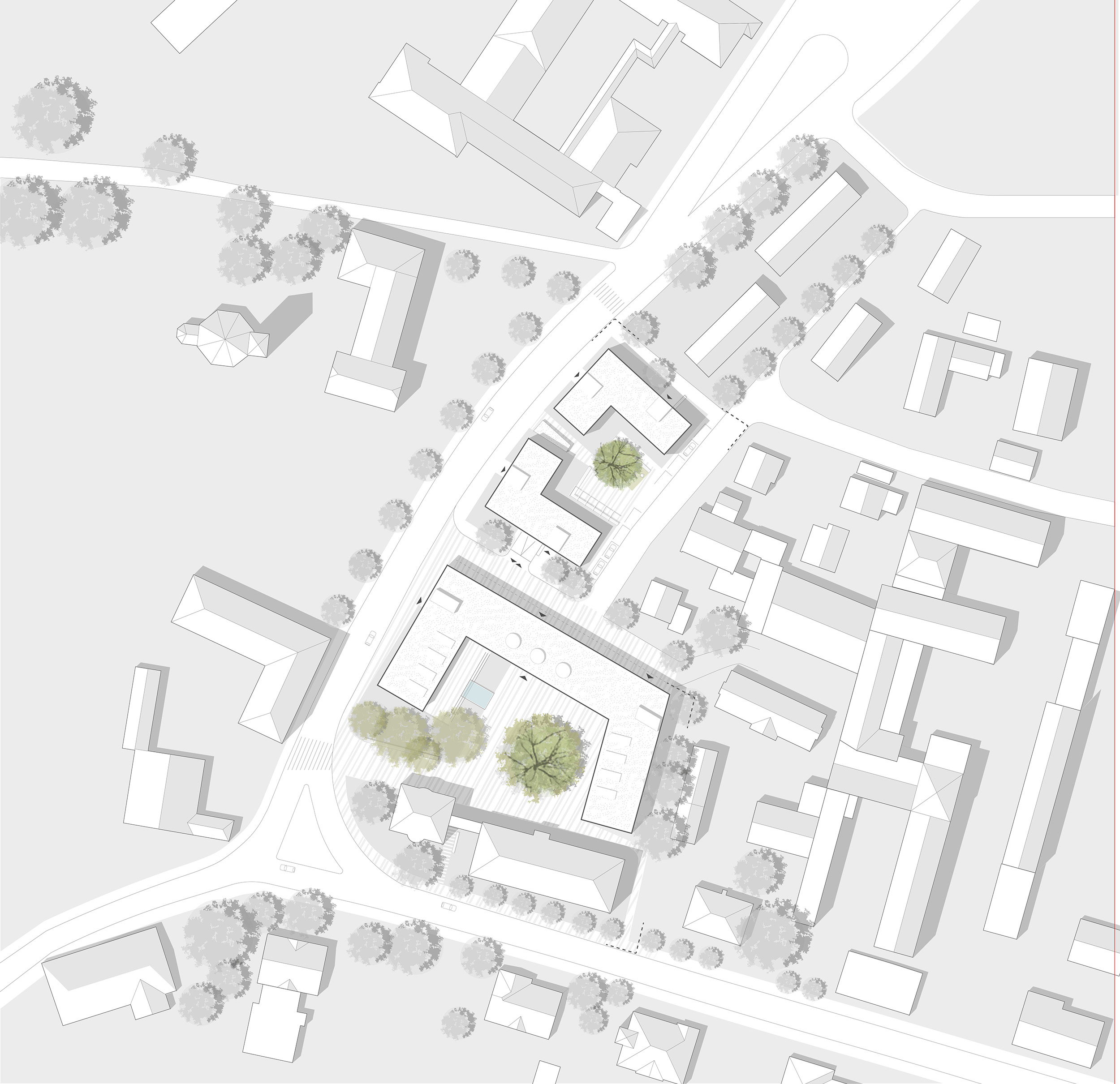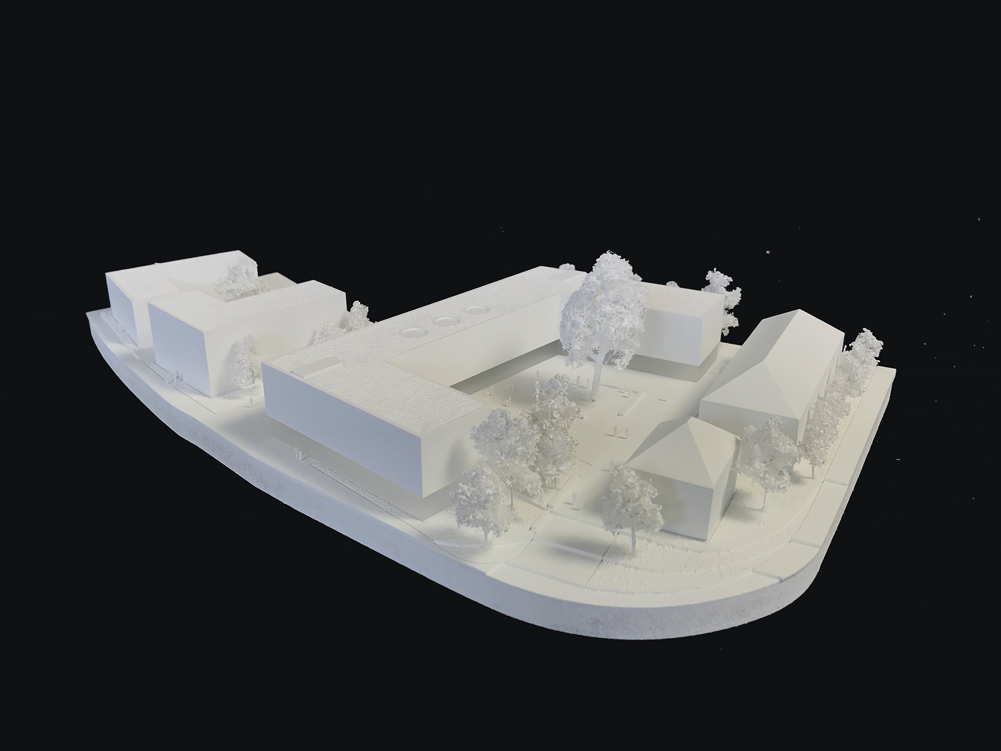 Der U-förmige neue Baukörper schafft eine klare Raumkante entlang der Münchner Straße und zu der nördlich und östlich angrenzenden Bebauung. Zusammen mit den unter Denkmalschutz stehenden Bestandsgebäuden bildet er einen ruhigen Innenhof, der zum Mittelpunkt der Anlage wird und die umliegenden Gebäude des Landratsamts einbezieht. Durch den alten Baumbestand – insbesondere die große Rotbuche - und eine differenzierte Gestaltung wird der Innenhof zu einem ganz besonderen, identitätsstiftenden Ort, zu einem Treffpunkt mit hoher Aufenthaltsqualität sowohl für die Mitarbeiter als auch die Besucher des Landratsamtes. Der Neubau nimmt mit seiner Höhenentwicklung Bezug auf die umliegende Bebauung. Über einem transparenten bzw. transluzenten, Offenheit vermittelden Sockelgeschoss liegt ein ruhiger, dreigeschossiger Baukörper, dessen dunkle, feinteilige Holzverschalung Themen der Umgebung aufgreift.