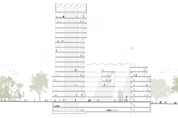 Der neue Gebäudekomplex ist aufgrund seiner vielfältigen städtebaulichen Bezüge fest mit dem Ort verbunden und gleichzeitig ein markanter Stadtbaustein. Er reagiert auf die Kleinmaßstäblichkeit des Stadtteils Deutz ebenso wie auf die ihn prägenden Großvolumen. Nach außen ruhig und eher geschlossen, charakterisieren Leichtigkeit und eine offene Atmosphäre das Gebäudeinnere. Zwei überdachte Innenhöfe mit unterschiedlichem Charakter fungieren wie erweiterte Innenräume und schaffen im Gebäude Orte mit hoher Aufenthaltsqualität.