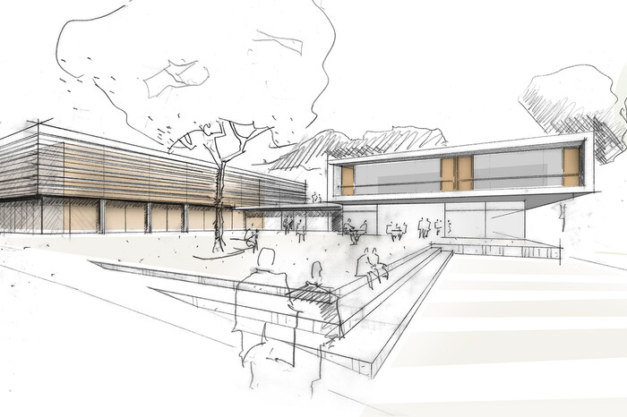 Mit dem Multifunktionsgebäude sollte ein Ort entstehen, der den Austausch und die Kommunikation unterschiedlichster Bevölkerungsgruppen auf unkomplizierte Art und Weise möglich macht. Der Neubau, bestehend aus unterschiedlich nutzbarer Halle und Schulerweiterung, bildet gemeinsam mit der Dr.-Johannes-Faust-Schule ein Ensemble. Die zentrale Idee ist es, städtebauliche Präsenz zu zeigen, ohne das Wohngebiet „Bauerbacher Pfad“ zu belasten. Freianlagen, Schule und Halle formen die zukunftsorientierte Campuslandschaft und den neuen „Kristallisationspunkt“, die verbindende Mitte. Der kompakte, teilweise eingegrabene Baukörper, die Optimierung des baulichen Wärmeschutzes (Gebäudehülle in Passivhaus-Standard) und die effiziente Anlagentechnik ermöglichen die Unterschreitung der geltenden EnEV 2009 um mindestens 20%.