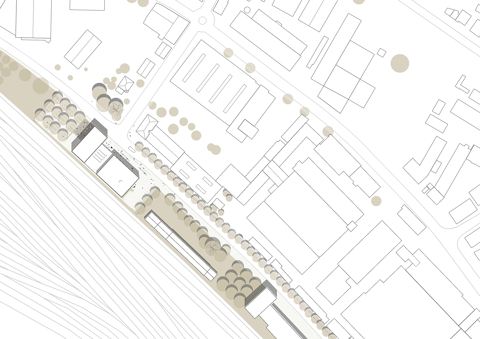 Bestimmend für den Entwurf ist die besondere Lage des Wettbewerbsgrundstücks in der Neckaraue am westlichen Rand von Plochingen. Im Spannungsfeld zwischen Industriegebiet und Gleisanlagen soll ein repräsentativer baulicher Abschluss der südöstlichen Innenstadt geschaffen werden.