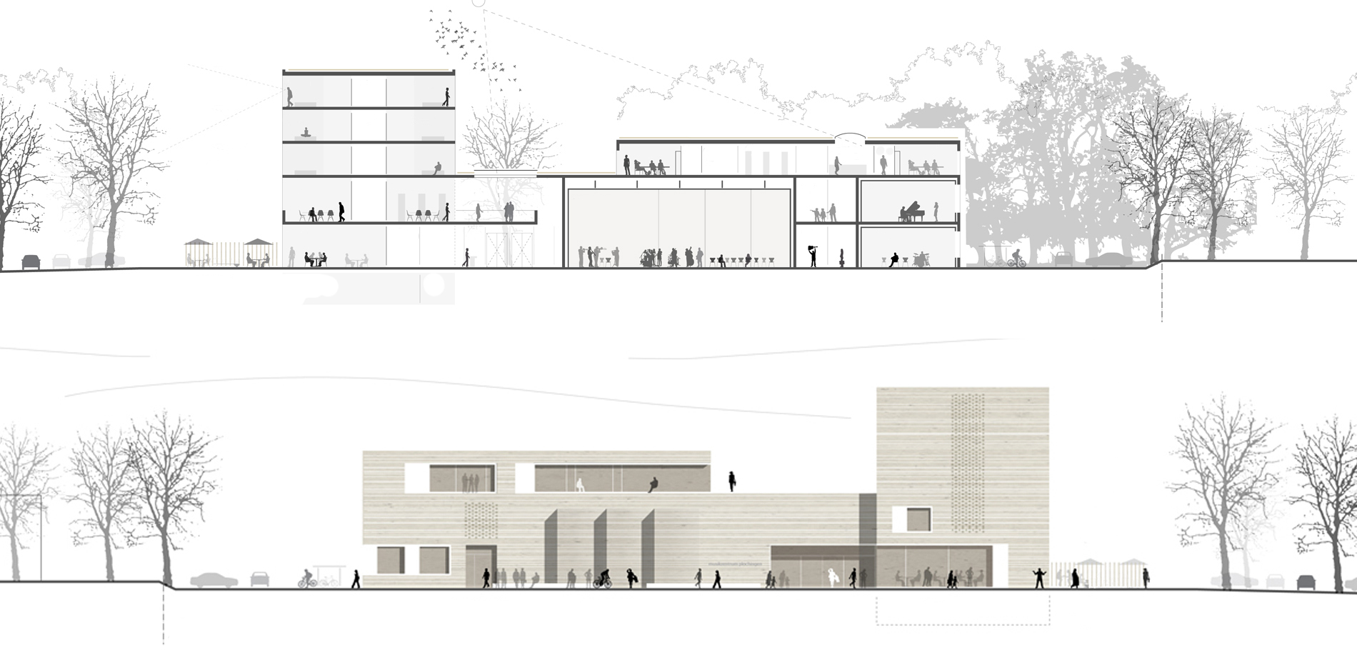 Für das neue Musikzentrum wird ein selbstbewusster, in sich ruhender Stadtbaustein entwickelt, der sich klar verortet und die gegebenen stadträumlichen Randbedingungen berücksichtigt und positiv stärkt. Seine kompakte, differenzierte baukörperliche Ausformung schafft eindeutige Raumkanten und Blickbezüge. Durch die Gliederung und Aufteilung der Funktionsbereiche wird eine „Zonierung“ des Neubaus in Nord-Südrichtung erreicht. Weniger lärmempfindliche Räume werden entlang des Gleiskörpers organisiert und dienen als „Puffer“, während die schalltechnisch sensiblen Raumgruppen auf der lärmabgewandten Seite im Norden liegen. Klare räumliche Bezüge helfen bei der inneren Orientierung. Flurbereiche wechseln mit Aufenthaltszonen. Es entsteht ein äußerst wirtschaftlicher Grundriss mit hohen Aufenthaltsqualitäten.