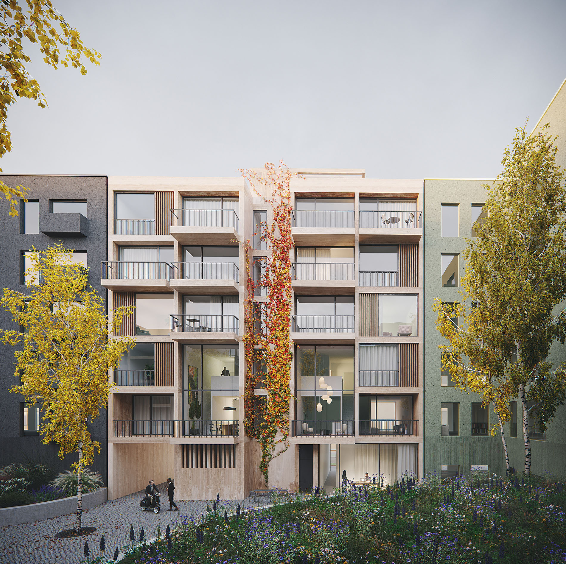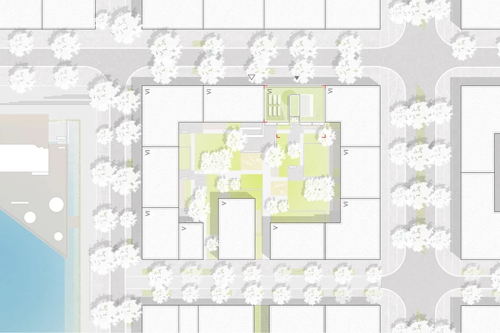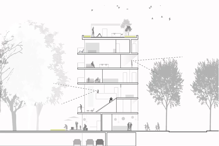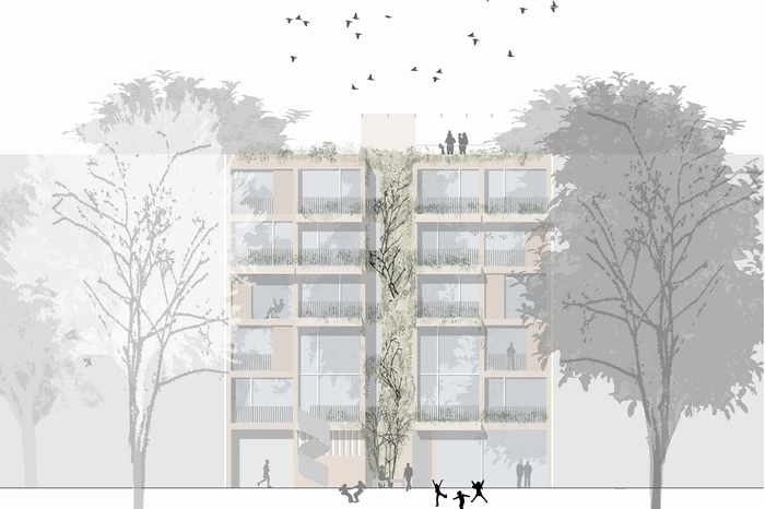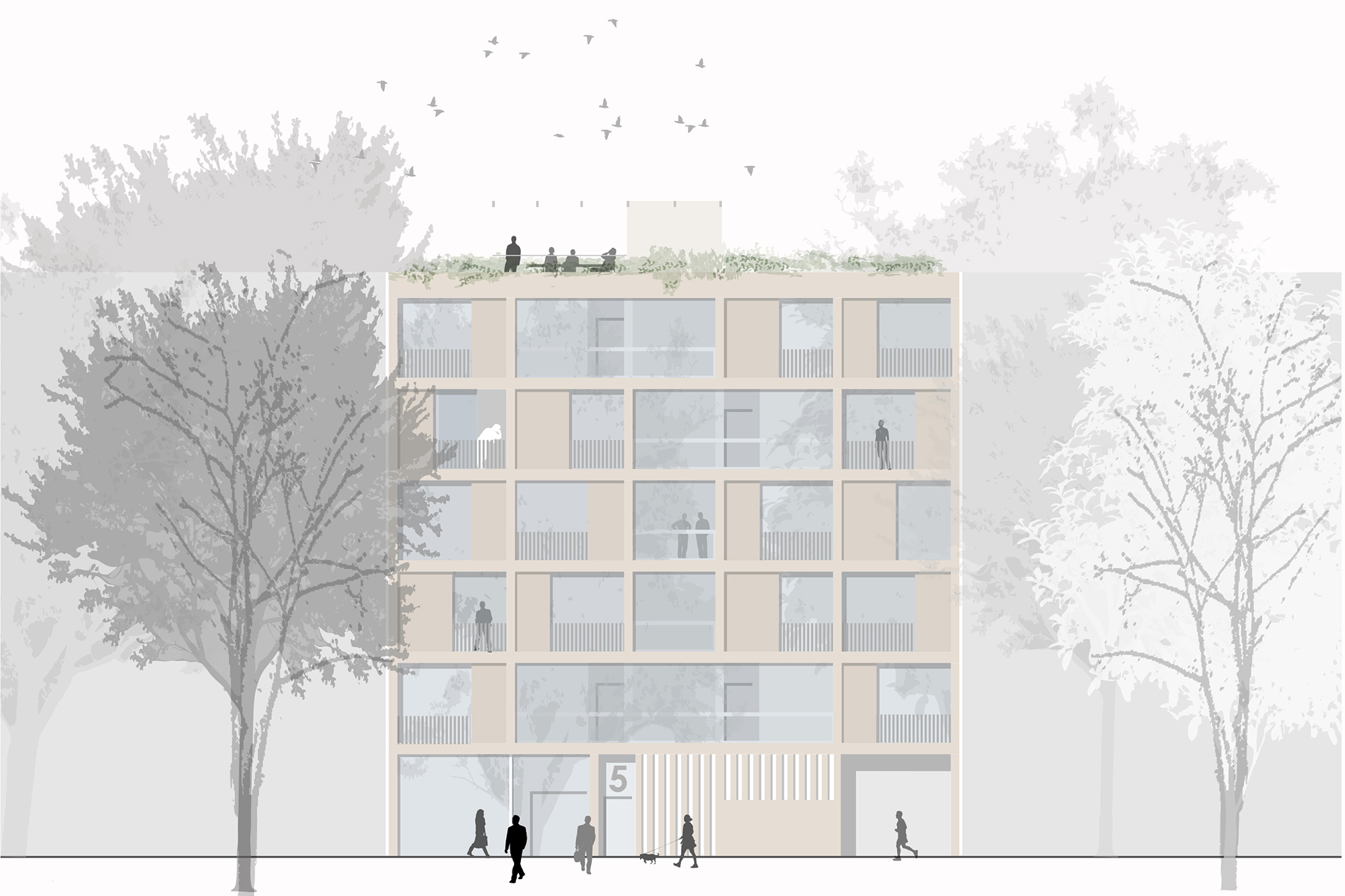 Das Gebäude K5 ist Teil der urban geprägten Blockrandstruktur. Es ist mit Ausnahme des Erdgeschosses, das sowohl einen Gemeinschaftsraum zum Innenhof als auch eine Gewerbefläche zum öffentlichen Raum hin anbietet, ausschließlich dem Wohnen vorbehalten. Die Zielsetzung, ein vielfältiges, gemischt genutztes Stadtquartier zu schaffen, impliziert die Attraktivität für alle Altersstufen und alle Lebensentwürfe. Dementsprechend richtet sich das Wohnungsangebot an Einzelpersonen ebenso wie an Paare und Familien. Grundlage hierfür sind eine barrierefreie Erschließung sowie ein modularer Aufbau der Geschosse mit 1- bis 4-Zimmer-Wohnungen, die individuell zusammengelegt und wieder getrennt werden können. Das 1. und 2. OG sind als Maisonette-Wohnungen konzipiert. Jede Wohneinheit ist nach zwei Seiten ausgerichtet und hat einen eigenen Außenbereich in Form einer Loggia/eines Balkons. Der große Dachgarten steht ebenfalls für alle Bewohner des Hauses zur Verfügung und bietet somit viele Kontakt- und Kommunikationsflächen sowie zusätzliche Aufenthaltsqualität. Die Architektur ist hell und freundlich und das Gebäude öffnet sich über diese Elemente zum gemeinschaftlich genutzten Grünbereich hin. So entsteht ein interessantes Wechselspiel von Innen und Außen, von Privatheit und Öffentlichkeit, von Kommunikation und Kontemplation.