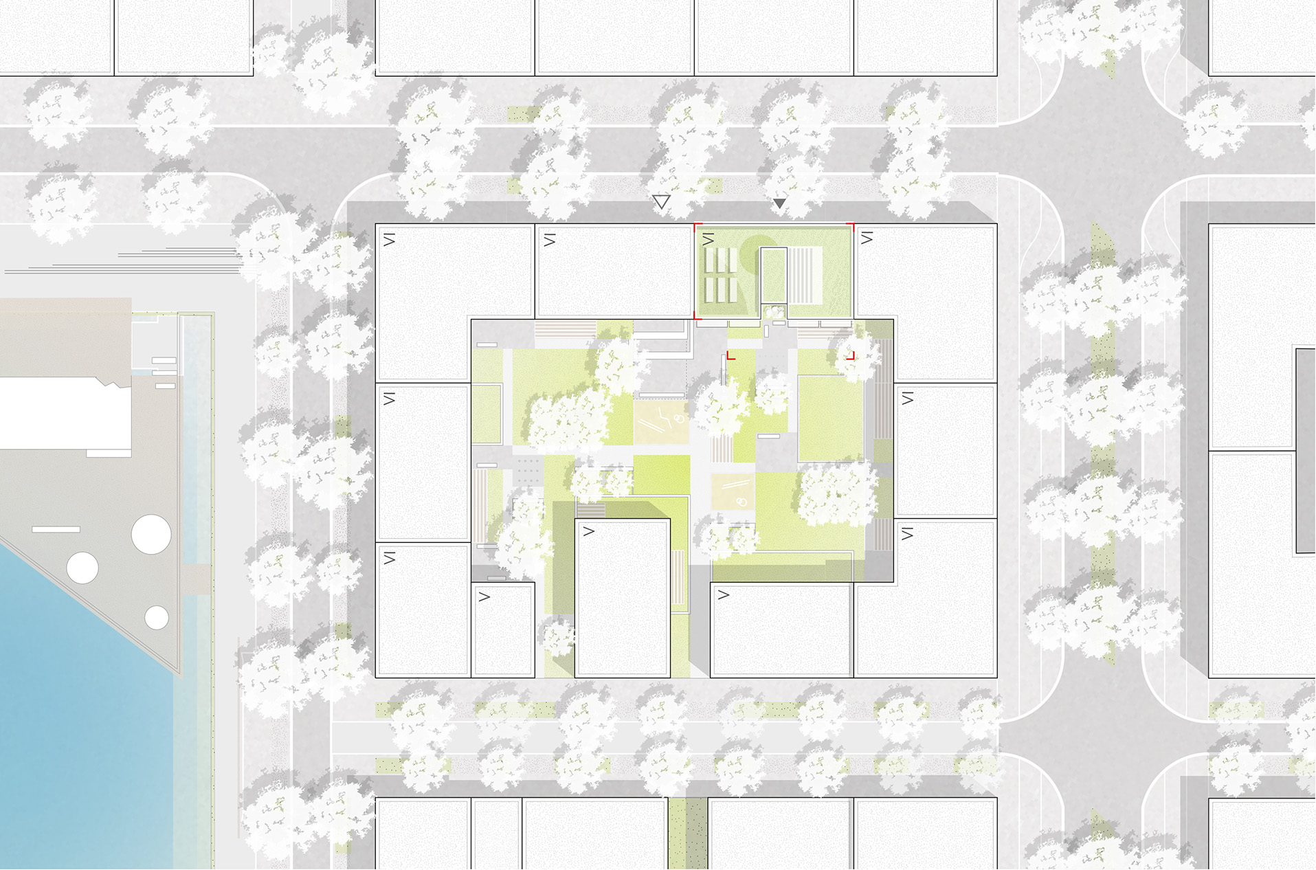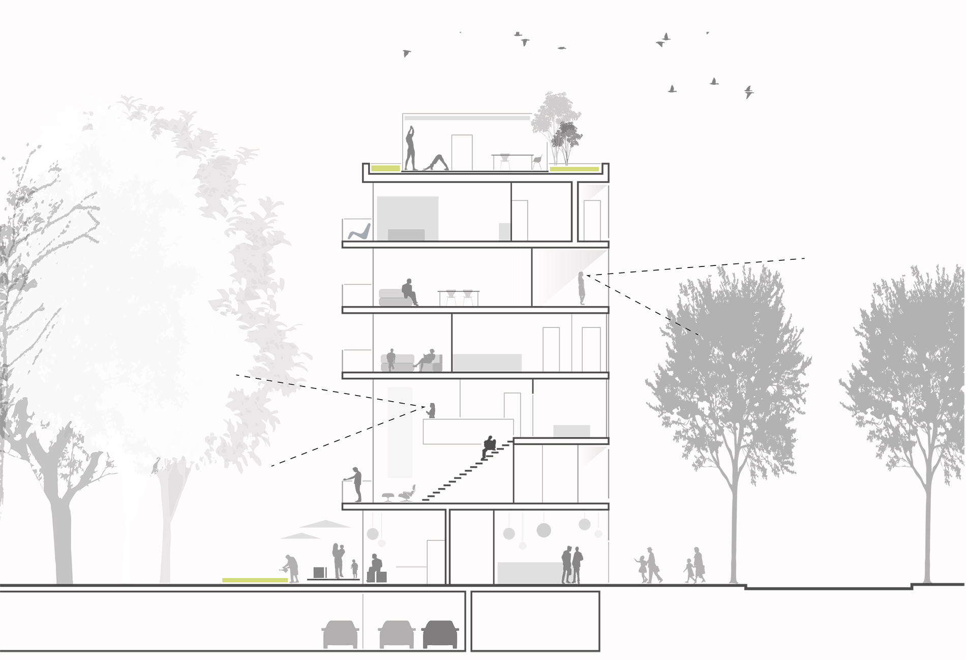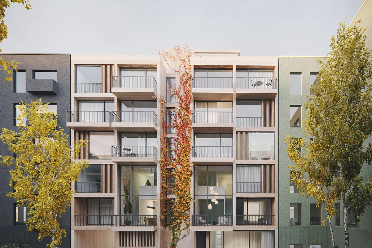 Das Gebäude K5 ist Teil der urban geprägten Blockrandstruktur. Es ist mit Ausnahme des Erdgeschosses, das sowohl einen Gemeinschaftsraum zum Innenhof als auch eine Gewerbefläche zum öffentlichen Raum hin anbietet, ausschließlich dem Wohnen vorbehalten. Die Zielsetzung, ein vielfältiges, gemischt genutztes Stadtquartier zu schaffen, impliziert die Attraktivität für alle Altersstufen und alle Lebensentwürfe. Dementsprechend richtet sich das Wohnungsangebot an Einzelpersonen ebenso wie an Paare und Familien. Grundlage hierfür sind eine barrierefreie Erschließung sowie ein modularer Aufbau der Geschosse mit 1- bis 4-Zimmer-Wohnungen, die individuell zusammengelegt und wieder getrennt werden können. Das 1. und 2. OG sind als Maisonette-Wohnungen konzipiert. Jede Wohneinheit ist nach zwei Seiten ausgerichtet und hat einen eigenen Außenbereich in Form einer Loggia/eines Balkons. Der große Dachgarten steht ebenfalls für alle Bewohner des Hauses zur Verfügung und bietet somit viele Kontakt- und Kommunikationsflächen sowie zusätzliche Aufenthaltsqualität. Die Architektur ist hell und freundlich und das Gebäude öffnet sich über diese Elemente zum gemeinschaftlich genutzten Grünbereich hin. So entsteht ein interessantes Wechselspiel von Innen und Außen, von Privatheit und Öffentlichkeit, von Kommunikation und Kontemplation.