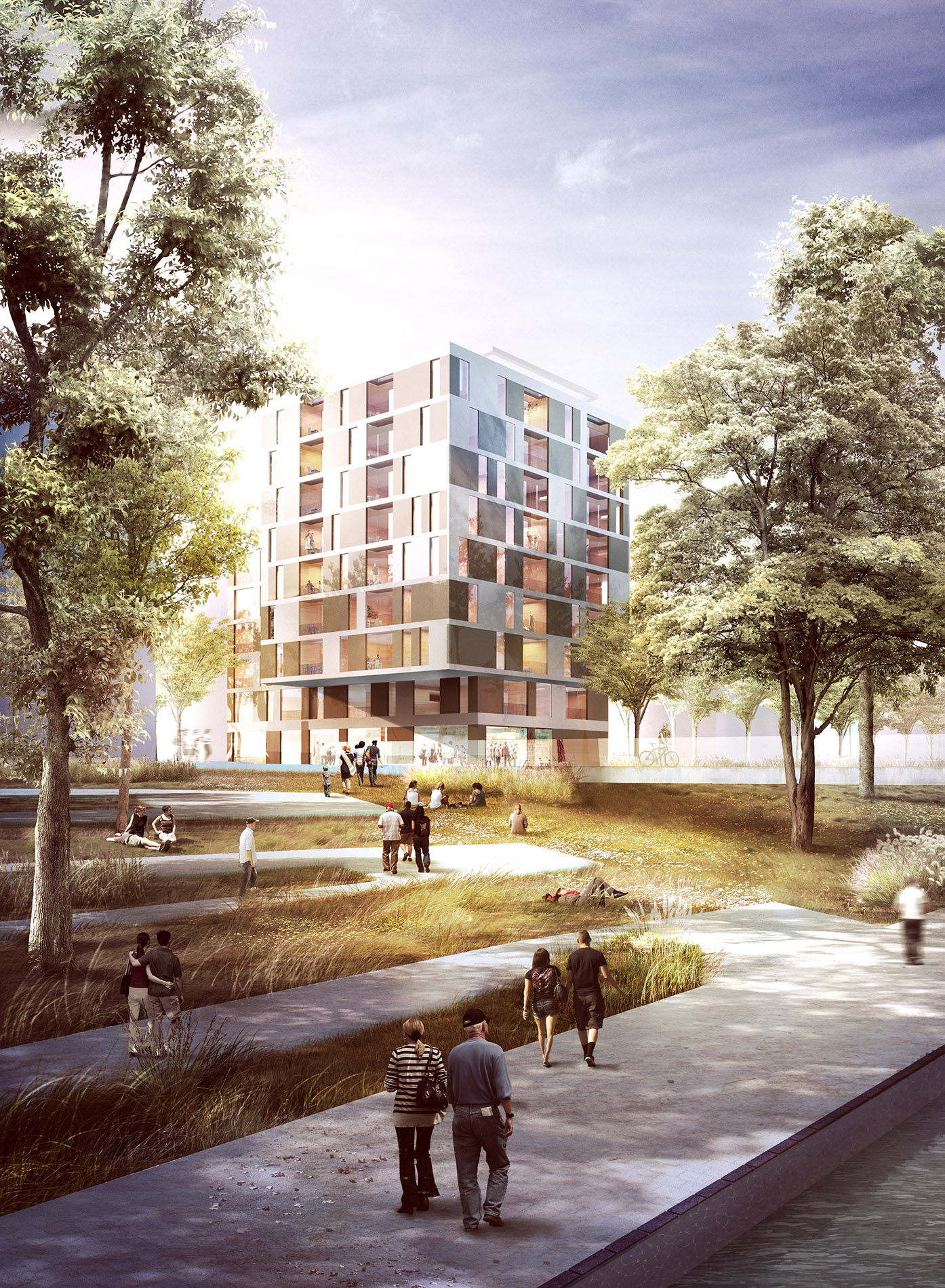 Das von Wittfoht Architekten geplante Gebäude liegt an einem der markantesten Orte des ausgewiesenen Areals. Durch seine exponierte Lage ist es das „Tor“ zur Buga und hat dementsprechend „Leuchtturm-Charakter“ für die gesamte Modellbebauung. Ziel war es, das Bauvolumen harmonisch in den strukturellen städtischen Kontext einzufügen und einen nachhaltigen Wohnungsbau zu erstellen, der mit kommunikativen Kontaktzonen zu einem qualitätsvollen Leben in der Stadt beiträgt.