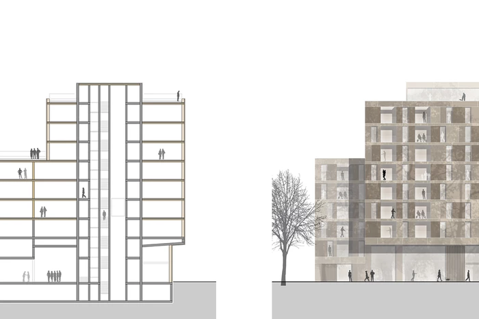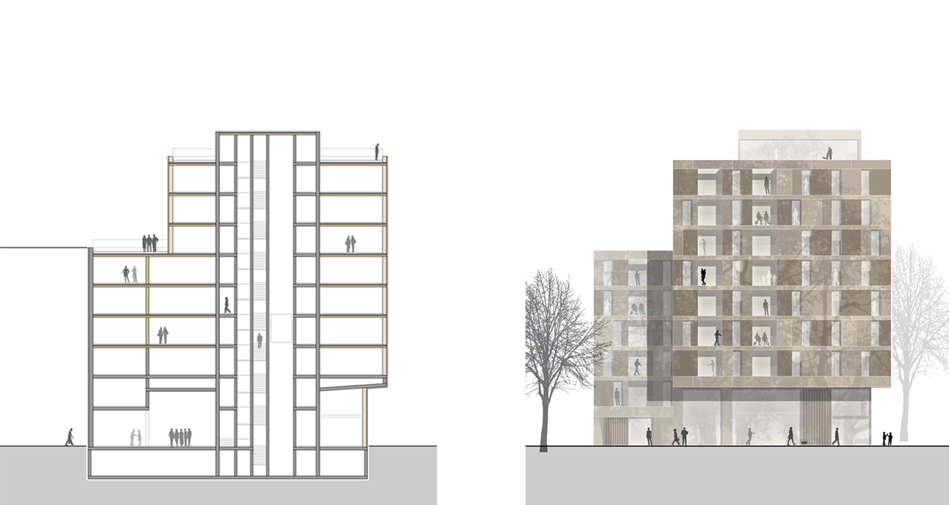 Das Gebäude ist mit Ausnahme des Erdgeschosses, das gewerblich genutzt wird, ausschließlich dem Wohnen vorbehalten. Die Zielsetzung, ein vielfältiges, gemischt genutztes Stadtquartier zu schaffen, impliziert die Attraktivität für alle Altersstufen und alle Lebensentwürfe. Grundlage hierfür ist ein modularer Aufbau der Geschosse mit 2-, 3- und 4-Zimmer-Wohnungen, die individuell zusammengelegt und wieder getrennt werden können.