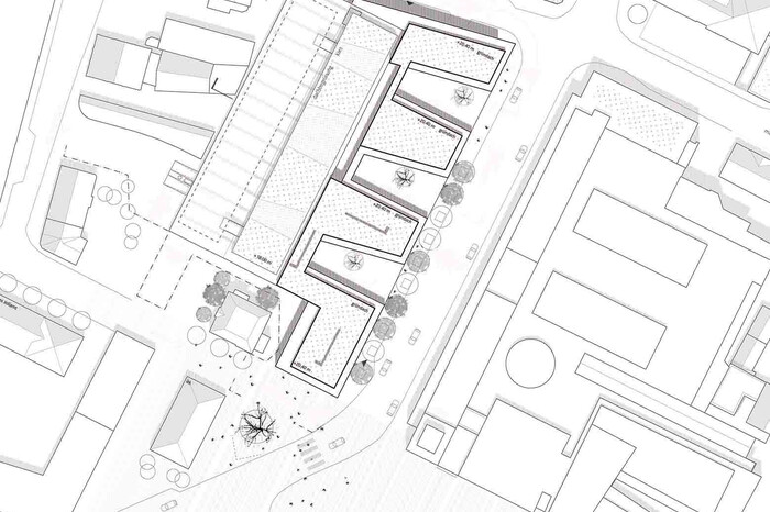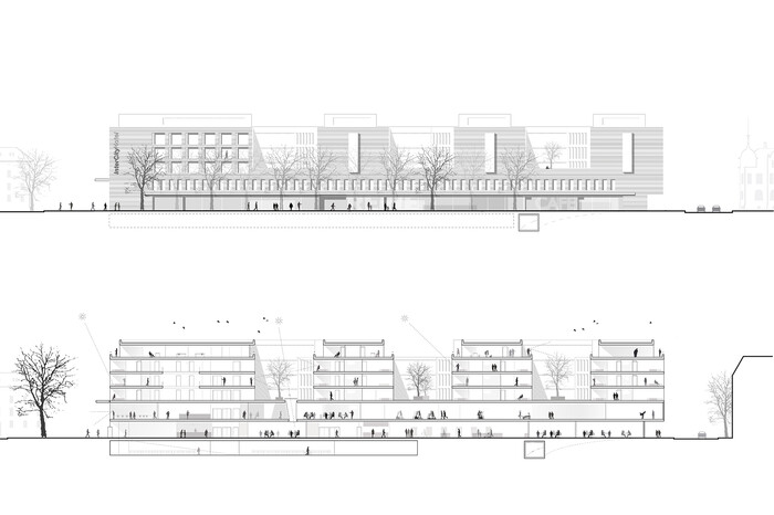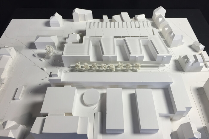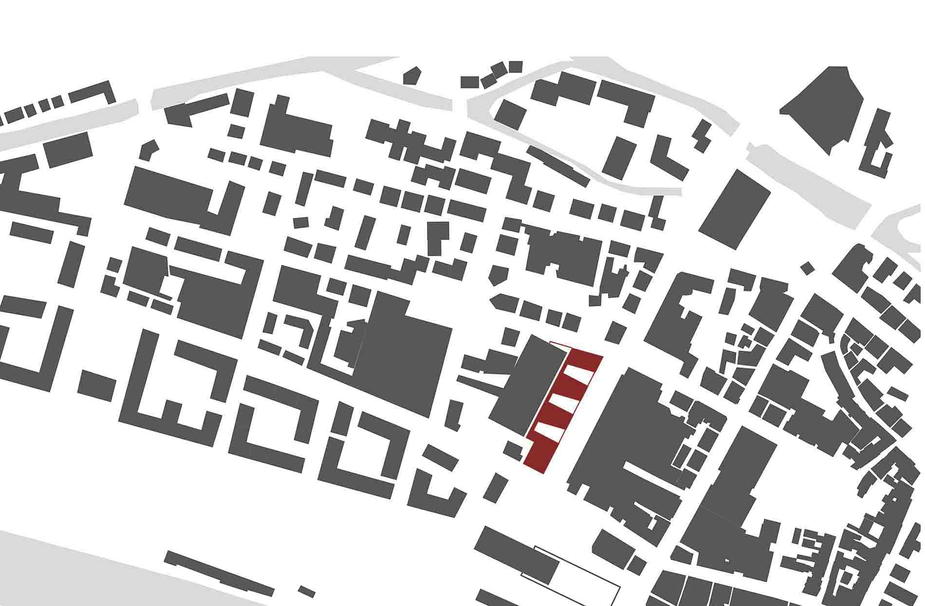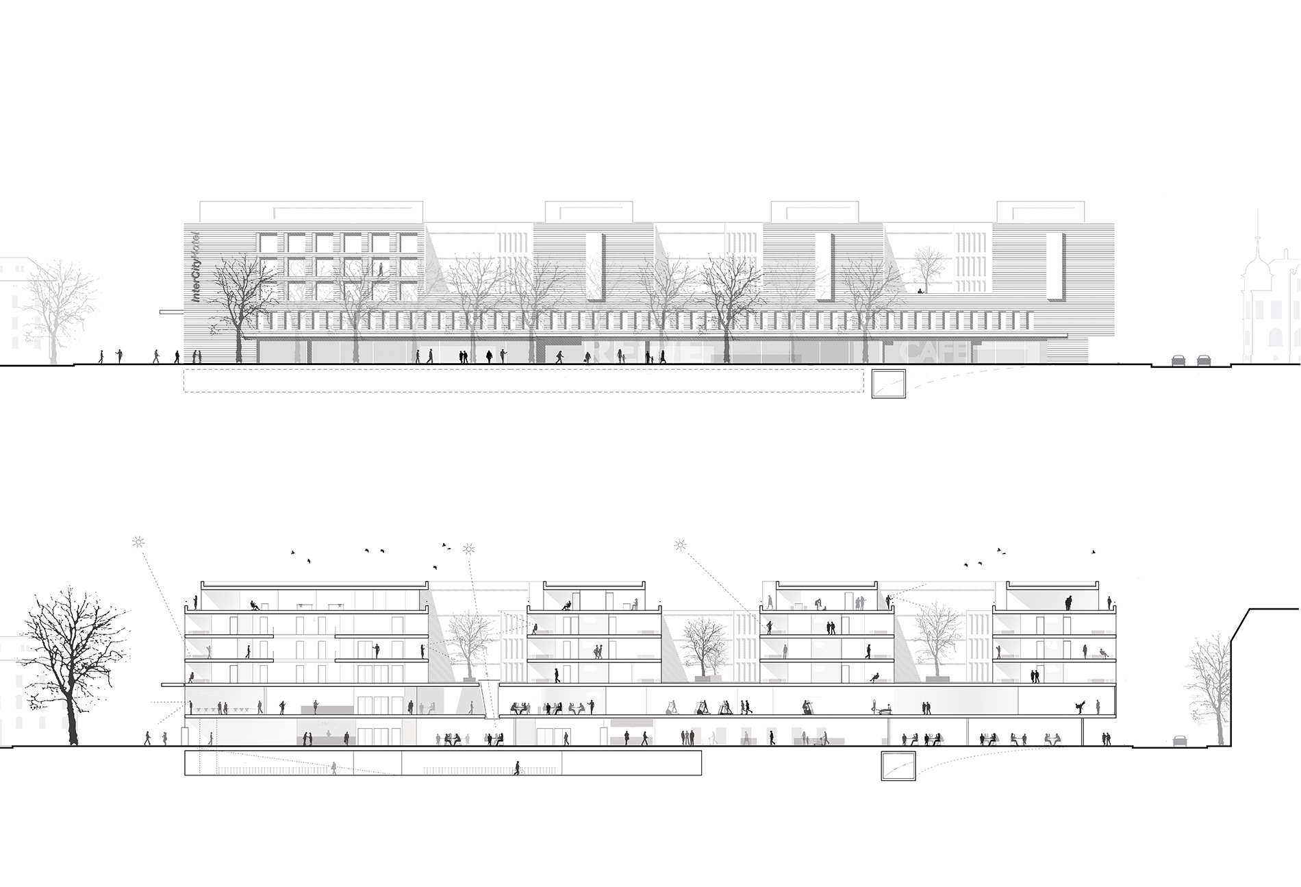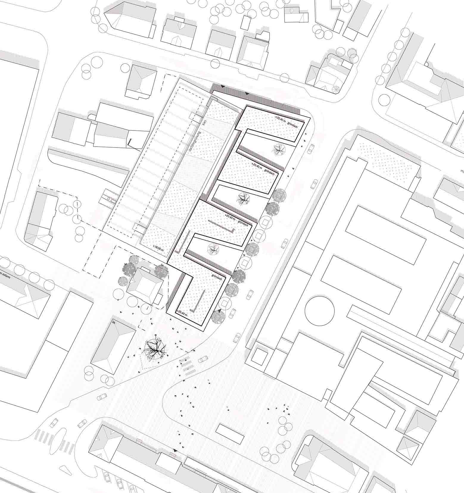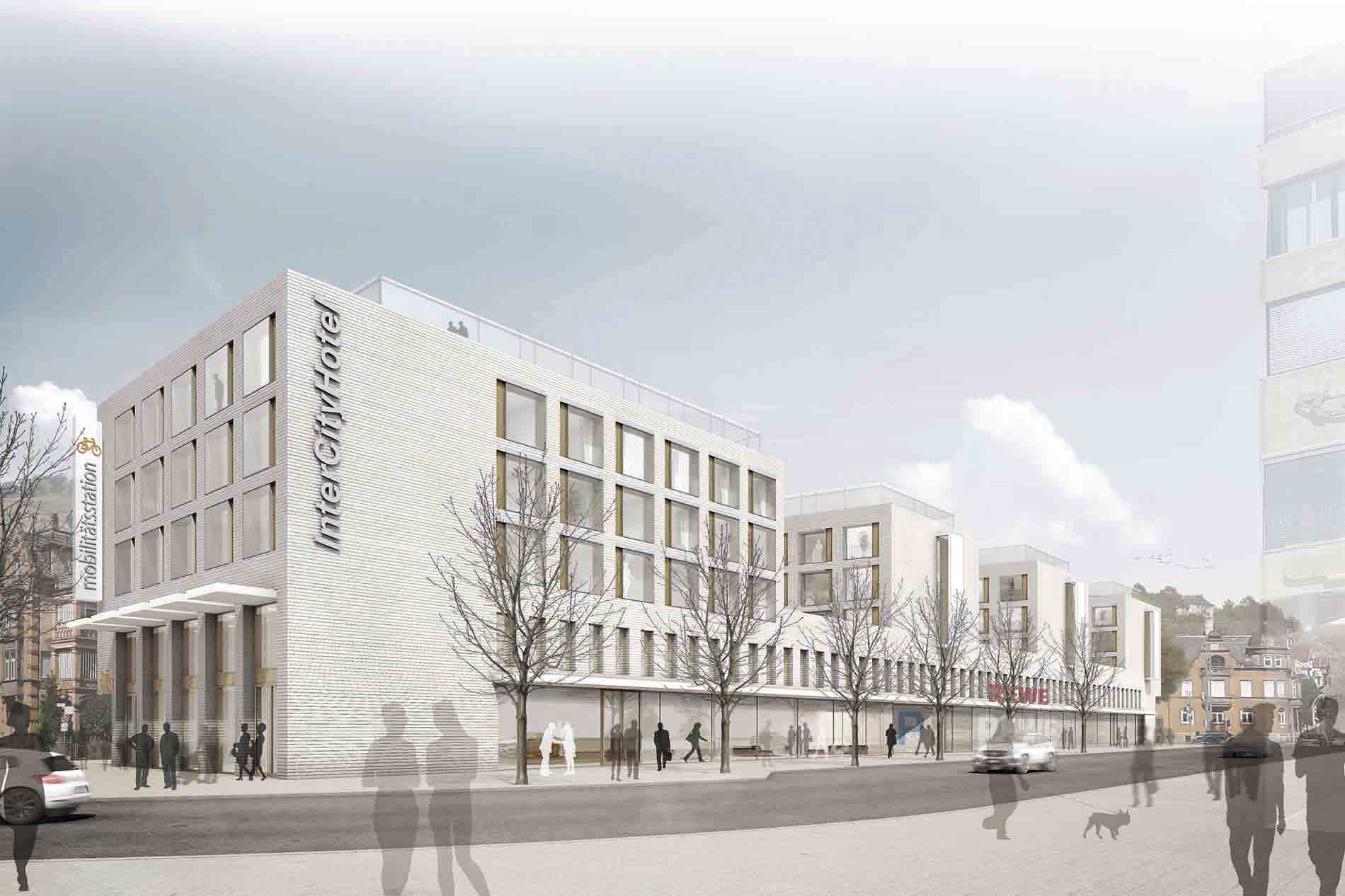 Das Gebäudeensemble vermittelt volumetrisch und gestalterisch zwischen den großen Stadtbausteinen wie dem Es und der kleinteiligeren Struktur der Stadterweiterung aus dem 19. Jahrhundert. Es ergänzt die stadträumlich notwendigen Raumkanten des Platzes und sorgt für eine wohltuende Maßstäblichkeit. Das komplexe Raumprogramm sieht ganz unterschiedliche Funktionen wie Hotel, Büro- und Wohnräume, Gastronomie und Handel vor, die alle unter „einem Dach“ vereint werden. Der hybride Neubau wird als ein „gewachsener“ Teil der Stadt verstanden. Das Erdgeschoss mit Ladenflächen, Gastronomiebereichen und Hotelnutzung verbindet den Stadtraum mit den darüber liegenden Ebenen und schafft eine angemessene Distanz zwischen Öffentlichkeit und Privatheit. Innenhöfe sorgen für eine ruhige, kontemplative Atmosphäre.