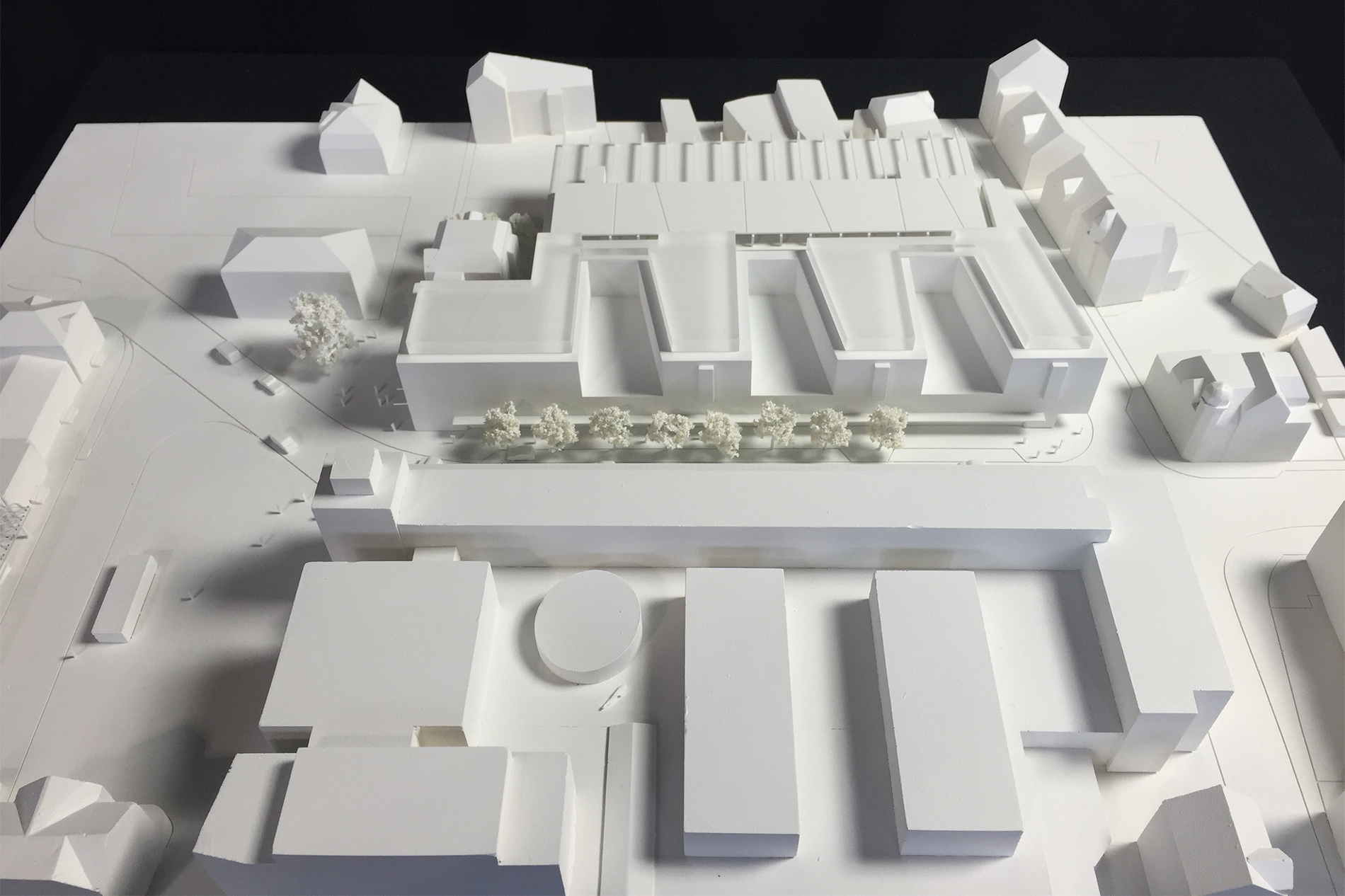 Der Neubau versucht, in der Auseinandersetzung zwischen Gewohntem und Neuem, die Akzeptanz bei Bürgern und Bewohnern zu erhöhen. Klassische Motive aus der Esslinger Weststadt wie zum Beispiel die Materialwahl (heller, ockerfarbener Ziegel) für die Fassaden werden aufgenommen und neu interpretiert. Sie vermitteln auch innerhalb des Gebäudeensembles, so dass keine Brüche zwischen den unterschiedlichen Nutzungsbereichen auftreten.