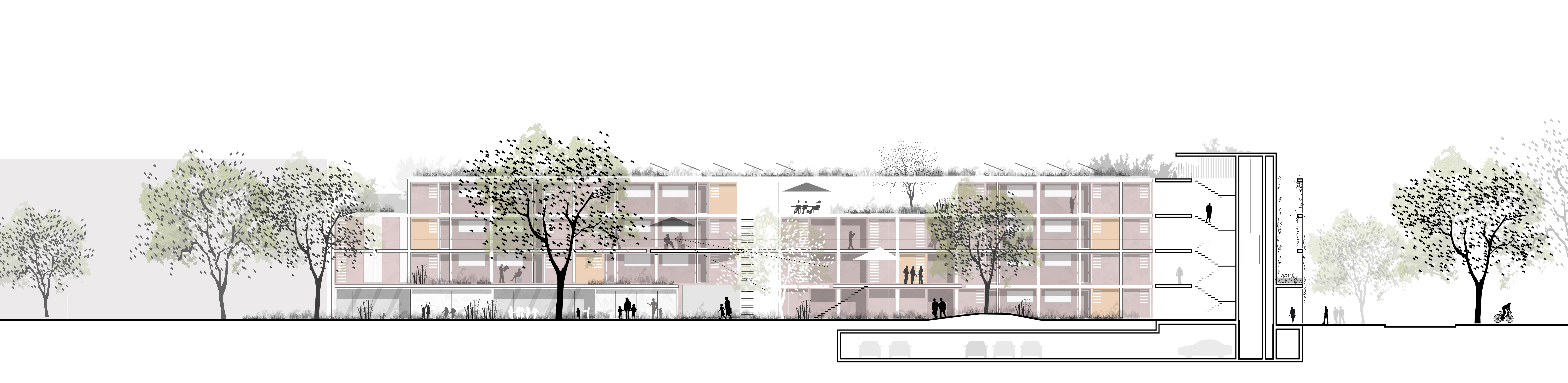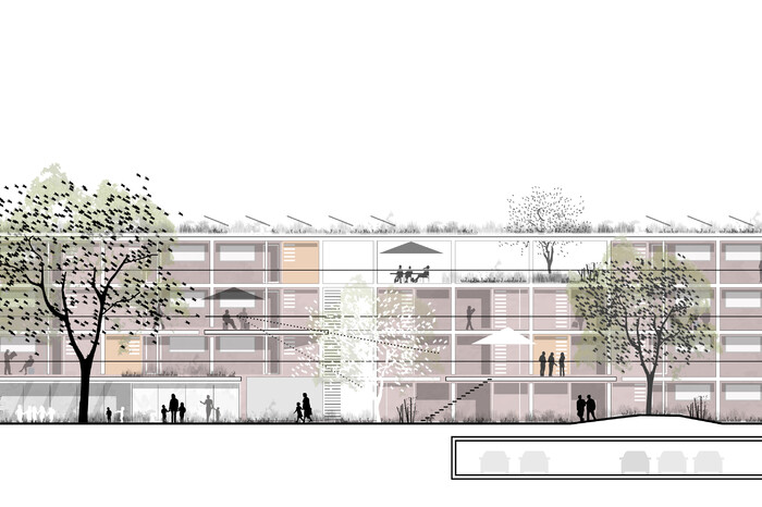 Typologisch wird die in Ansätzen vorhandene Blockrandbebauung aufgegriffen und weitergeführt. Die neue Bebauung schafft durch klare Raumkanten klar definierte Straßenräume und einen ruhigen, begrünten Innenhof, die sogenannte „Grüne Mitte“, die als geschlossener Außenraum mit hoher Aufenthaltsqualität genutzt werden kann und Orte der Identifikation und Kommunikation schafft.