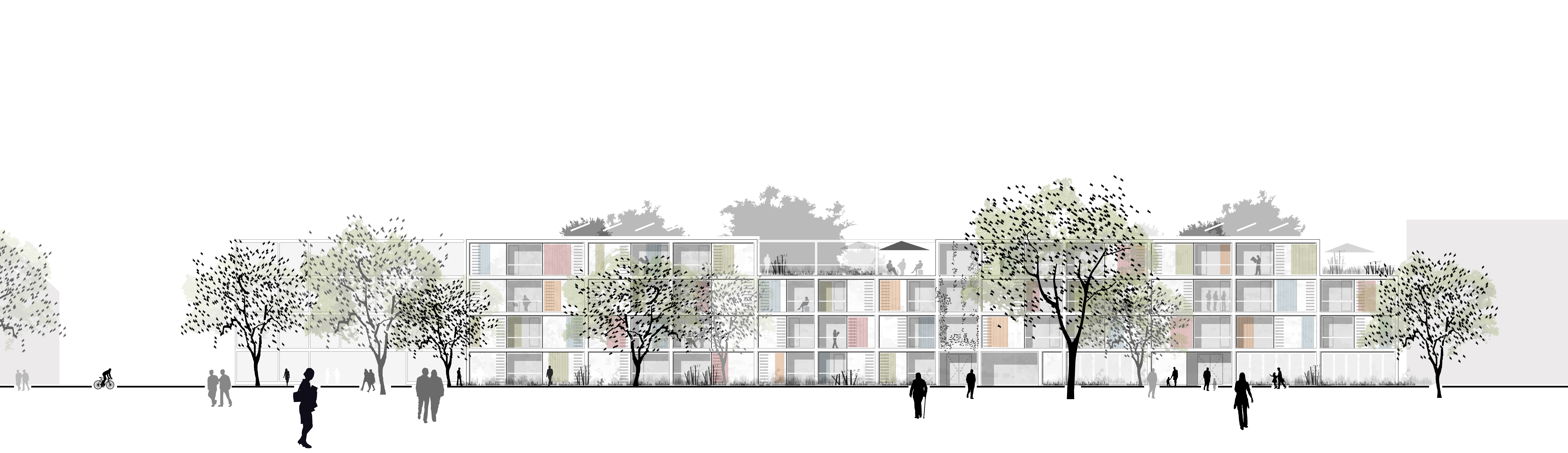 Alle Wohnungen sind nach mehreren Seiten ausgerichtet, wodurch optimale Belichtungs- und Belüftungsverhältnisse für alle Räume gegeben sind und infolgedessen eine hohe Wohnqualität entsteht. Jede Wohnung verfügt über einen Freibereich in Form einer möblierbaren Loggia bzw. Terrasse. Die Loggien sowie differenzierte Gebäudehöhen gliedern und rhythmisieren die Blockrandbebauung.