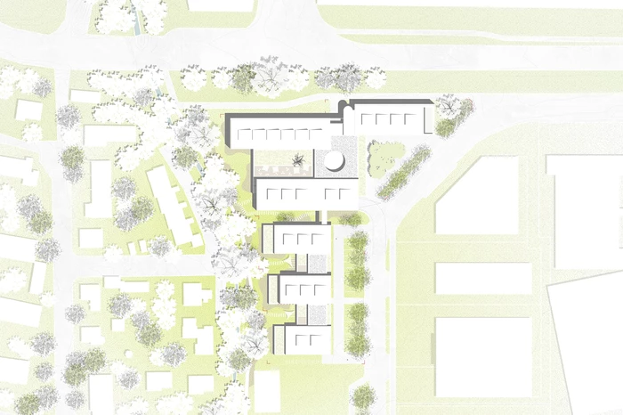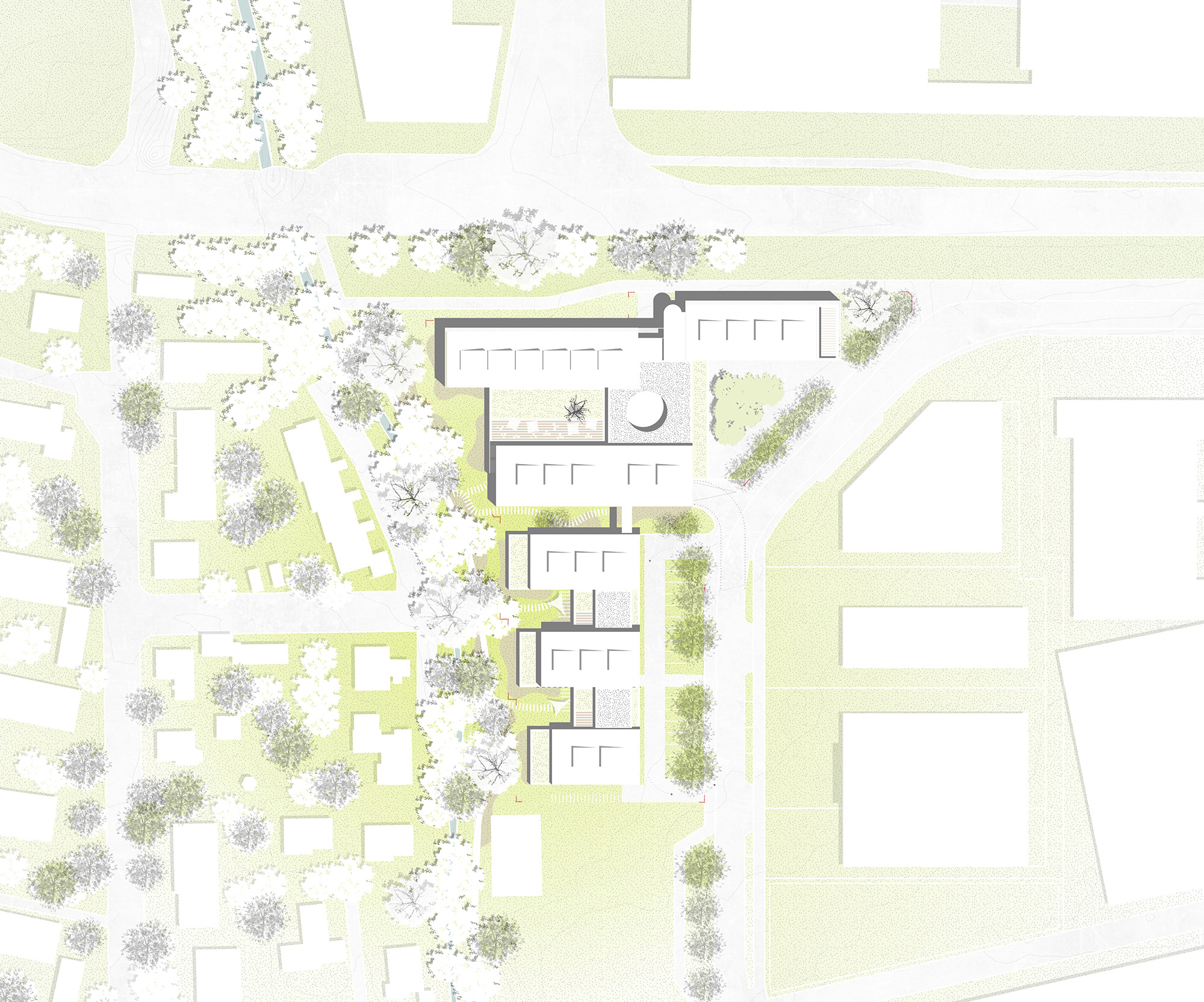 Entsprechend den Vorgaben des Bebauungsplans, der eine offene Bauweise vorsieht, wird ein Gebäudeensemble entwickelt, das aus ablesbaren, additiven Baukörpern besteht. Die Differenzierung wird durch Variationen in der Höhenentwicklung, Staffelungen entlang der Baugrenzen und Einschnitten in die Bauvolumen erreicht. Auf diese Weise entstehen im Hinblick auf die Außenbereiche sowohl öffentliche als auch private Freiräume mit unterschiedlichen Aufenthaltsqualitäten, die eine Verzahnung mit dem Grünzug am Weilersbach bewirken.