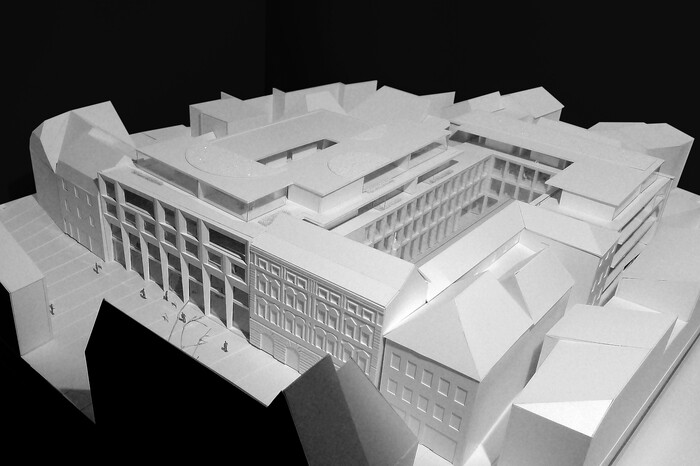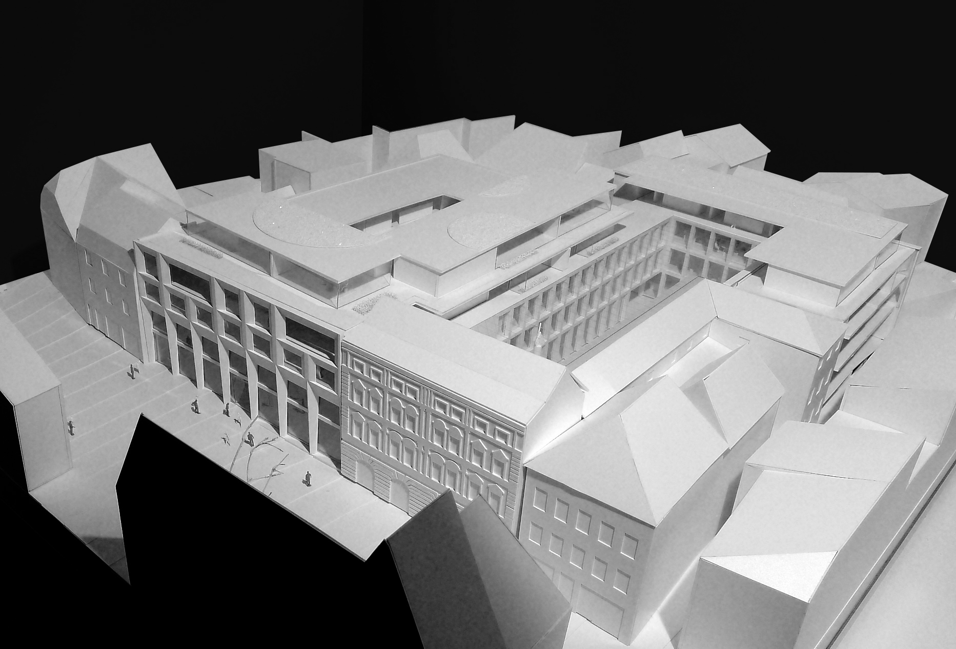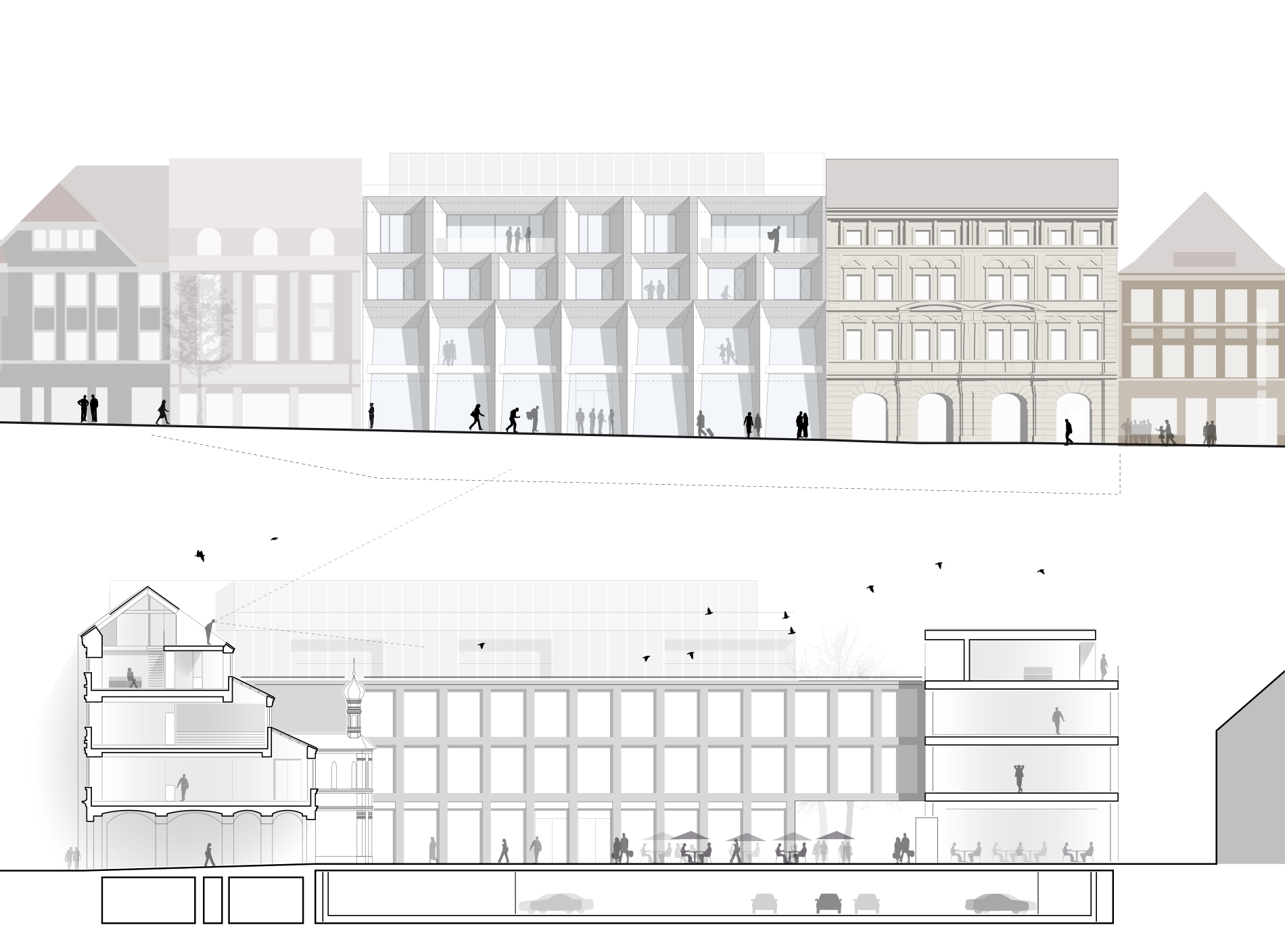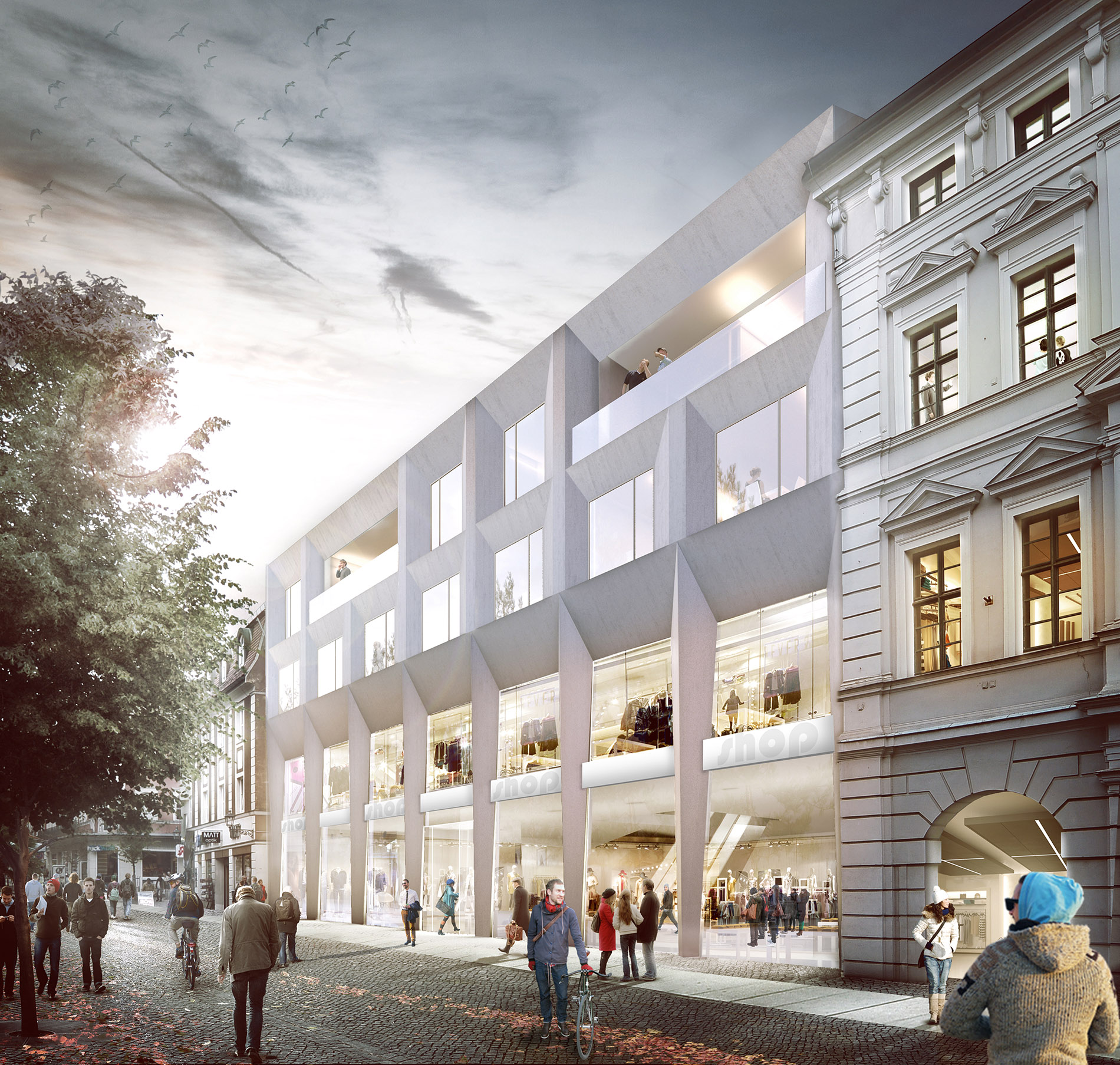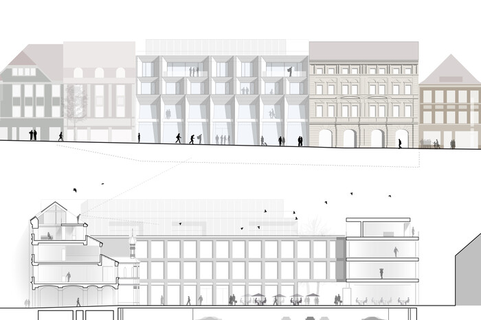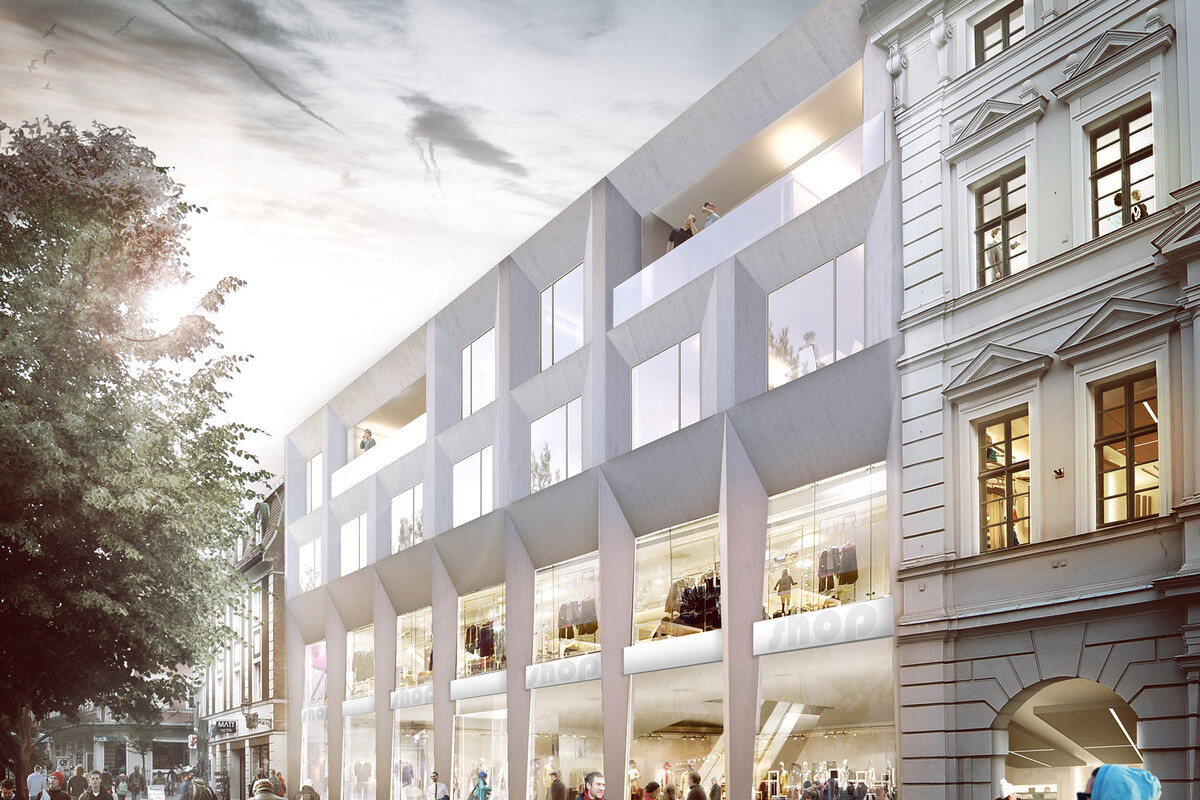 Das geforderte Bauvolumen für das Wohnen verteilt sich über zwei Etagen auf dem „Dach“. Hierdurch wird eine angemessene bauliche Körnung erreicht und eine engere Verzahnung mit dem historischen Stadtgefüge. Es entsteht eine „Dachlandschaft“, die ein ausgewogenes Verhältnis zwischen Außen- und Innenräumen schafft. Unter den Wohngeschossen liegt die Verwaltungsebene, im Erd- und ersten Obergeschoss Ladenflächen und Einkaufsbereiche. Die Fassadengestaltung nimmt klassische Motive aus der Amberger Altstadt auf, wie zum Beispiel die Fassadenstrukturen mit Sockelzonen oder die umrahmten Fensterflächen, und interpretiert diese neu.