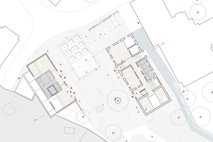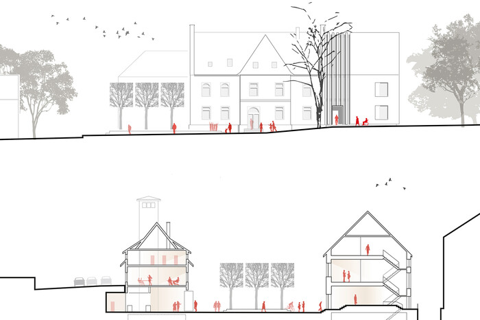 Das im neogotischen Stil erbaute Rathaus wird als ein starker städtebaulicher Akzent erhalten und in südlicher Richtung erweitert. Alt- und Neubau sind durch eine Fuge getrennt bzw. verbunden, die einen barrierefreien Zugang herstellt. Der bestehende Haupteingang bleibt als Identifikationsmerkmal erhalten. Im Inneren werden die vorhandenen Strukturen aufgegriffen und behutsam an die neuen funktionalen Anforderungen angepasst. Im ehemaligen Feuerwehrhaus liegen auf Platzebene die Touristeninformation und der multifunktionale Veranstaltungsraum, der mittels großer Öffnungen einen fließenden Übergang zwischen Innen- und Außenraum zulässt. Aktivitäten auf dem Platz lassen sich unproblematisch ins Innere verlagern und umgekehrt, was zwangsläufig zu einer weiteren Belebung der Fläche führt.
