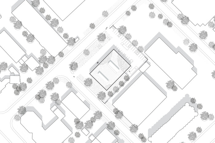 Um die Eigenständigkeit und besondere Stellung des Neubaus zu unterstreichen, wird auf das Aufgreifen vorhandener Raumkanten bewusst verzichtet. Die Positionierung auf dem Grundstück ist so gewählt, dass durch breite vorgelagerte Grünflächen ein großzügiger Abstand zu den Straßenräumen entsteht. Die dadurch erzielte Fernwirkung unterstützt den Wunsch nach einer Inszenierung des Marken-Auftritts.