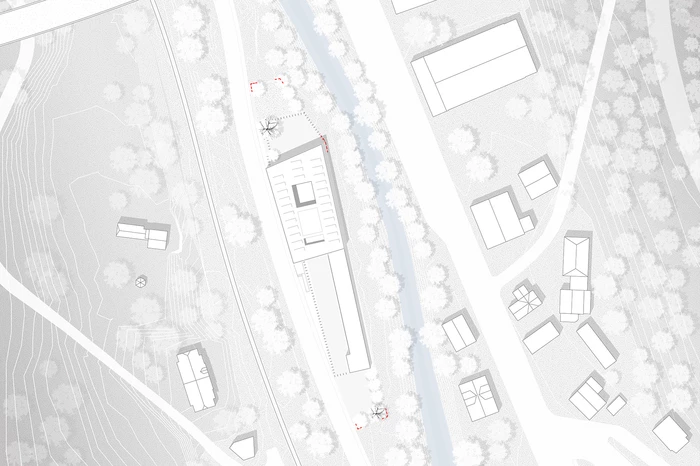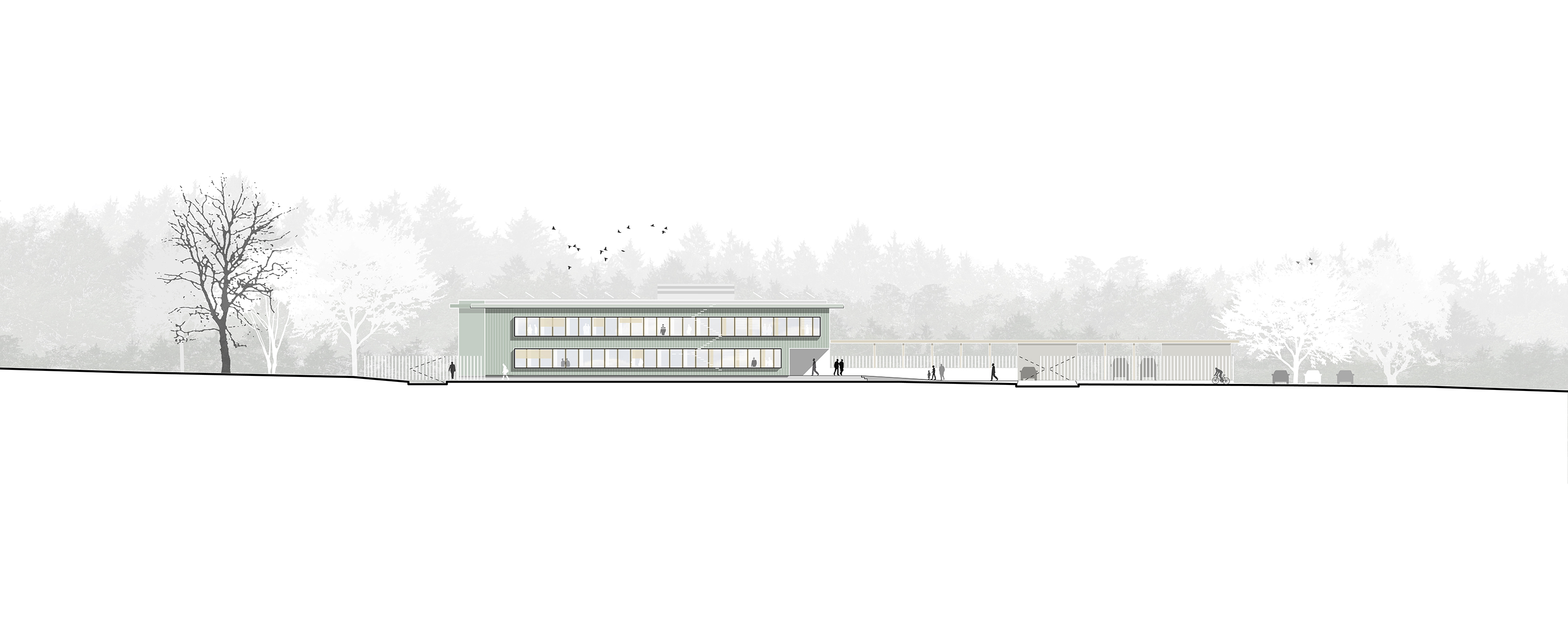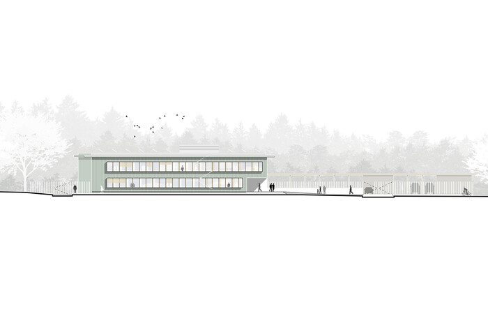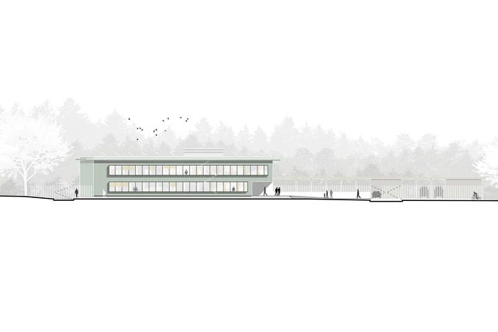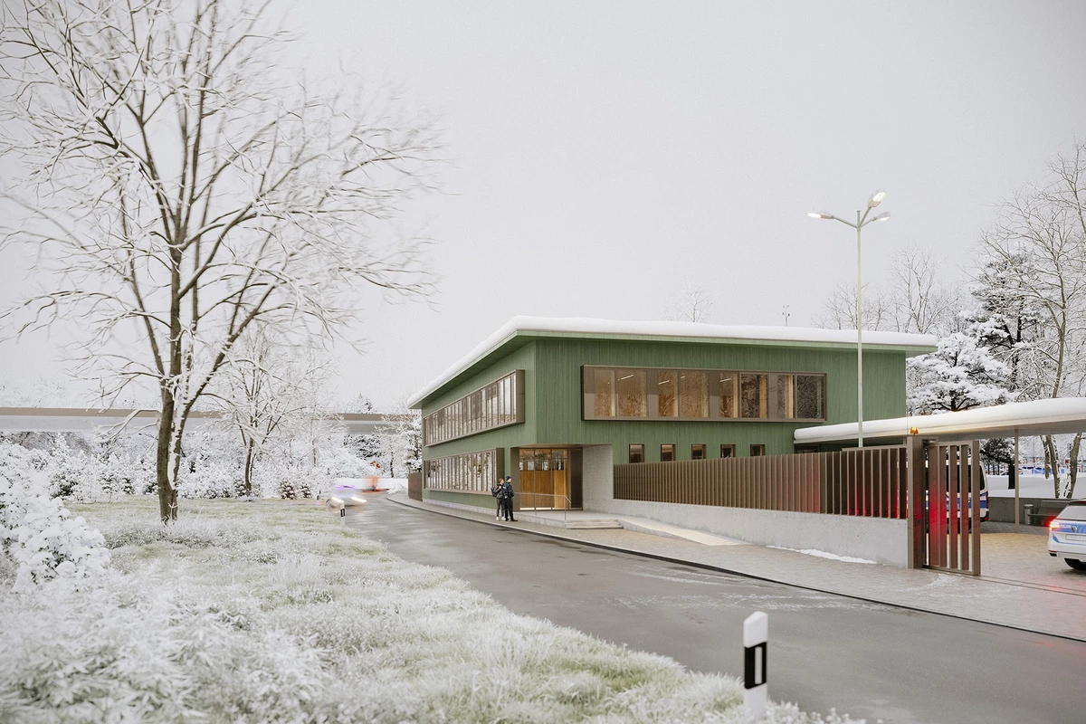 Im Kontrast zu den ortprägenden linearen Elementen wie Fluss, Straße und Bahntrasse, die parallel zueinander verlaufen, wird der Neubau als punktueller Baukörper und markanter Stadtbaustein konzipiert. Die kompakte Gebäudeform schafft auch außerhalb des Ortszentrums die für ein Polizeirevier erforderliche Präsenz und Prägnanz. Darüber hinaus werden kurze innere Erschließungswege generiert und der ökologische Fußabdruck minimiert. Die 2-Geschossigkeit erzeugt eine dem Ort und der Funktion angemessene Maßstäblichkeit. Im Süden schließt sich an das Gebäude ein längs gerichteter, die Form des Grundstücks optimal ausnutzender eingeschossiger Baukörper an, der die Stellplätze der Dienstfahrzeuge aufnimmt und gleichzeitig Teil der Einfriedung des Polizeihofes ist. Der Neubau wird über die Otto-Merz-Straße erschlossen. Der Haupteingang liegt im Süden und ist in Richtung der Neustädter Altstadt orientiert. Es entsteht eine eindeutige Eingangssituation mit klarer Adressbildung.
