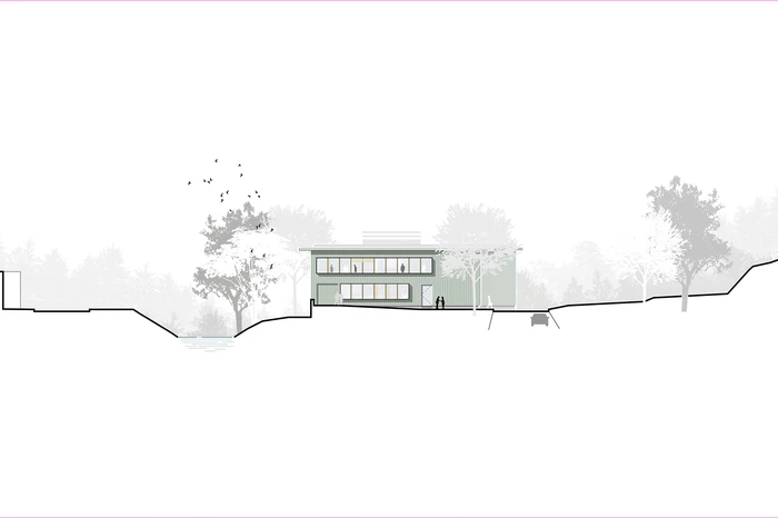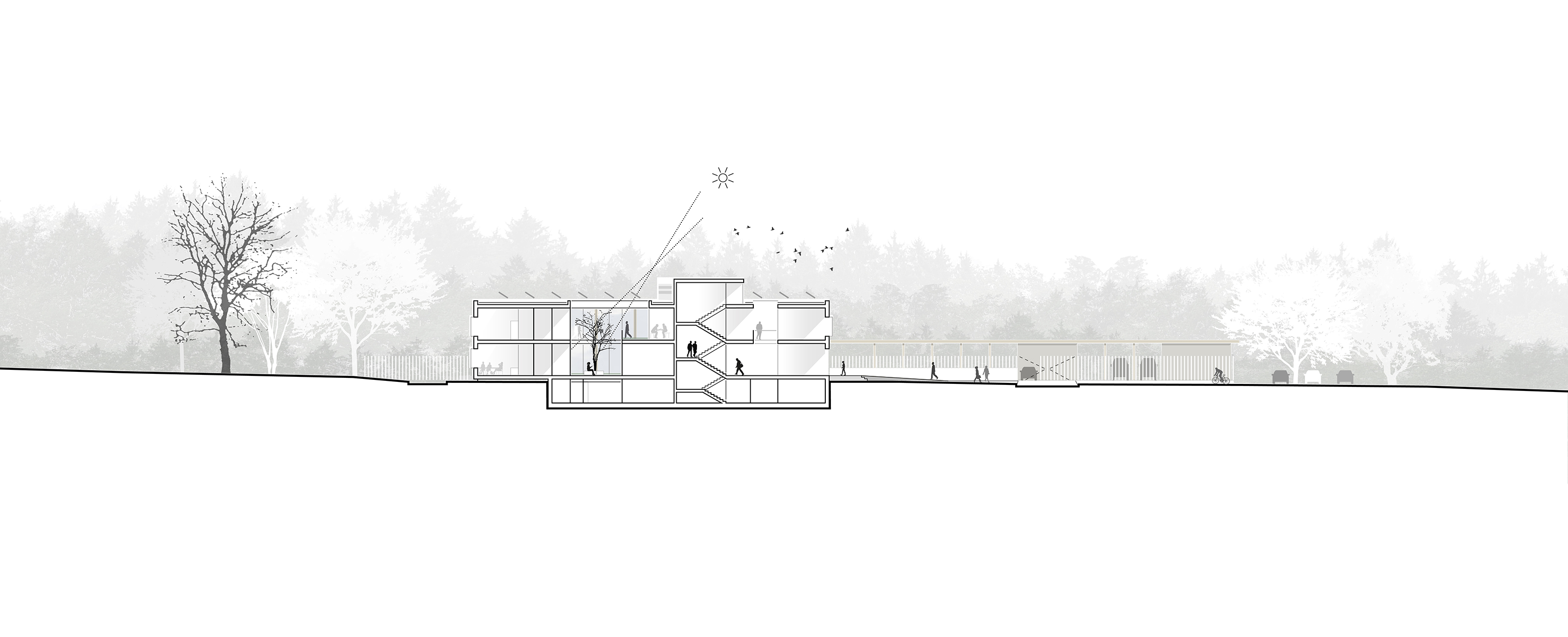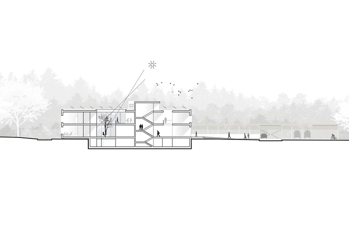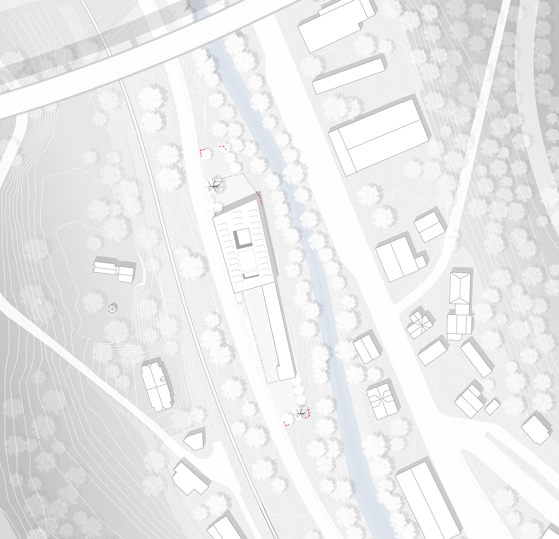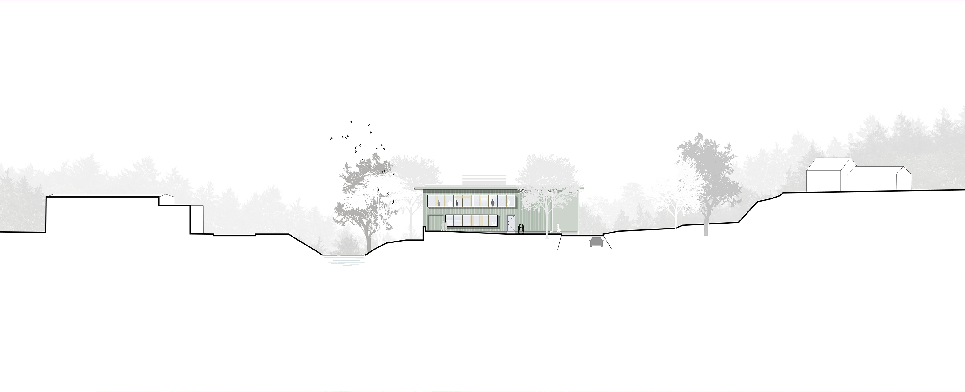 Im Kontrast zu den ortprägenden linearen Elementen wie Fluss, Straße und Bahntrasse, die parallel zueinander verlaufen, wird der Neubau als punktueller Baukörper und markanter Stadtbaustein konzipiert. Die kompakte Gebäudeform schafft auch außerhalb des Ortszentrums die für ein Polizeirevier erforderliche Präsenz und Prägnanz. Darüber hinaus werden kurze innere Erschließungswege generiert und der ökologische Fußabdruck minimiert. Die 2-Geschossigkeit erzeugt eine dem Ort und der Funktion angemessene Maßstäblichkeit. Im Süden schließt sich an das Gebäude ein längs gerichteter, die Form des Grundstücks optimal ausnutzender eingeschossiger Baukörper an, der die Stellplätze der Dienstfahrzeuge aufnimmt und gleichzeitig Teil der Einfriedung des Polizeihofes ist. Der Neubau wird über die Otto-Merz-Straße erschlossen. Der Haupteingang liegt im Süden und ist in Richtung der Neustädter Altstadt orientiert. Es entsteht eine eindeutige Eingangssituation mit klarer Adressbildung.