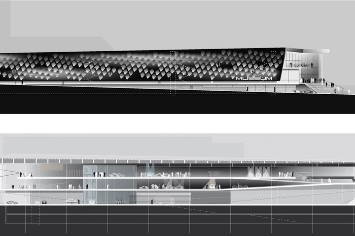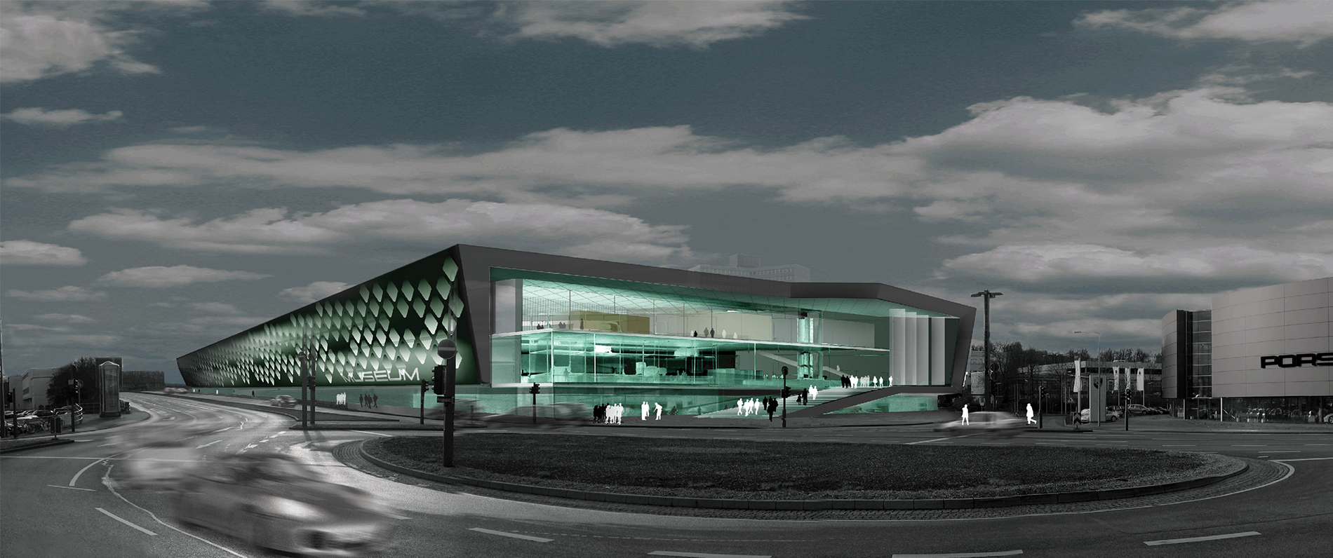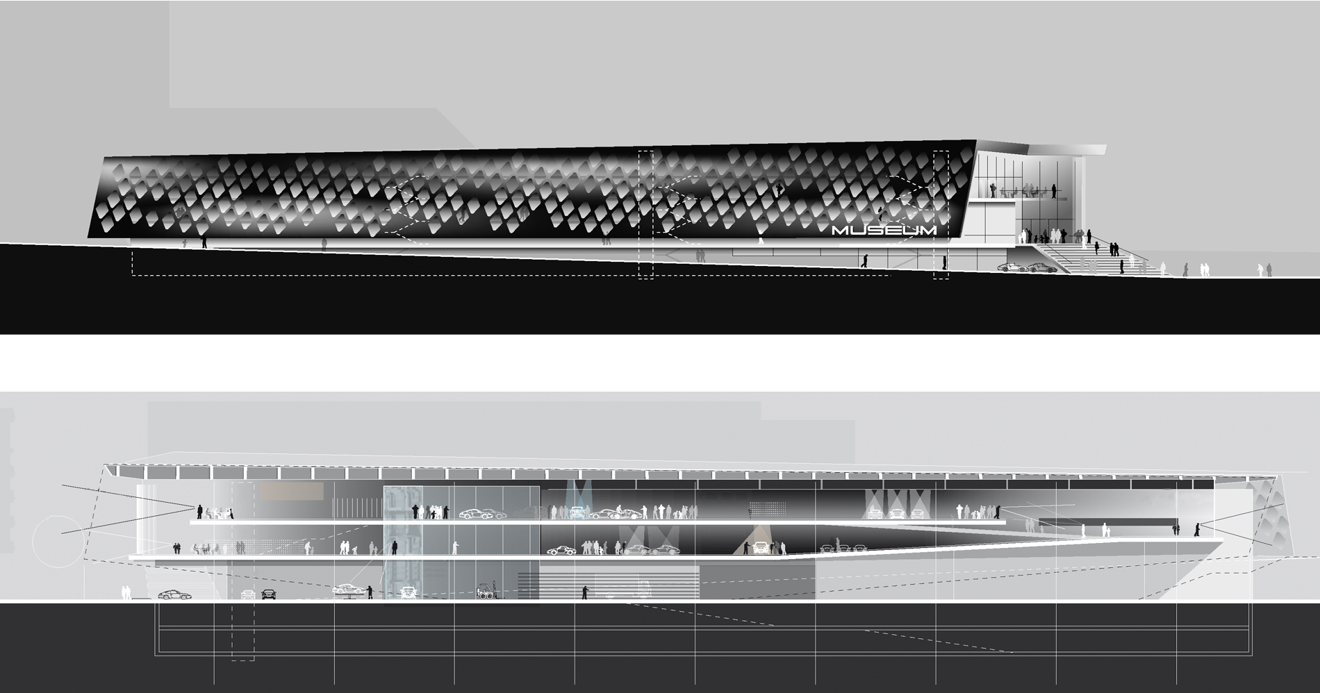 Ein horizontaler, liegender Baukörper mit einer großen Raumschale transformiert Motive wie Schnelligkeit, Dynamik und Design des Produktes in Architekturmotive: Fahrzeugkarosserie - Raumschale, Chassis - Basis etc. Diese Raumschale (Karosserie) legt sich über einen flächig konzipierten Museumsraum (Black - Box). Die Schale löst sich von der Basis (Chassis) und schwebt über dem Grundstück. Die freitragende Konstruktion überspannt große Teile der Museumsfläche. Dies schafft großflächig stützenfreie Ausstellungsbereiche. Die Textur der „atmenden Haut“ ist innen wie außen multifunktional und kann auf unterschiedliche Situationen und Ansprüche dynamisch reagieren: offen - geschlossen, starr- beweglich, Energie sammelnd, Licht transportierend, usw. Die Ausstellungsebenen sind in die Raumschale frei eingestellt und von den begrenzenden Raumwänden abgelöst. Eine wichtige räumliche Attraktion zwischen Event/Empfangsbereich/Ausstellung einerseits und Werkstatt andererseits - als Inszenierung des „Objekttausches“ - ist das „befahrbare Autoregal“ (Zwischendepot) als gläserne Vitrine in allen Ebenen erlebbar.