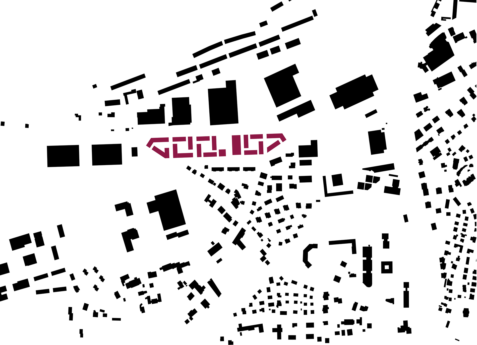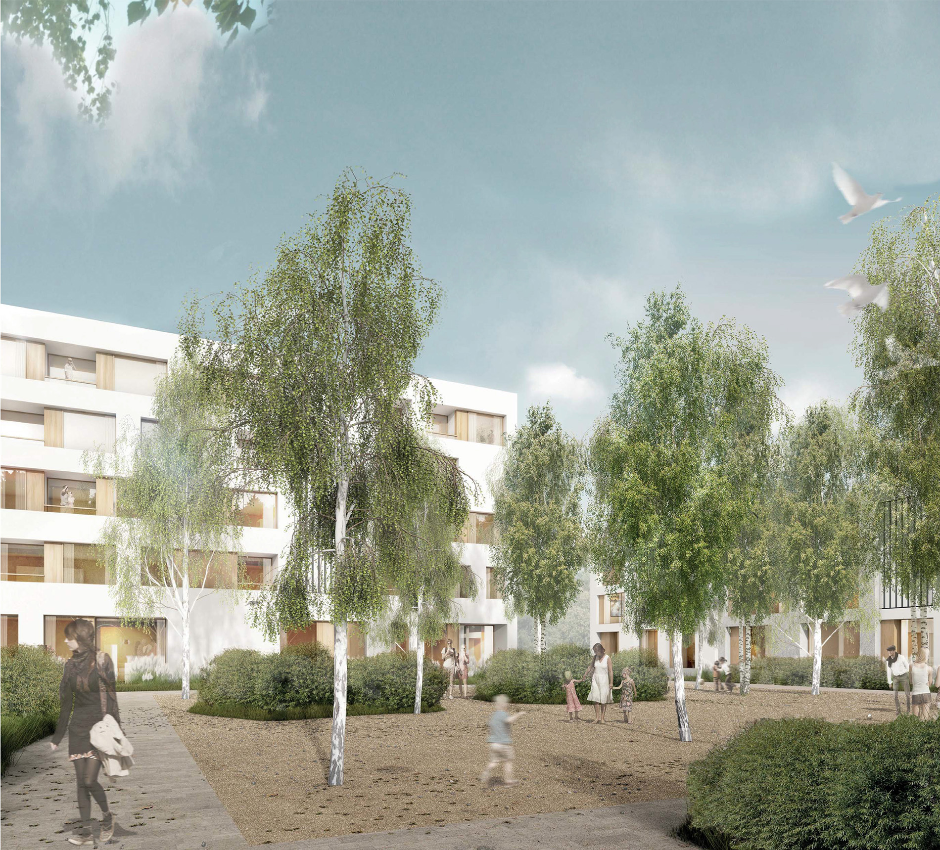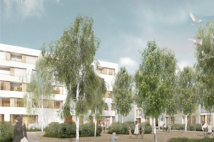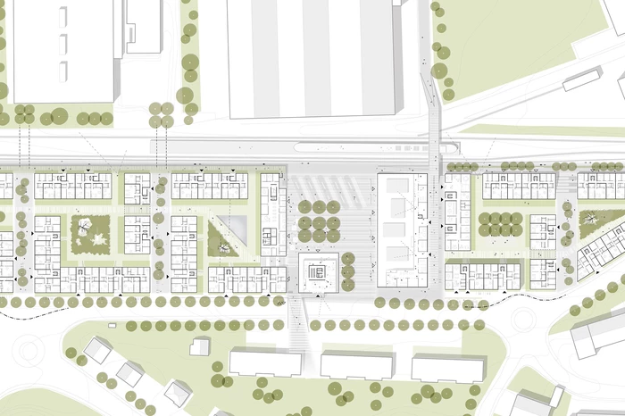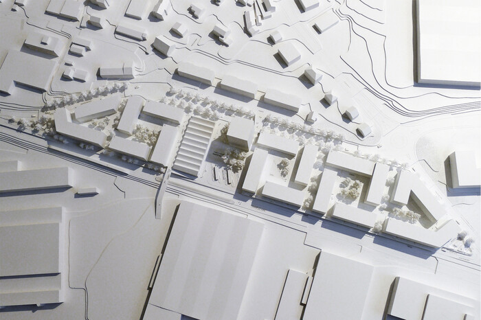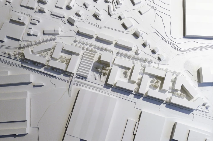Ziel ist es, mit einer offenen Blockrandstruktur zwischen diesen beiden Polen zu vermitteln. Durch die bauliche Gliederung entstehen maßstäblich angemessene, identitätsstiftende Einheiten, die jeweils um einen begrünten Hof gruppiert sind. Alle Wohnungen sind mit Blick nach Süden oder Westen ausgerichtet. Ein zentraler Platz, der die topografisch bedingten unterschiedlichen Ebenen miteinander verbindet, bildet den Mittelpunkt des Quartiers. Sowohl die dort angesiedelten Funktionen als auch die Höhenentwicklung der Gebäude unterstreichen den öffentlichen Charakter dieses Raumes.