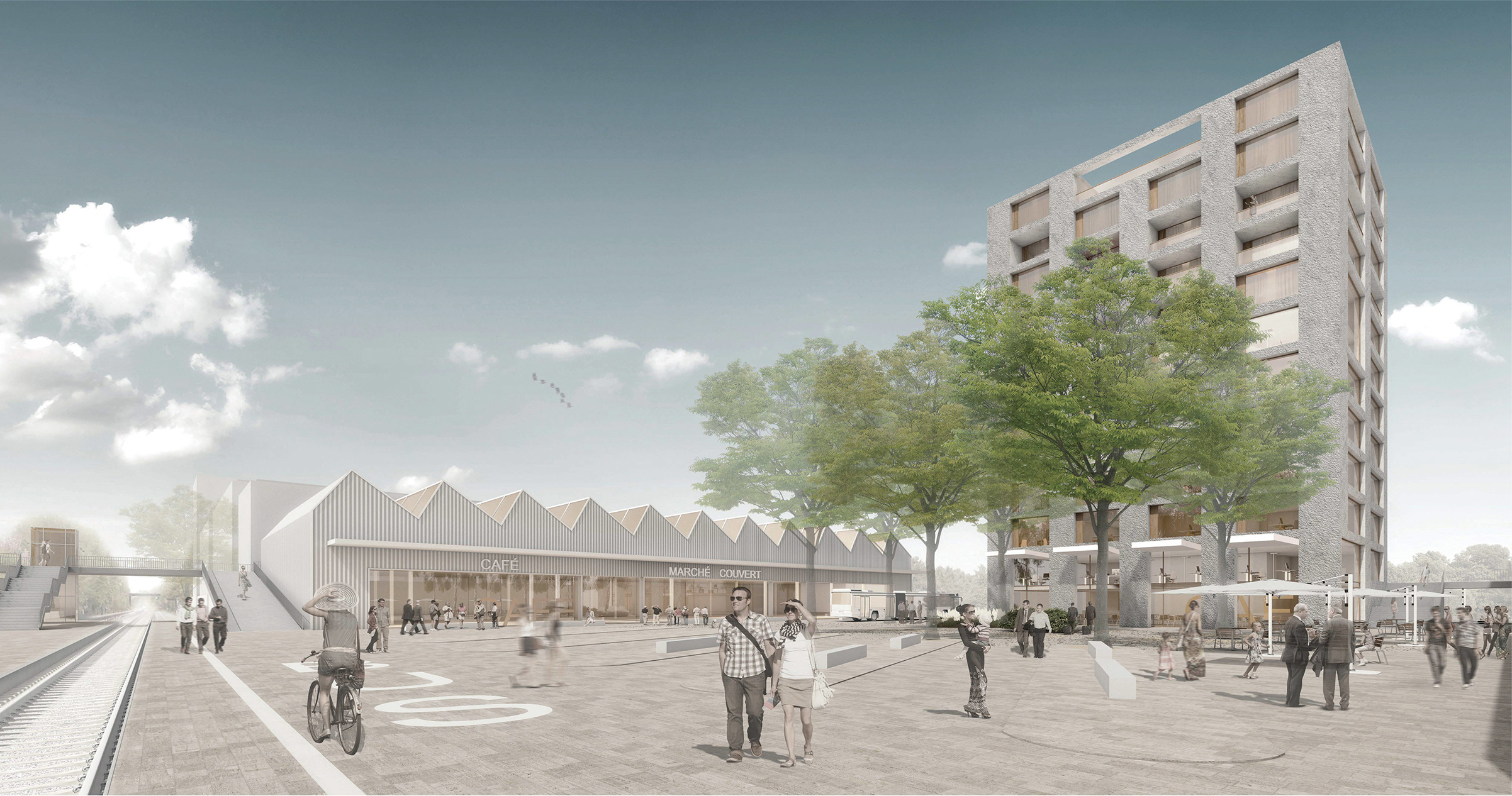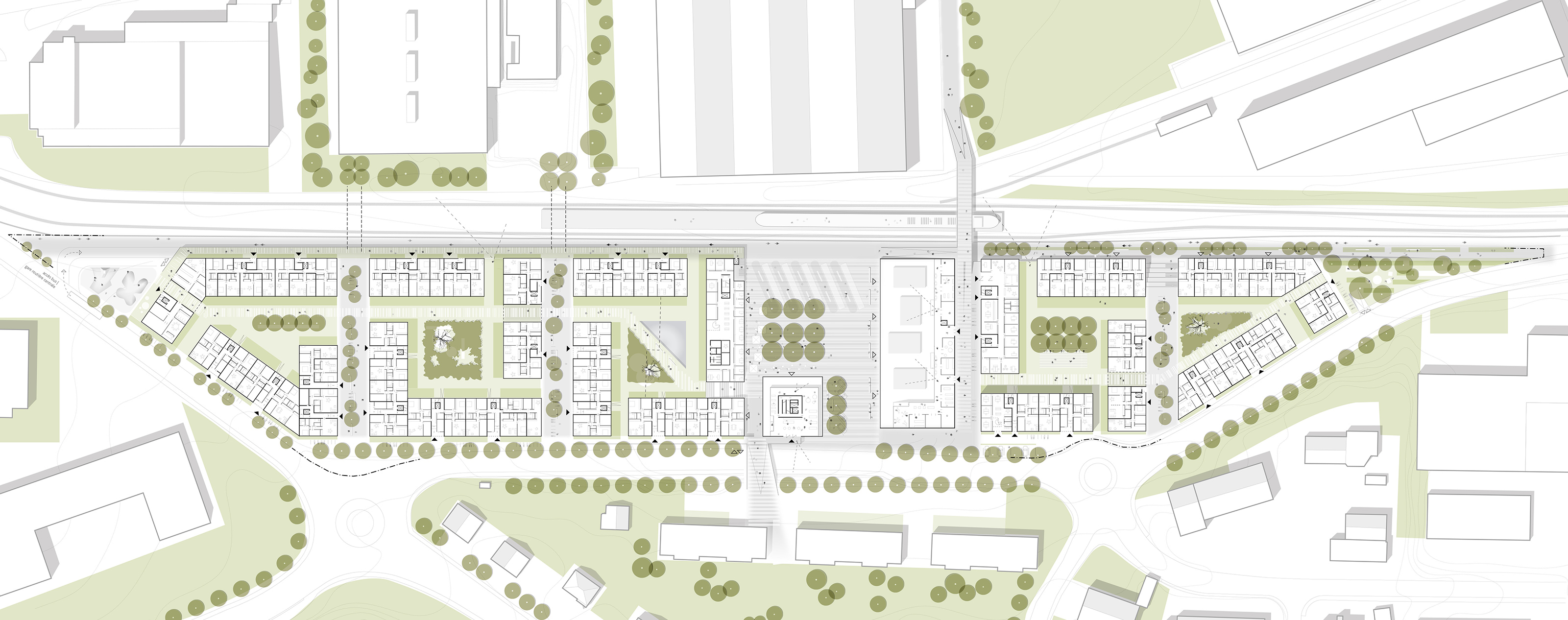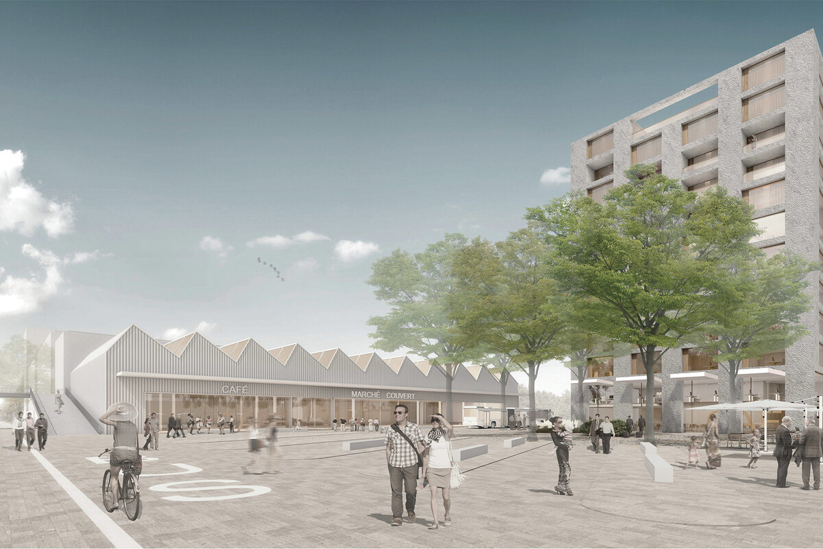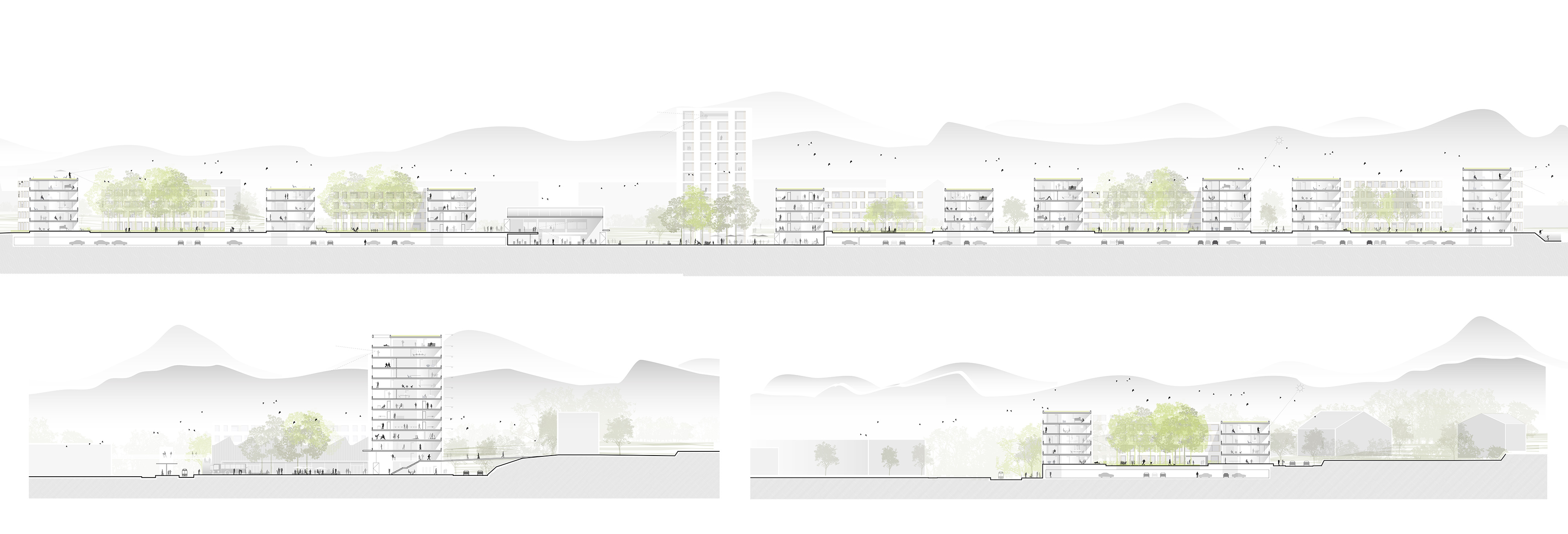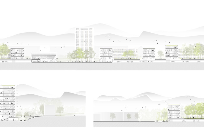 Die Topografie des nach Norden abfallenden Geländes wird genutzt, um auf der Ebene des zukünftigen SBB-Bahnhofes Sekundärfunktionen wie Parkplätze, Keller- und Abstellräume zu platzieren, während auf einem gebauten, künstlichen Plateau die neue Bebauung verortet wird.