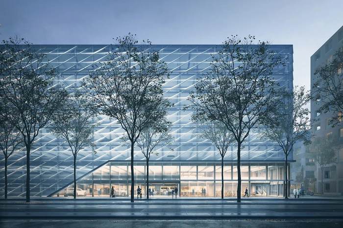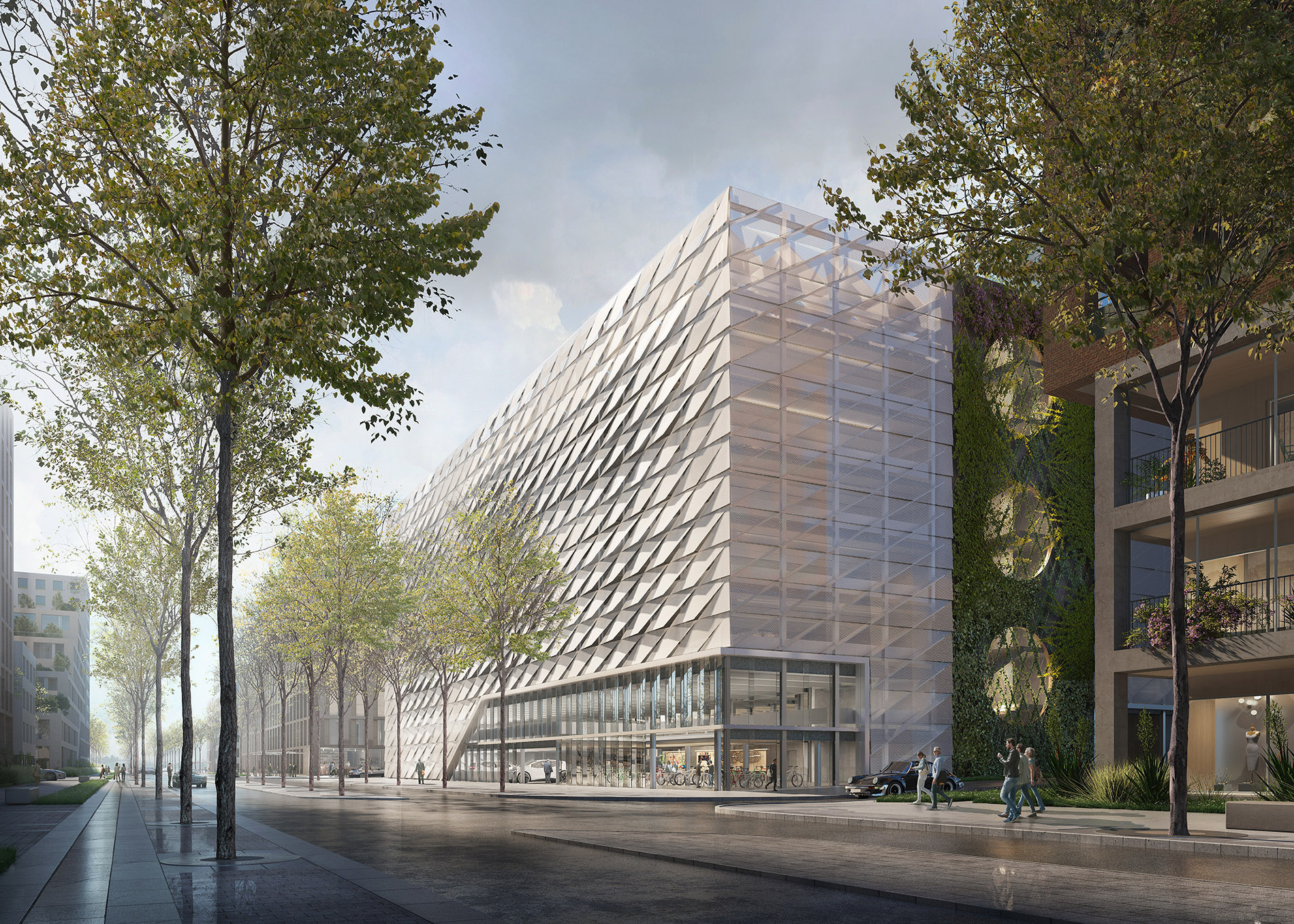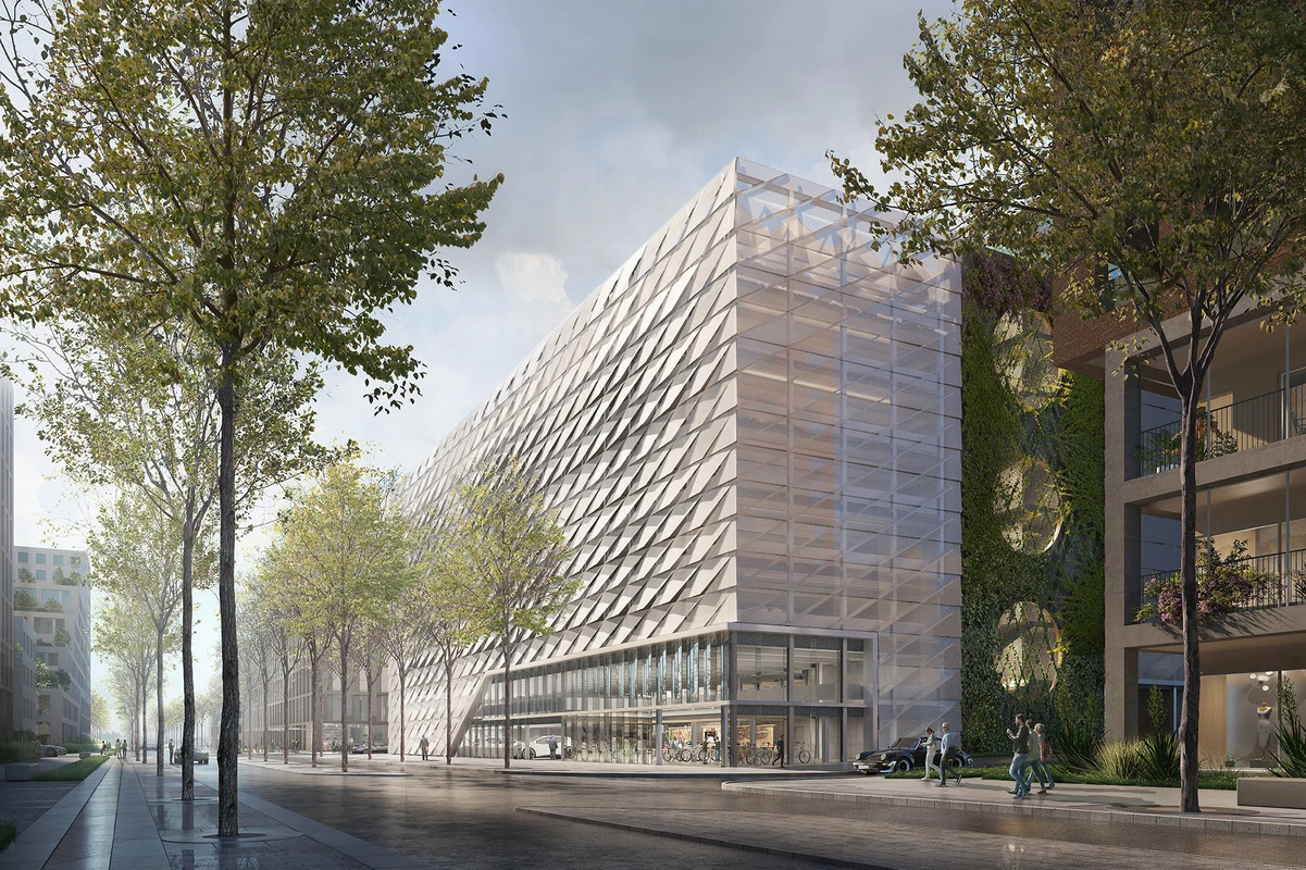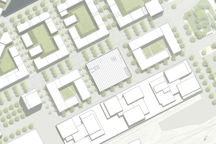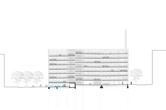 Die Quartiersgarage zeigt sich im neuen Areal des Neckarbogens als besonderer Stadtbaustein. Das Parkhaus fügt sich als selbstbewusstes Funktionsgebäude in den stadträumlichen Kontext ein und setzt durch seine Materialisierung einen bewussten Akzent im Quartier. Die optimale Funktionsweise wird durch klare, übersichtliche Wegeführungen, sowie eine offene, freundliche Anmutung des Baukörpers durch Farbgebung und Lichtführung gewährleistet. Neben dem klassischen Parken beinhaltet die Quartiersgarage eine Mobilitätsstation und eine Energiezentrale. Die Fassadengestaltung generiert ein individuelles Erscheinungsbild, das mit ihrer Reminiszenz an die frühere Geschichte des Ortes Identität stiftet.