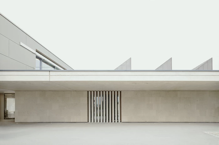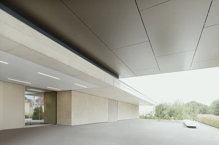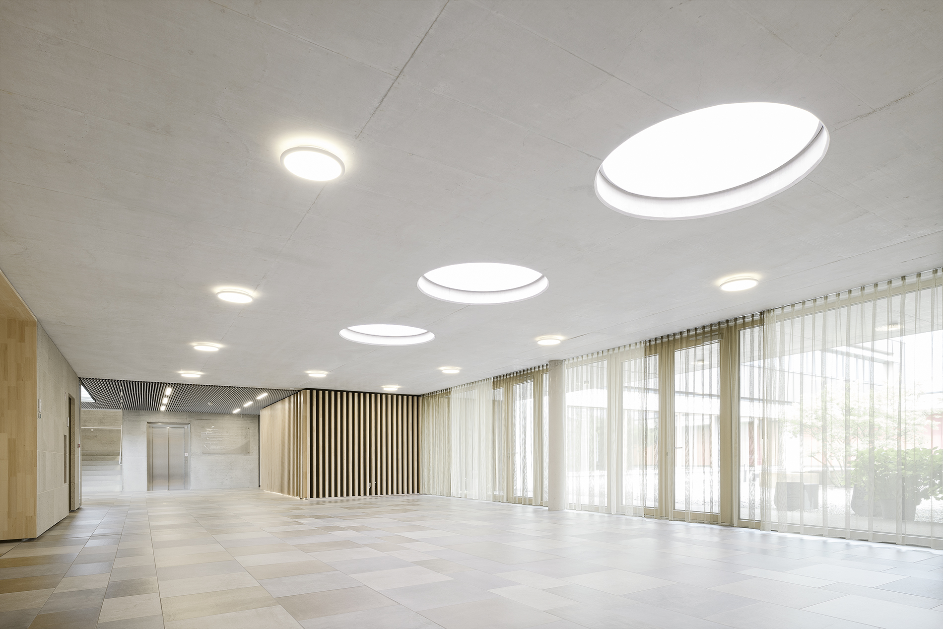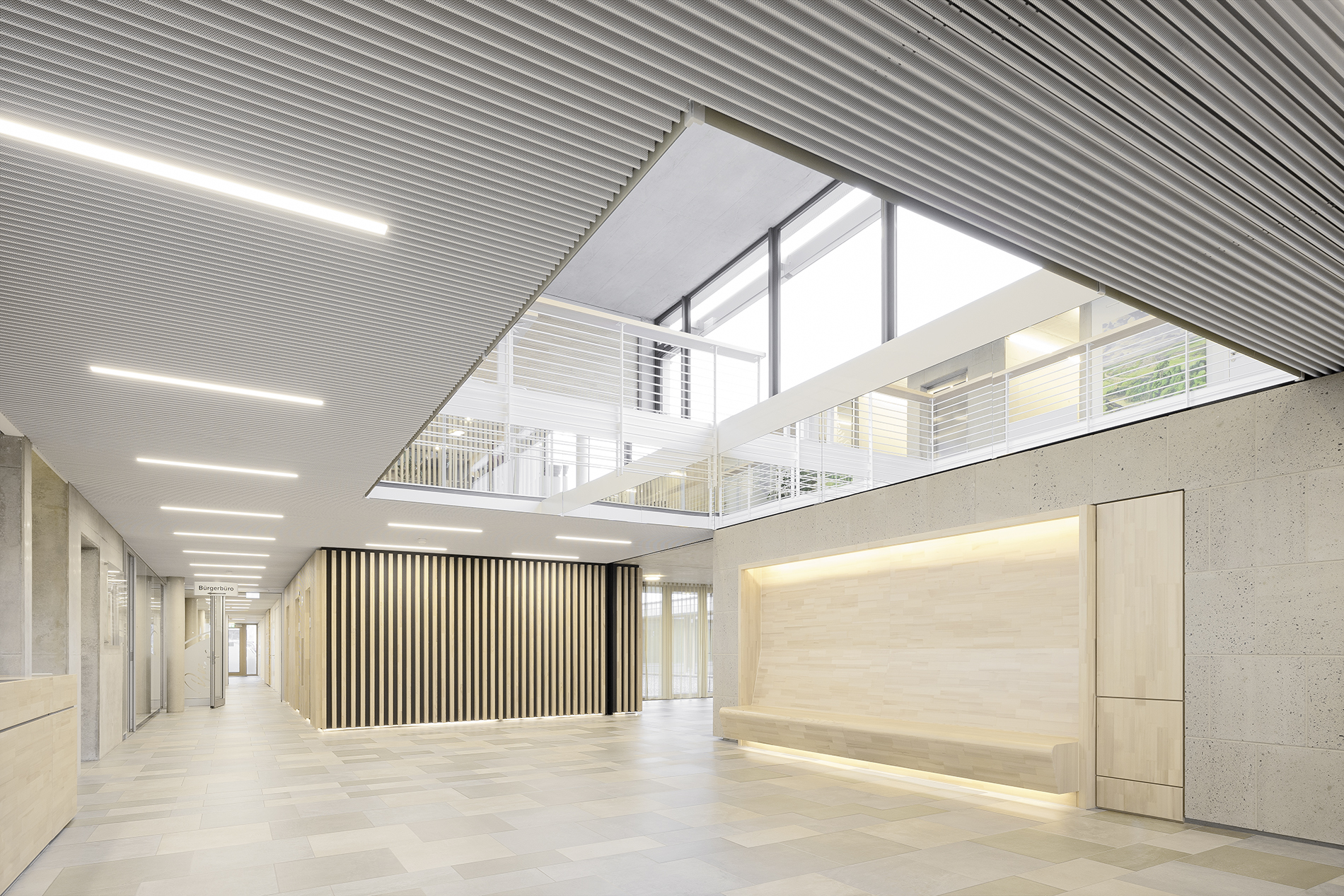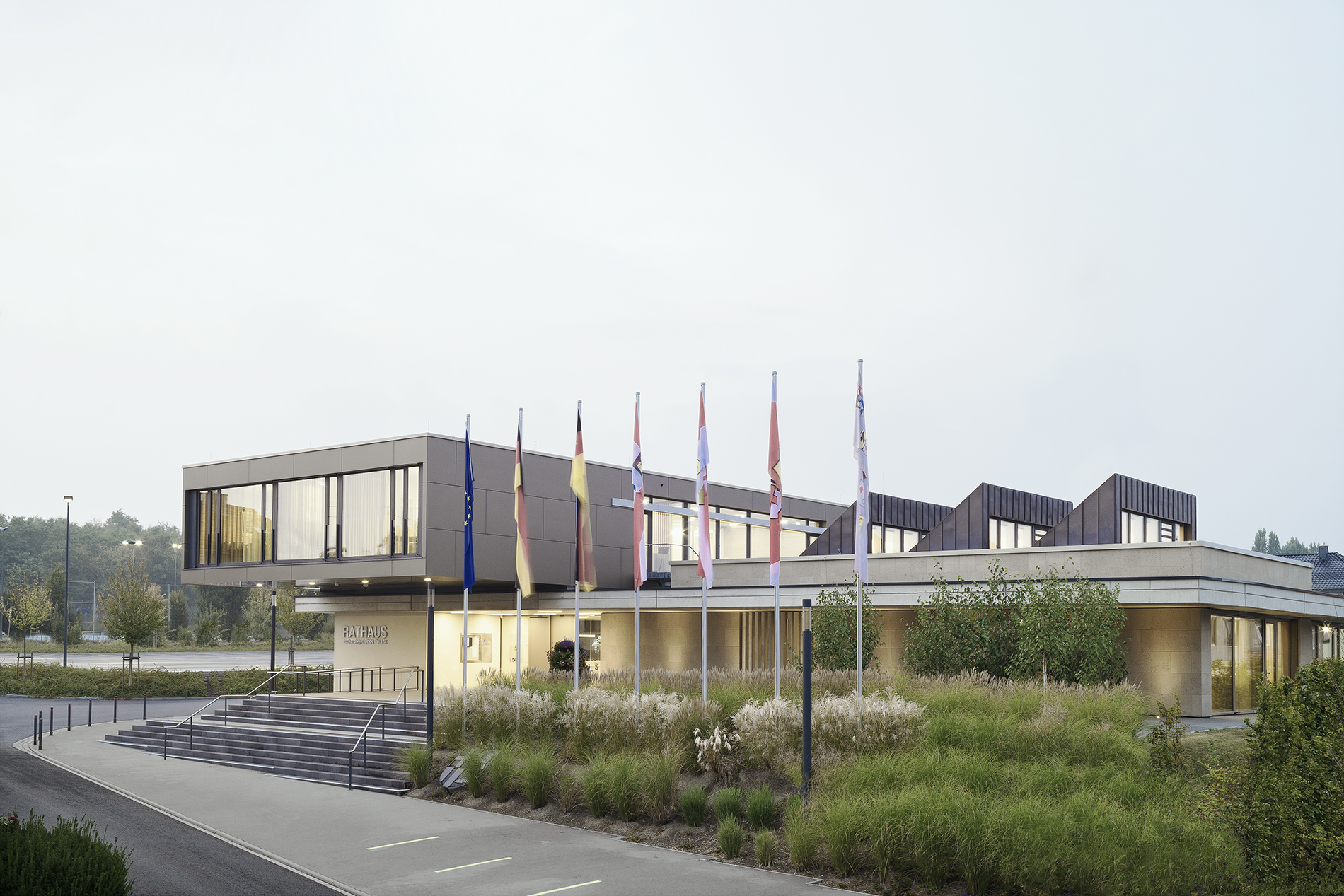 Das neue Rathaus der Verbandsgemeinde Pellenz ist von weither sichtbar und gestaltprägend für die Schnittstelle zwischen Gewerbegebiet, Wohngebiet und Innenstadt. Der Neubau gliedert sich in zwei Bauteile: die erdgebundene Sockelzone mit den gemeinschaftlichen Einrichtungen und den publikumsintensiven Büros, die zu einem Innenhof orientiert sind, und einen darüber schwebenden, langgestreckten Baukörper. Die Gliederung des Bauvolumens erzeugt ein differenziertes Erscheinungsbild, das von Offenheit und Transparenz geprägt wird. Eine Dachterrasse schafft zusätzliche Aufenthaltsqualität in der warmen Jahreszeit. Der Ratssaal durchdringt die Dachfläche und erlangt hierdurch eine Höhe, die seiner Funktion und Bedeutung entspricht.
