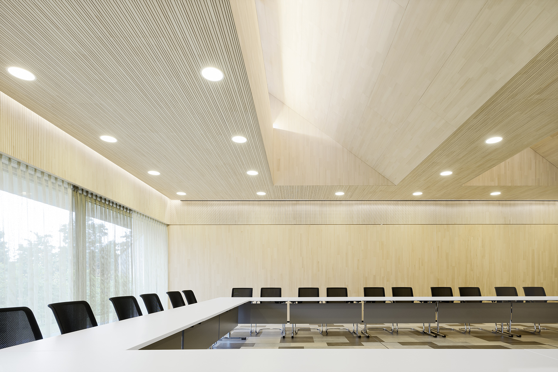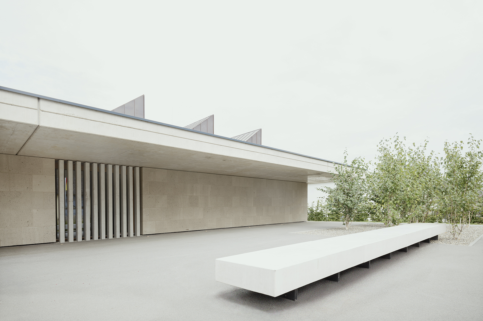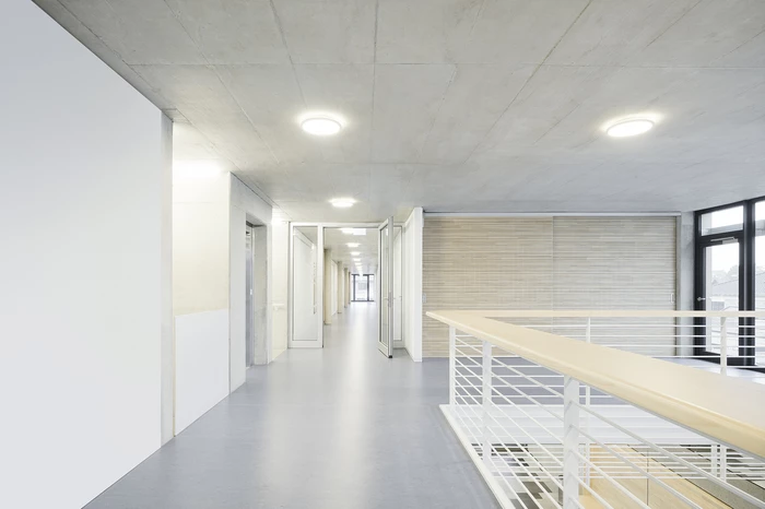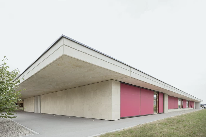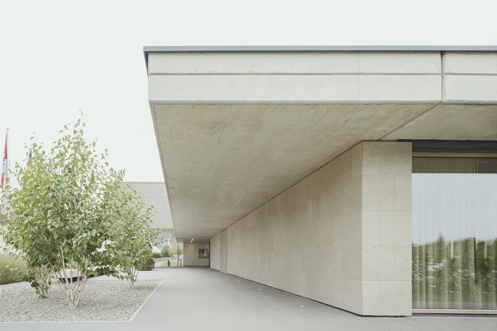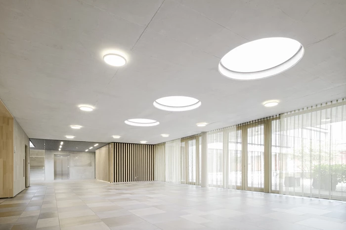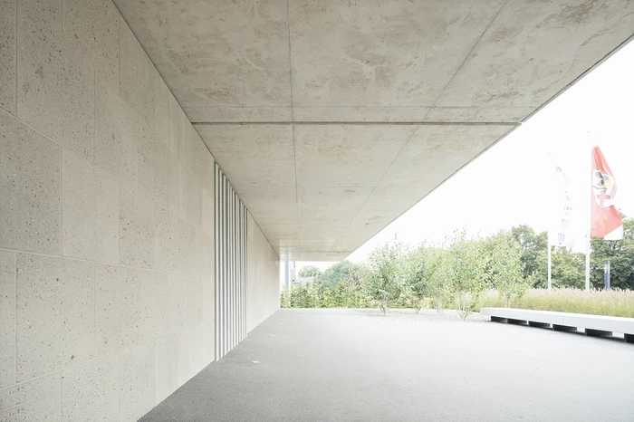 Das neue Rathaus der Verbandsgemeinde Pellenz ist von weither sichtbar und gestaltprägend für die Schnittstelle zwischen Gewerbegebiet, Wohngebiet und Innenstadt. Der Neubau gliedert sich in zwei Bauteile: die erdgebundene Sockelzone mit den gemeinschaftlichen Einrichtungen und den publikumsintensiven Büros, die zu einem Innenhof orientiert sind, und einen darüber schwebenden, langgestreckten Baukörper. Die Gliederung des Bauvolumens erzeugt ein differenziertes Erscheinungsbild, das von Offenheit und Transparenz geprägt wird. Eine Dachterrasse schafft zusätzliche Aufenthaltsqualität in der warmen Jahreszeit. Der Ratssaal durchdringt die Dachfläche und erlangt hierdurch eine Höhe, die seiner Funktion und Bedeutung entspricht.