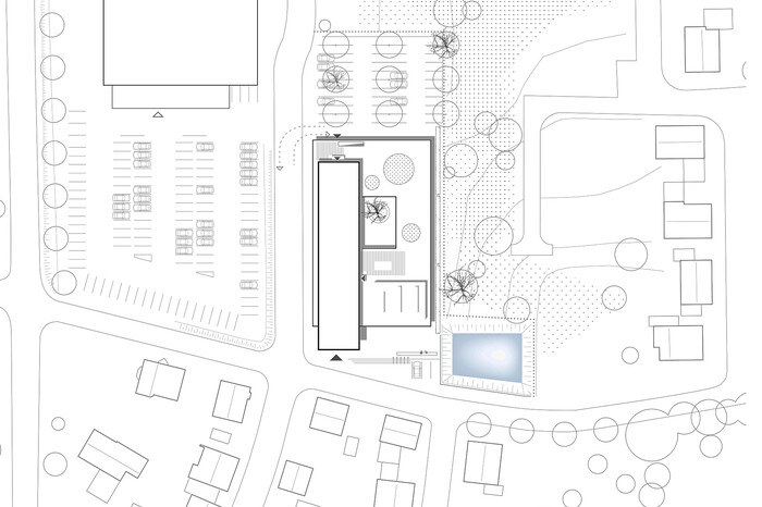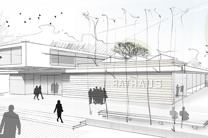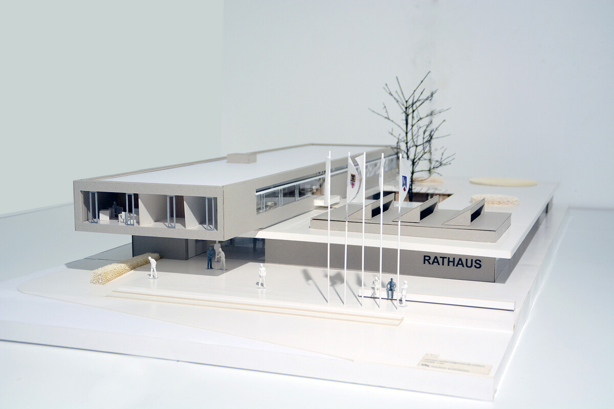 Das Rathaus ist von weit her sichtbar und daher gestaltprägend für die Schnittstelle zwischen Gewerbegebiet, Wohngebiet und Innenstadt. Es gliedert sich im Wesentlichen in zwei Bauteile - in die erdgebundene Sockelzone mit den gemeinschaftlichen Einrichtungen und den publikumsintensiven Büros, und einen darüber schwebenden, langgestreckten Baukörper, der Vorstand, Finanzen und die zentralen Dienste beherbergt. Eine Dachterrasse schafft zusätzliche Aufenthaltsqualität in der warmen Jahreszeit. Der Ratssaal durchdringt die Dachfläche und erlangt hierdurch eine Höhe, die seiner Funktion und Bedeutung entspricht.