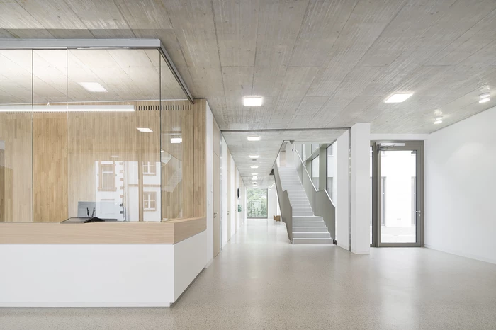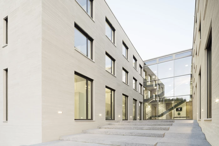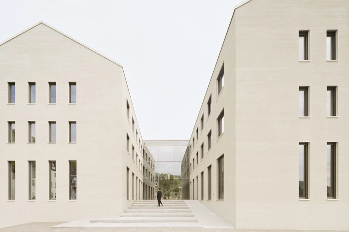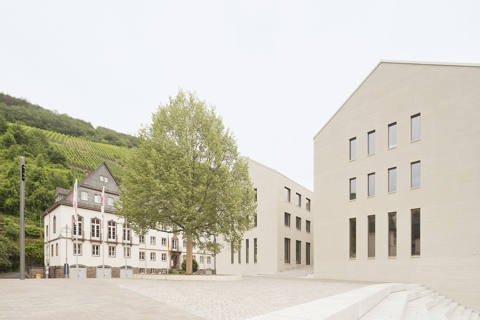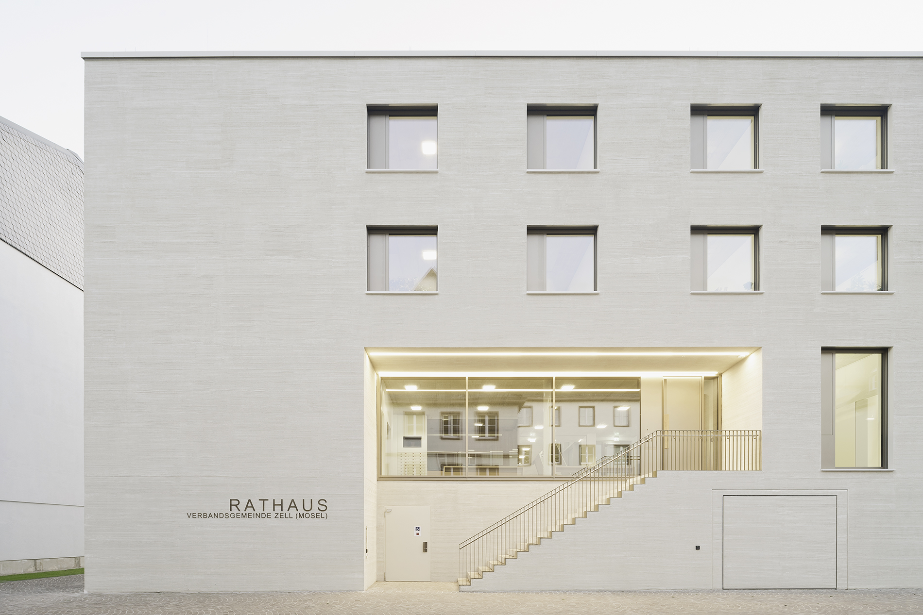 Durch die Gliederung des Bauvolumens in zwei klar ablesbare Baukörper fügt sich der Neubau der Verbandsgemeindeverwaltung Zell harmonisch in den historischen, kleinteiligen Altstadtbereich und das bestehende Stadtbild ein. Die Staffelung der Baukörper unterstützt die Blickachse vom markanten Bau des Finanzamtes zum Moselufer. Die Baukörper generieren einen Hof, der sich zum Platz hin öffnet und mit dieser einladenden Geste ein „offenes“ Haus signalisiert.
