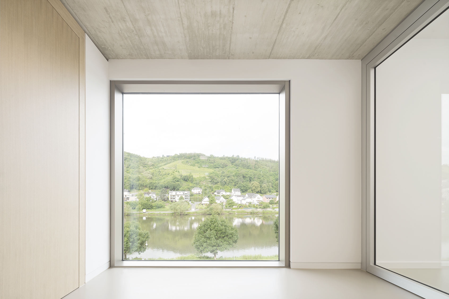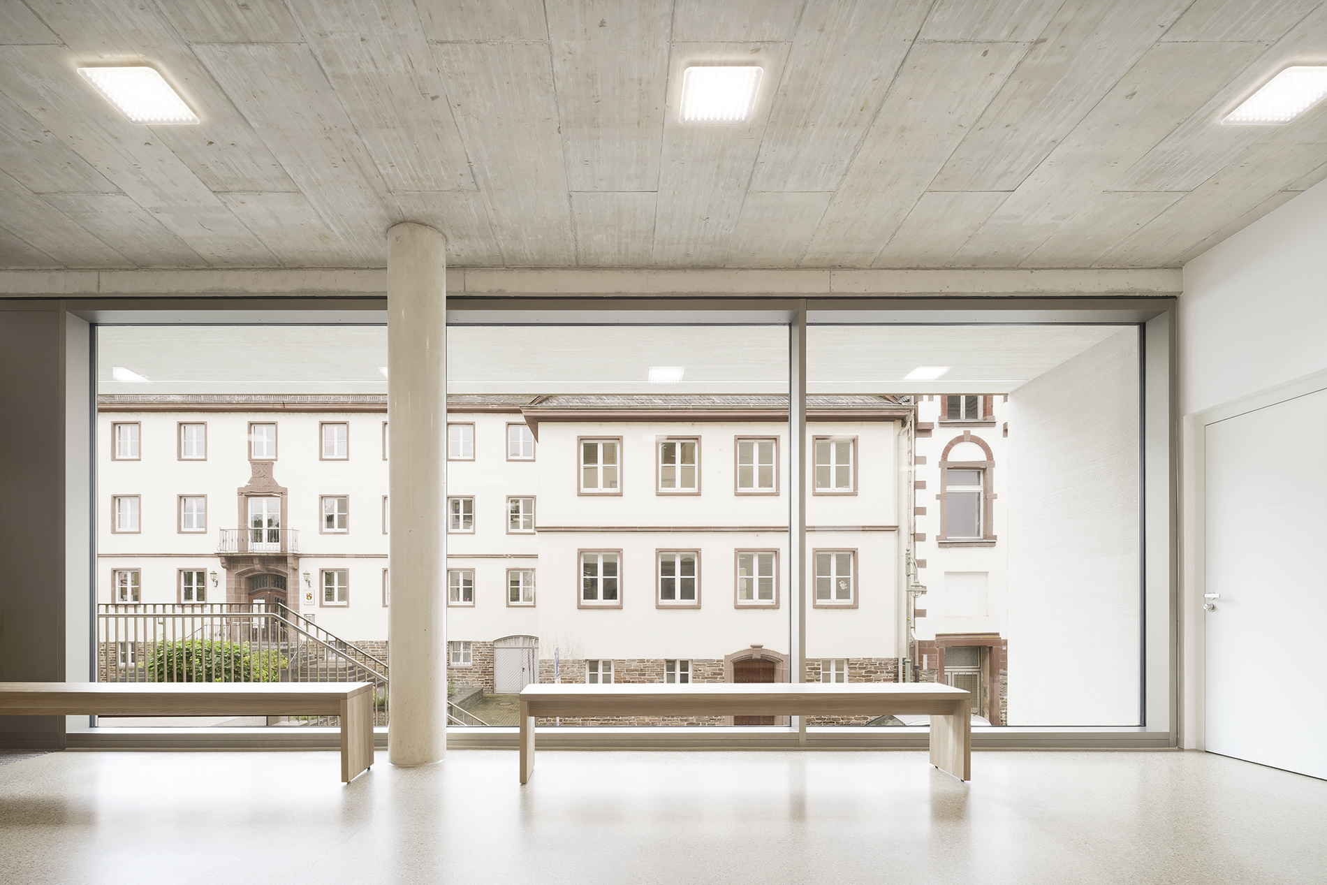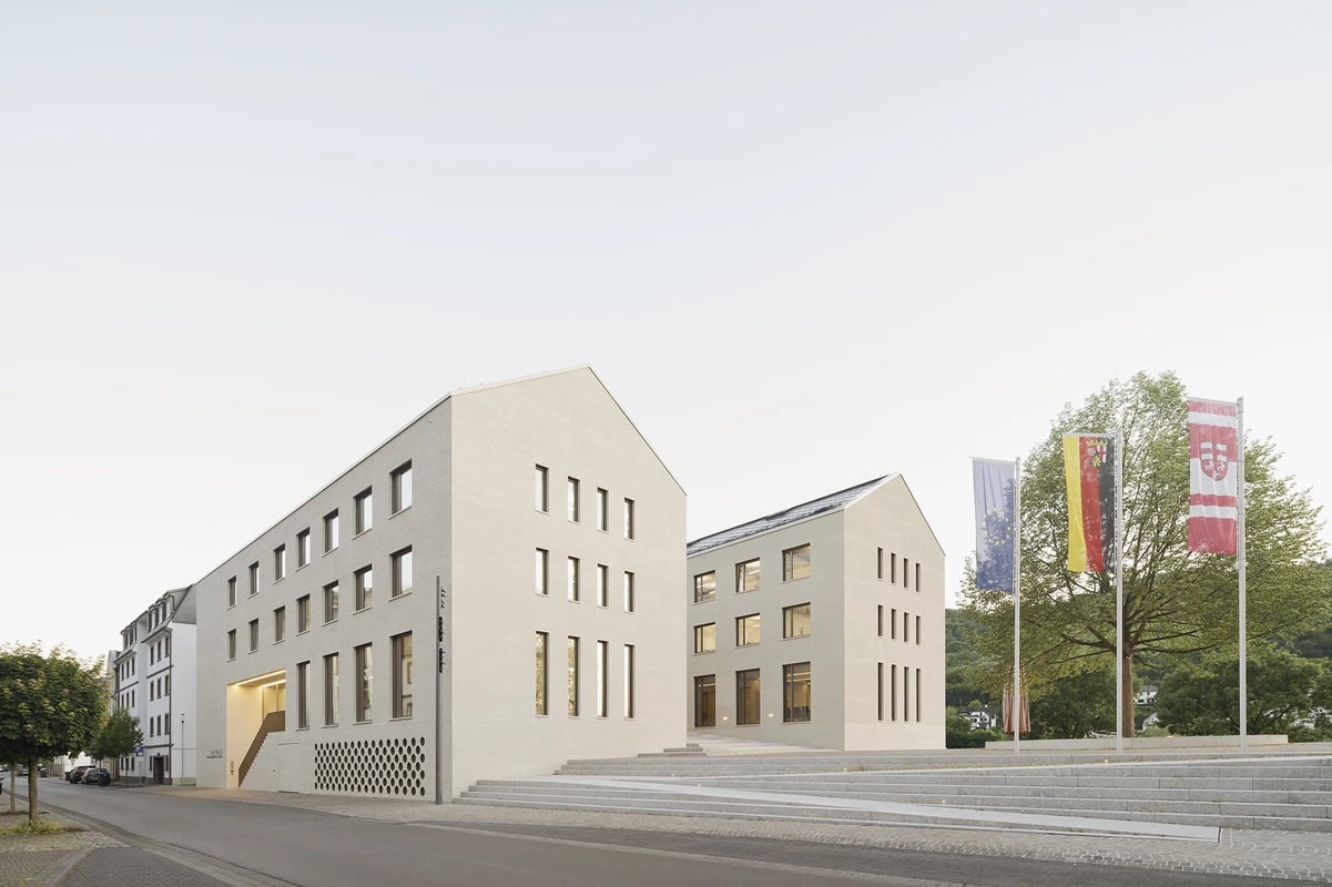 Von der Schlossstraße und der Parkgarage aus stellt ein gemeinsamer Aufzug den barrierefreien Zugang des Neubaus sicher. Alternativ ist die Erschließung mittels Rampen über den Rathausplatz möglich. Beide Zugänge erschließen das zentrale Foyer. Sowohl das Gebäude als auch der Platz erfahren durch die alternativen Zugangsmöglichkeiten eine Aufwertung. Die Fassaden reagieren auf die jeweiligen stadträumlichen Gegebenheiten: traufständige Ausrichtung zur Schlossstraße und zum Moselufer, giebelständige zum Rathausplatz. Fassaden und Dacheindeckungen werden mit regionalen Materialien gestaltet.