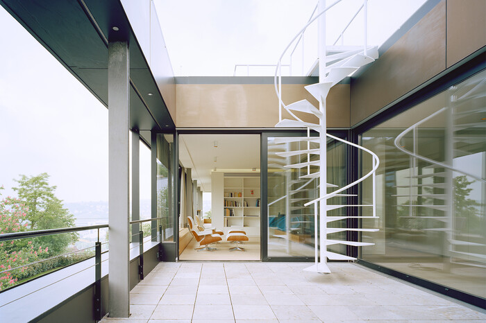 Der Umbau nimmt die klaren architektonischen Elemente und Prinzipien auf, interpretiert diese und setzt sie in einen neuen, zeitgemäßen architektonischen Kontext um. Die klassische Zweiteilung des Baukörpers in Gebäuderiegel und Sockel bleibt erhalten. Auch die Material- und Farbwahl wird übernommen. Die zwei Obergeschosse erhalten eine energetisch hochwertige Metall-Glas-Fassade. Fensterprofile und Öffnungsflügel sind dunkel eloxiert, um optisch Teil des Glasbandes zu werden. Die eloxierten Metallbrüstungsbänder sind heller, bräunlich changierend gehalten. Sie unterstreichen den liegenden Charakter der beiden Obergeschosse. Die räumlich-funktionale Aufteilung sieht den Wohnbereich im 2. Obergeschoss und die Büros in den Etagen darunter vor.