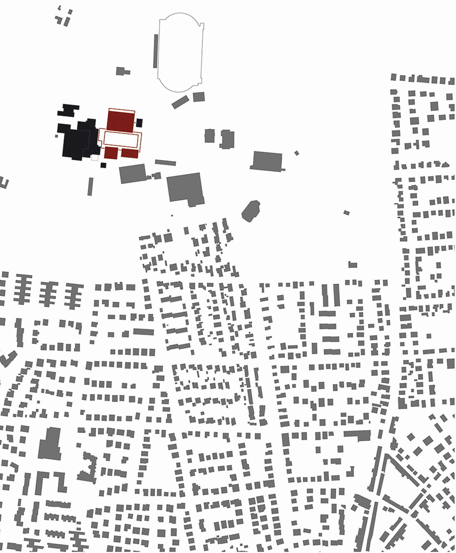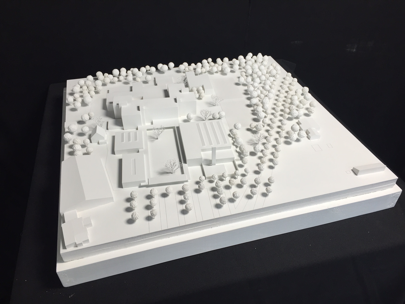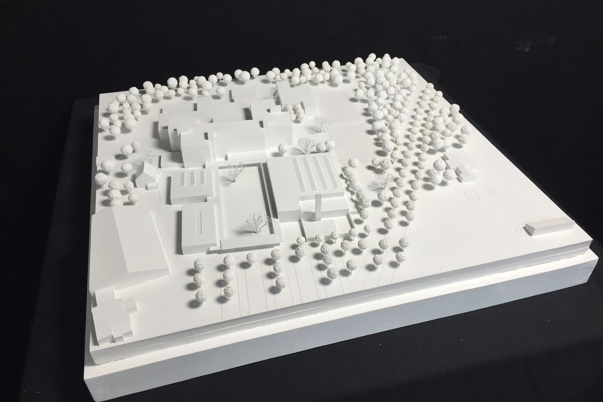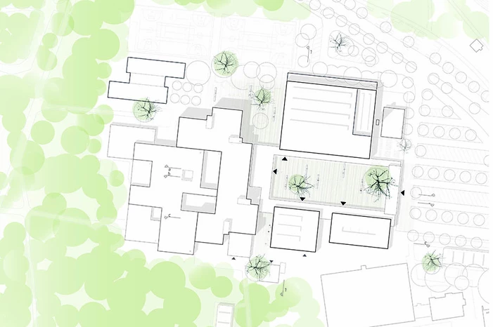 Die drei neu zu planenden Gebäude – Mensa, Ganztagesbetreuung und Sporthalle - sind als Einzelbaukörper konzipiert, bilden aber durch ihre Lage und Orientierung zusammen mit dem vorhandenen Schulgebäude ein Gebäudeensemble. Der zentral gelegene, umlaufend überdachte Schulhof bildet die gemeinsame Mitte.