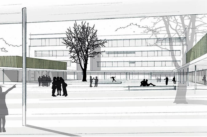 Die Freianlagen formen den Schulstandort zu einer zukunftsorientierten Campus-Landschaft, die sich außenräumlich in den Kontext einfügt, sich aber auch gleichermaßen durch die Bildung einer verbindenden neuen Mitte als „Ruhepol mit Ausstrahlung“ darstellt. Die Bebauung definiert Eingänge, Durchgänge und Verbindungen, wodurch differenzierte Freiflächen und räumlich definierte Nachbarschaften entstehen.