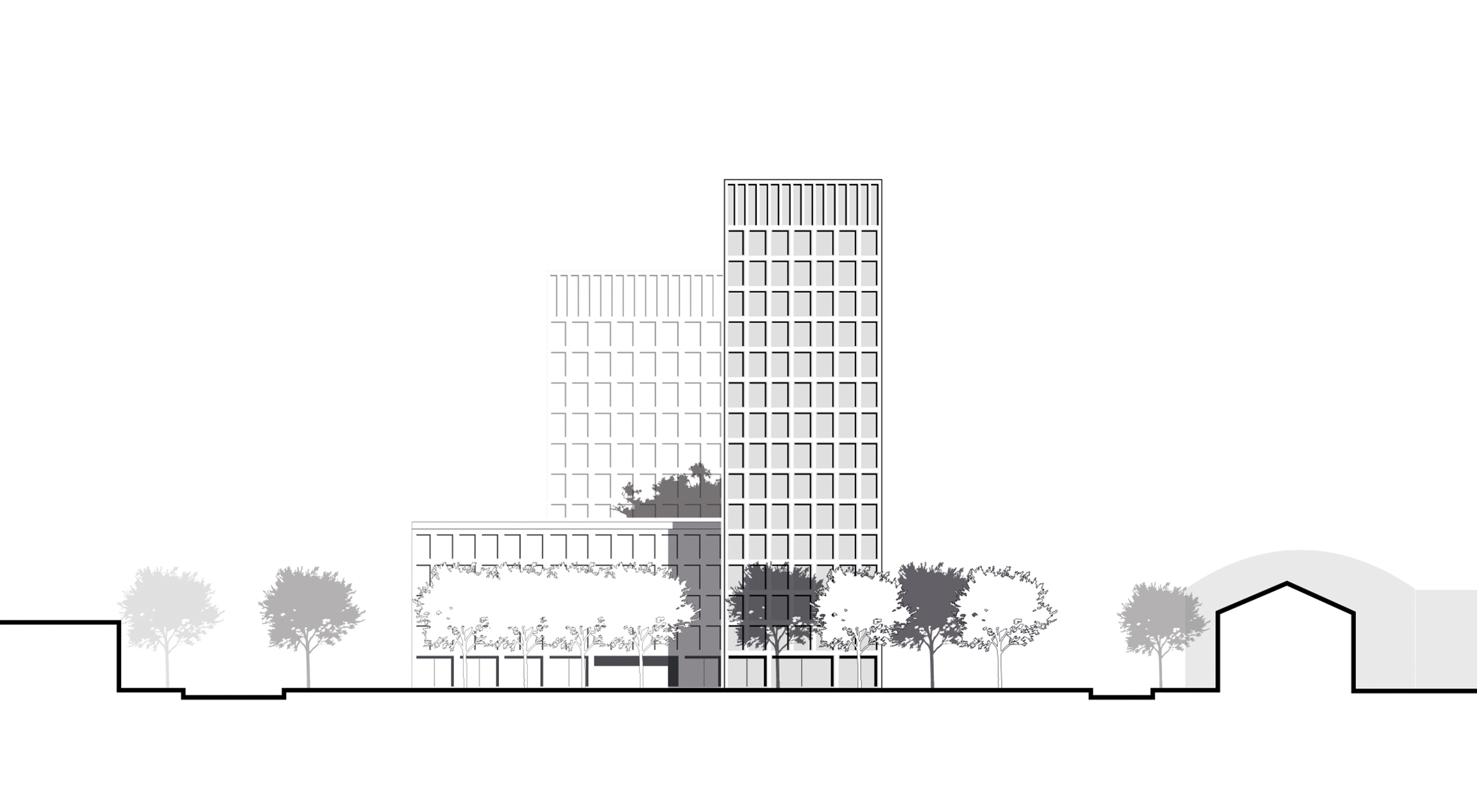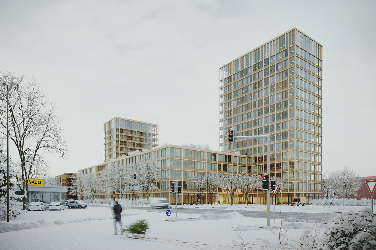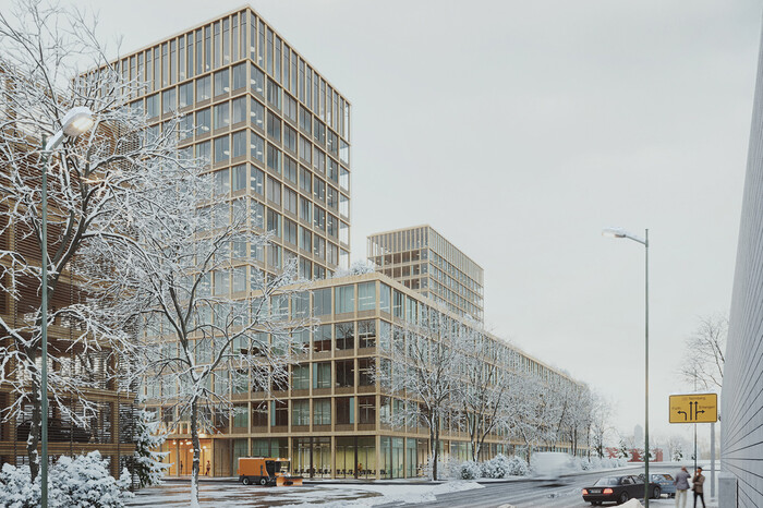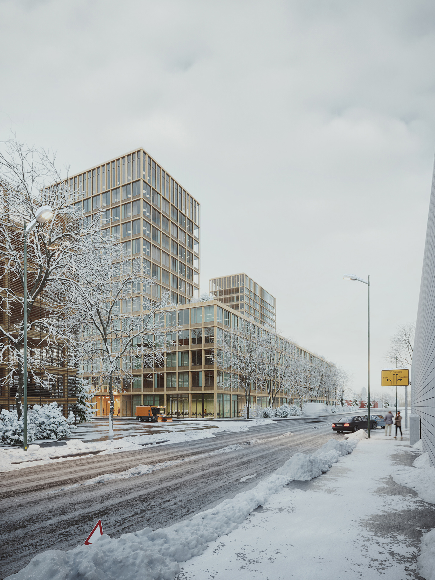 Der Entwurf sieht im südlichen Teil des Plangebiets ein differenziert ausformuliertes Gebäudeensemble vor, das nördlich der Planstraße E durch eine Hochgarage ergänzt wird, die einen harmonischen, integrativen Übergang zum Neubau der Bundespolizei schafft. Mit der neuen Bebauung gelingt es durch das Aufnehmen von Baufluchten und Gebäudehöhen entlang der Okenstraße klare Raumkanten und damit einen klaren Straßenraum zu definieren. Markante, stadtbildprägende Akzente setzen die beiden Hochpunkte, die sich sozusagen in „zweiter Reihe“ entwickeln und vorhandene Blickbeziehungen auf die Stadtsilhouette berücksichtigen. Die kompakte Bauweise und eine angemessene Dichte tragen sowohl der Wirtschaftlichkeit als auch des begrenzt zur Verfügung stehenden Bodens Rechnung. Die Gebäudekonfiguration mit ihren autarken Erschließungssystemen ermöglicht eine abschnittsweise Realisierung bzw. Umsetzung einzelner Gebäudeteile durch unterschiedliche Akteure.