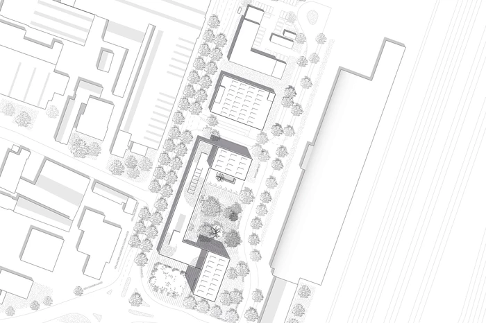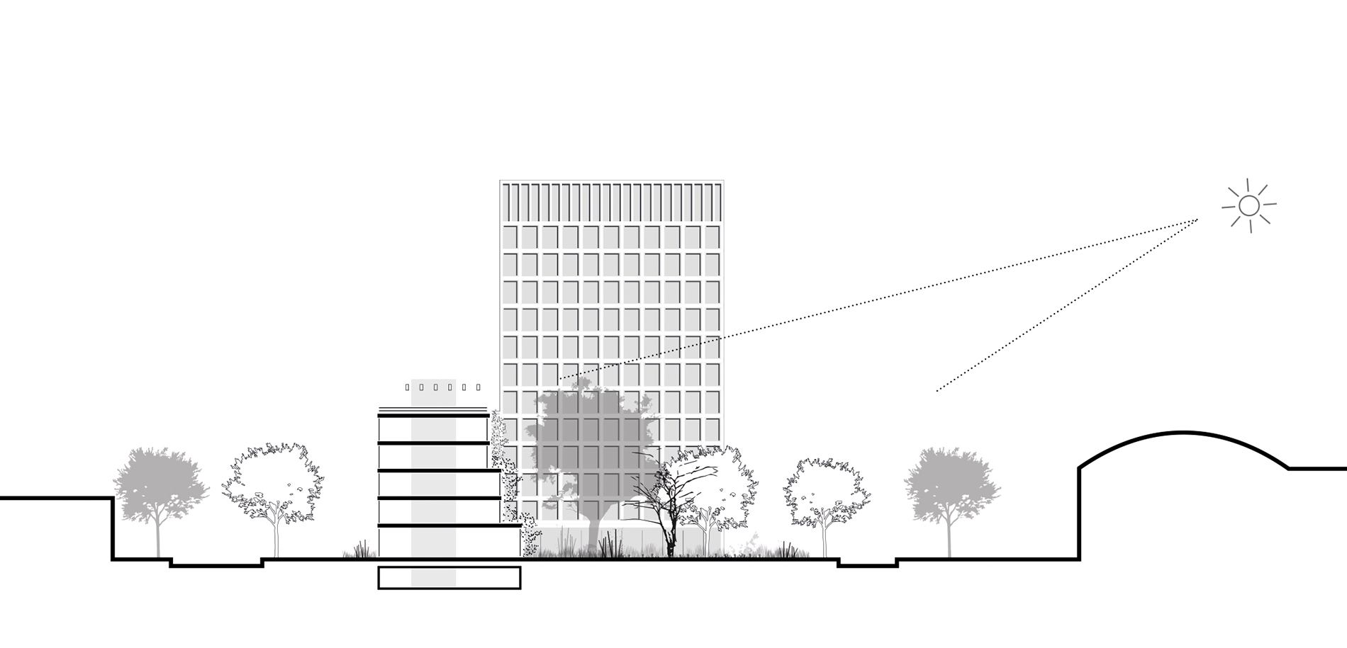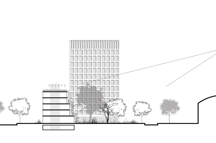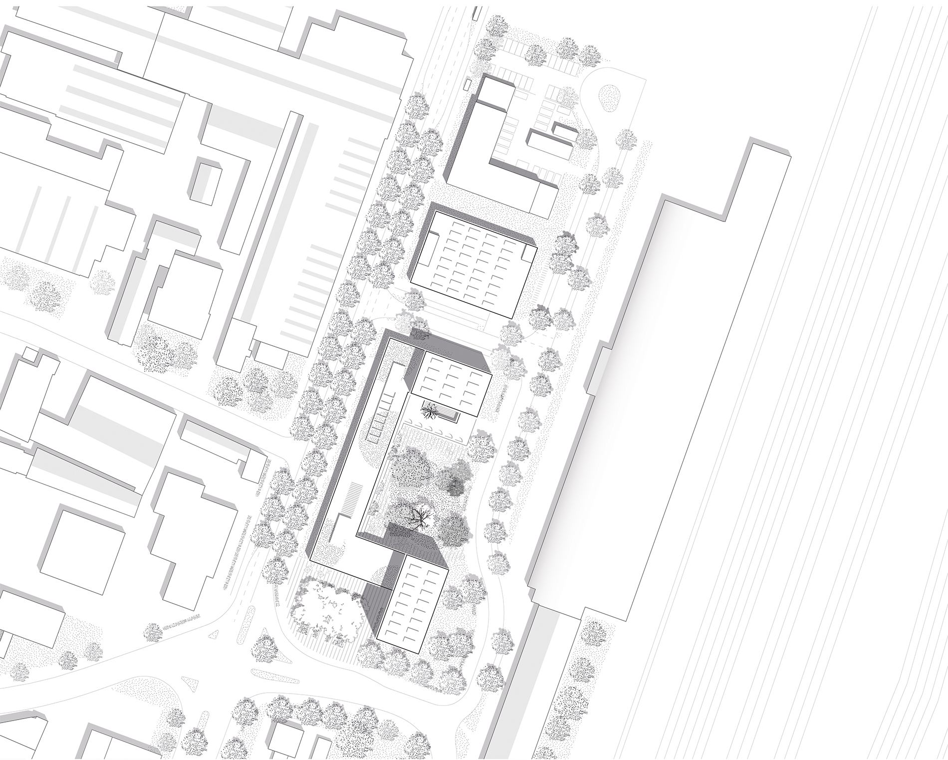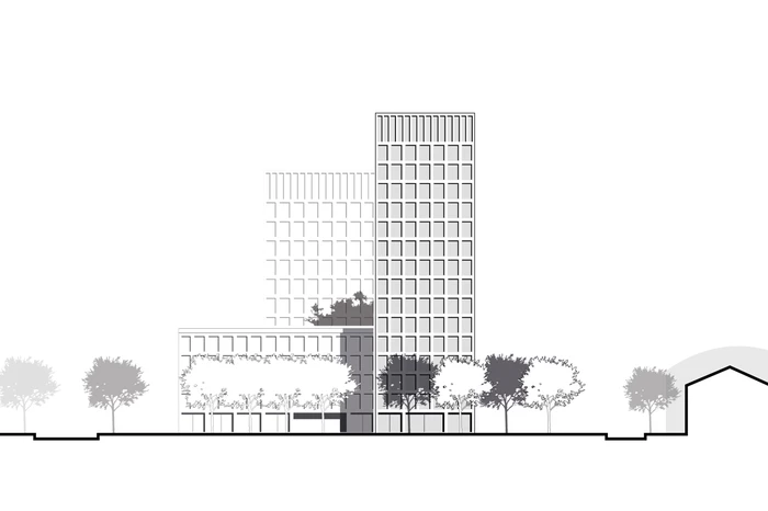 Der Entwurf sieht im südlichen Teil des Plangebiets ein differenziert ausformuliertes Gebäudeensemble vor, das nördlich der Planstraße E durch eine Hochgarage ergänzt wird, die einen harmonischen, integrativen Übergang zum Neubau der Bundespolizei schafft. Mit der neuen Bebauung gelingt es durch das Aufnehmen von Baufluchten und Gebäudehöhen entlang der Okenstraße klare Raumkanten und damit einen klaren Straßenraum zu definieren. Markante, stadtbildprägende Akzente setzen die beiden Hochpunkte, die sich sozusagen in „zweiter Reihe“ entwickeln und vorhandene Blickbeziehungen auf die Stadtsilhouette berücksichtigen. Die kompakte Bauweise und eine angemessene Dichte tragen sowohl der Wirtschaftlichkeit als auch des begrenzt zur Verfügung stehenden Bodens Rechnung. Die Gebäudekonfiguration mit ihren autarken Erschließungssystemen ermöglicht eine abschnittsweise Realisierung bzw. Umsetzung einzelner Gebäudeteile durch unterschiedliche Akteure.