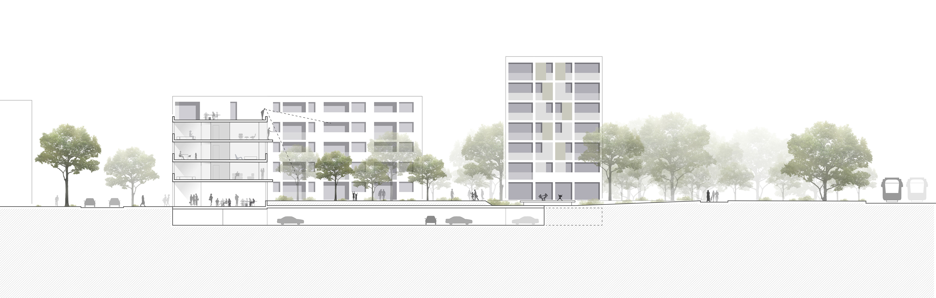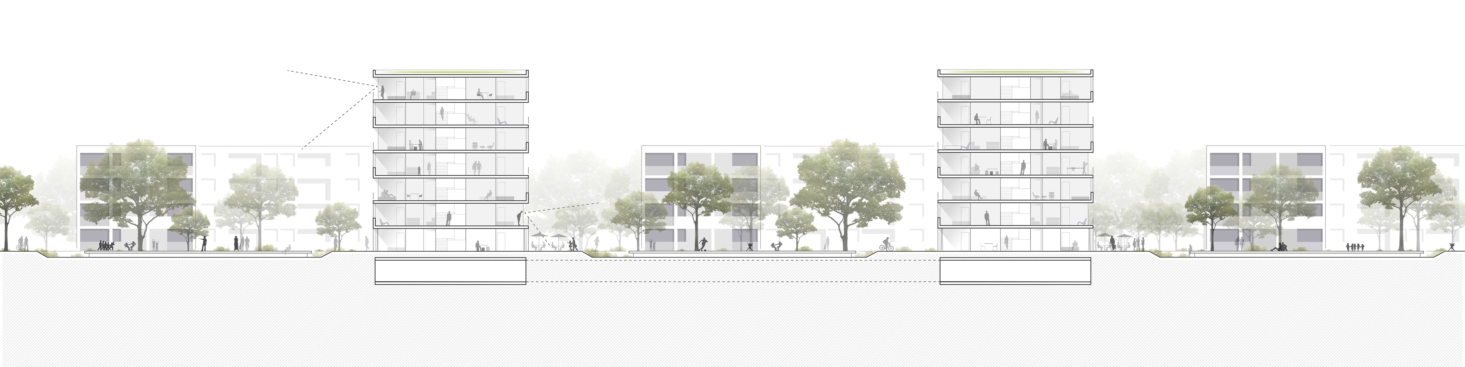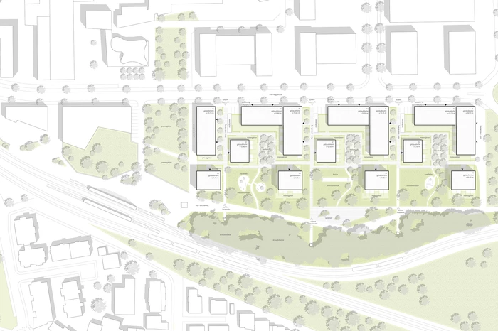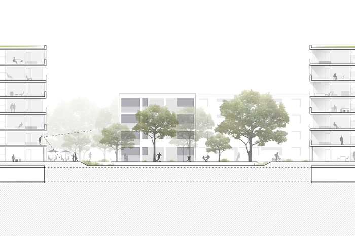 Durch die Positionierung der Gebäudekörper entsteht ein Innenbereich, der qualifizierte und differenzierte Freiräume generiert, die eine Inbesitznahme durch die zukünftigen Bewohner fördern und Orte der Identifikation und Kommunikation schaffen.