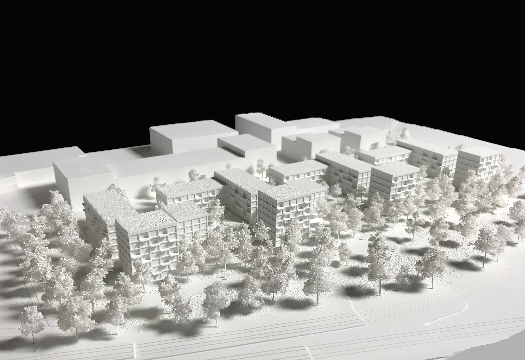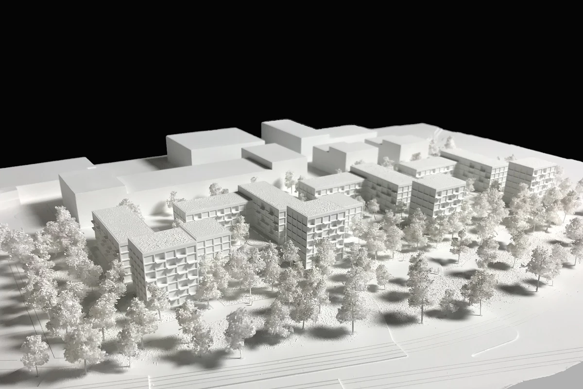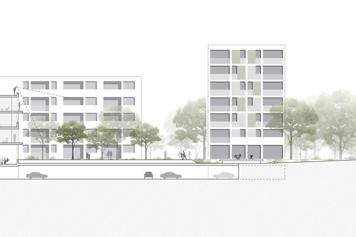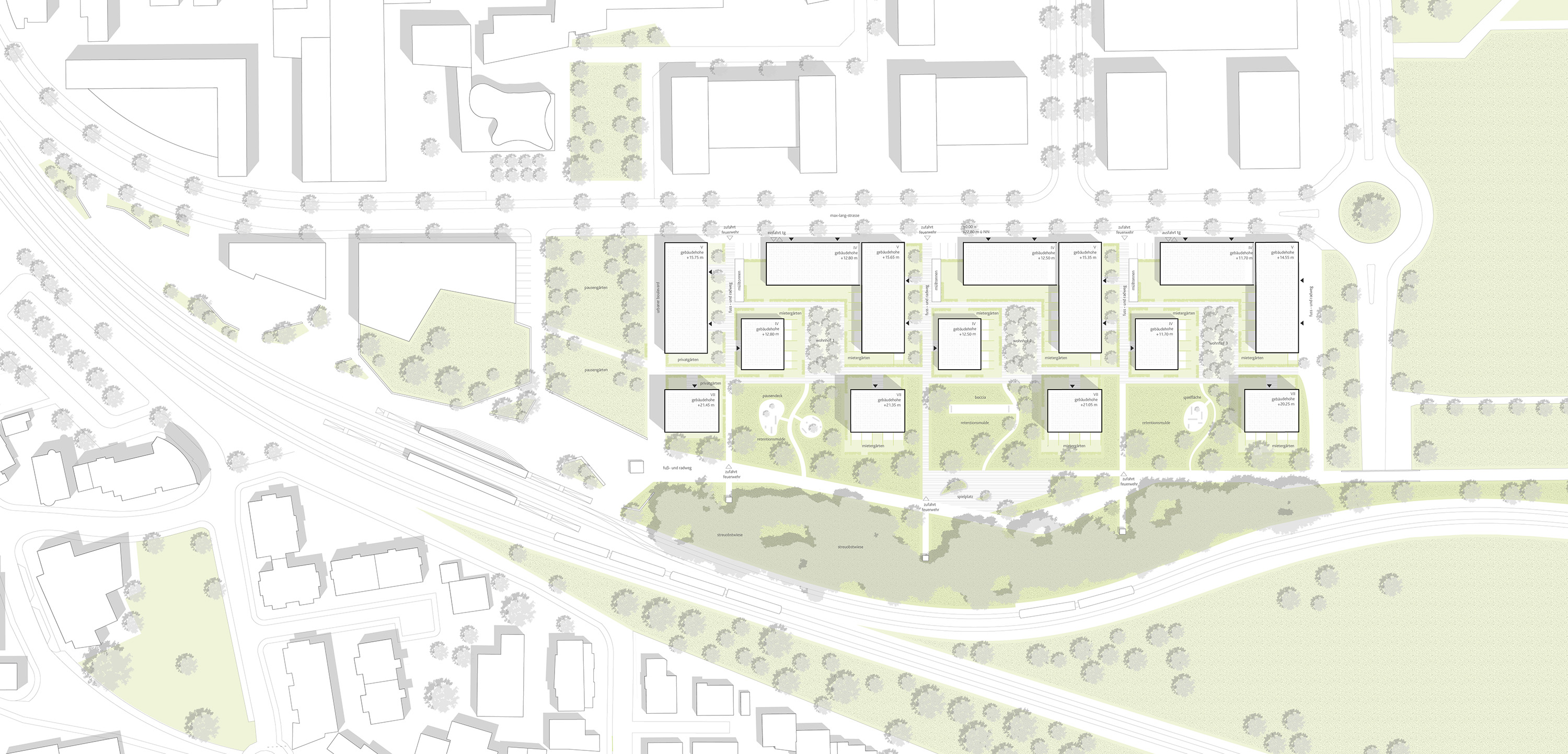 Der Entwurf sieht ein stadträumliches Gebäudeensemble vor, das nach Norden, Osten und Westen klare Raumkanten ausbildet, die das neue Quartier definieren. Vorgesehen ist eine vier- bis fünfgeschossige Bebauung, die sich Richtung Süden in siebengeschossige Punkthäuser auflöst. Entlang der Max-Lang-Straße generiert die Raumkante einen klar definierten Straßenraum, während die südlichen Punkthäuser eine Verzahnung mit dem angrenzenden Grünraum schaffen und ein lebendiges und rhythmisiertes Erscheinungsbild erzeugen.