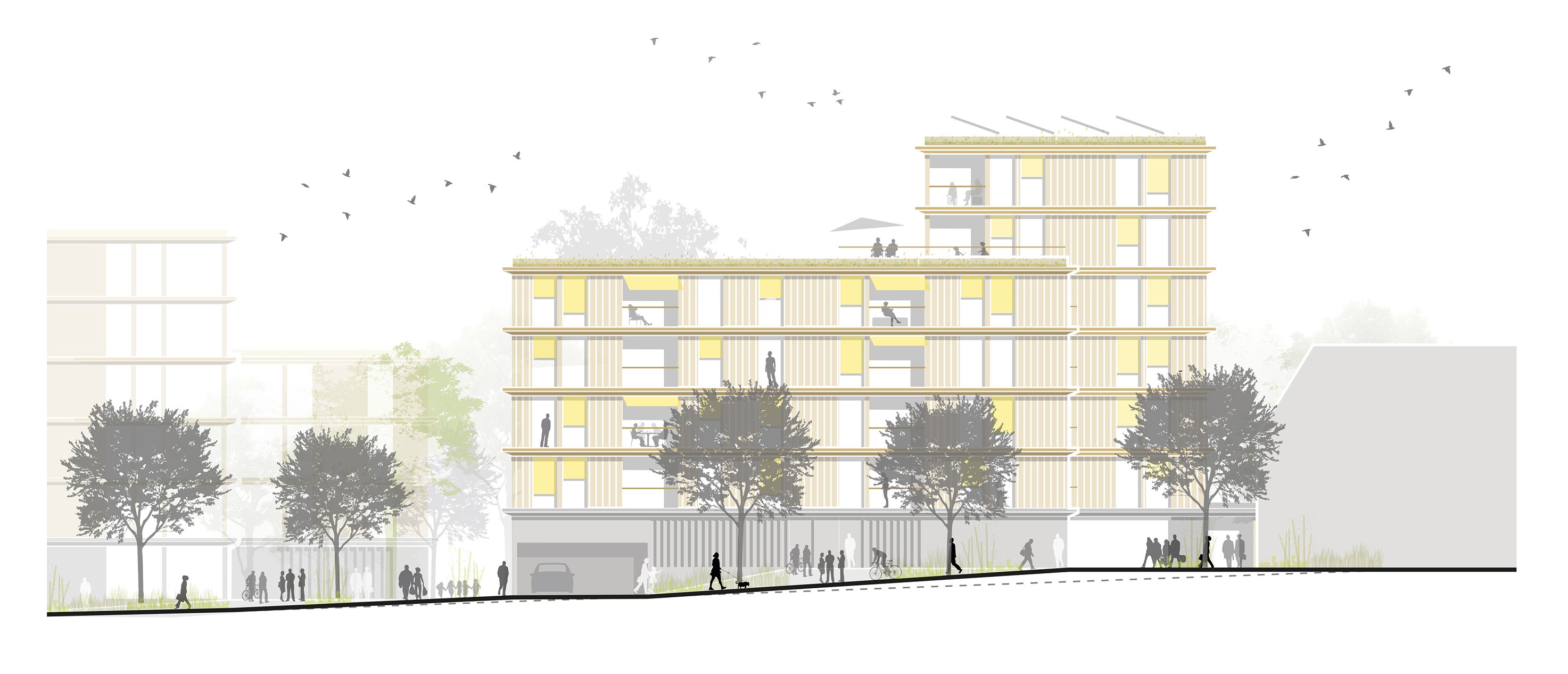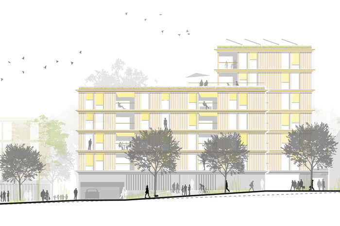 Das „Kettenhaus“ besteht aus vier klar ablesbaren Gebäuden, die durch ein gemeinsames, ökonomisches Erschließungssystem in Form von Laubengängen miteinander verbunden sind. Auf diese Weise entstehen kleine Nachbarschaften und Identität stiftende Einheiten.
