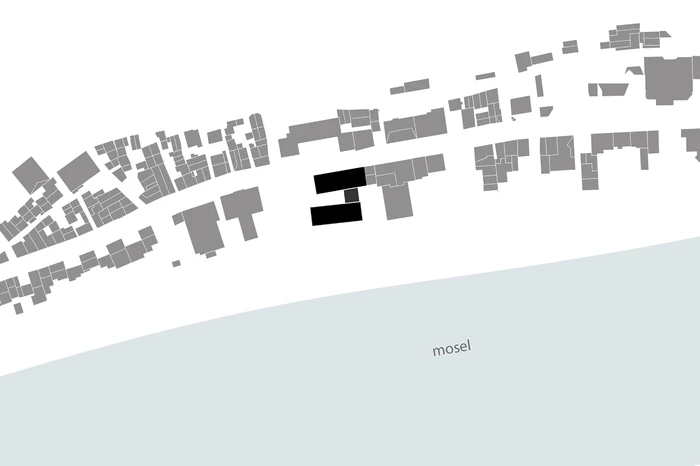 Durch die Gliederung des Bauvolumens in zwei klar ablesbare Baukörper fügt sich der Neubau der Verbandsgemeindeverwaltung Zell harmonisch in den historischen, kleinteiligen Altstadtbereich und das bestehende Stadtbild ein. Die Staffelung der Baukörper unterstützt die Blickachse vom markanten Bau des Finanzamtes zum Moselufer. Die Baukörper generieren einen Hof, der sich zum Platz hin öffnet und mit dieser einladenden Geste ein „offenes“ Haus signalisiert.